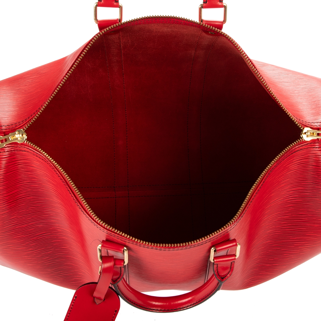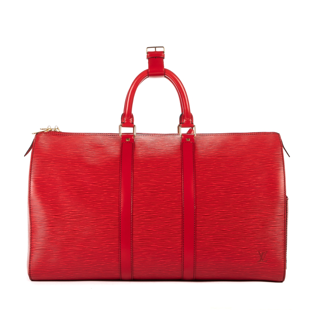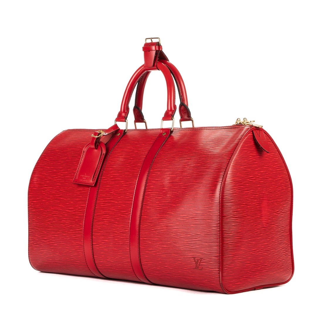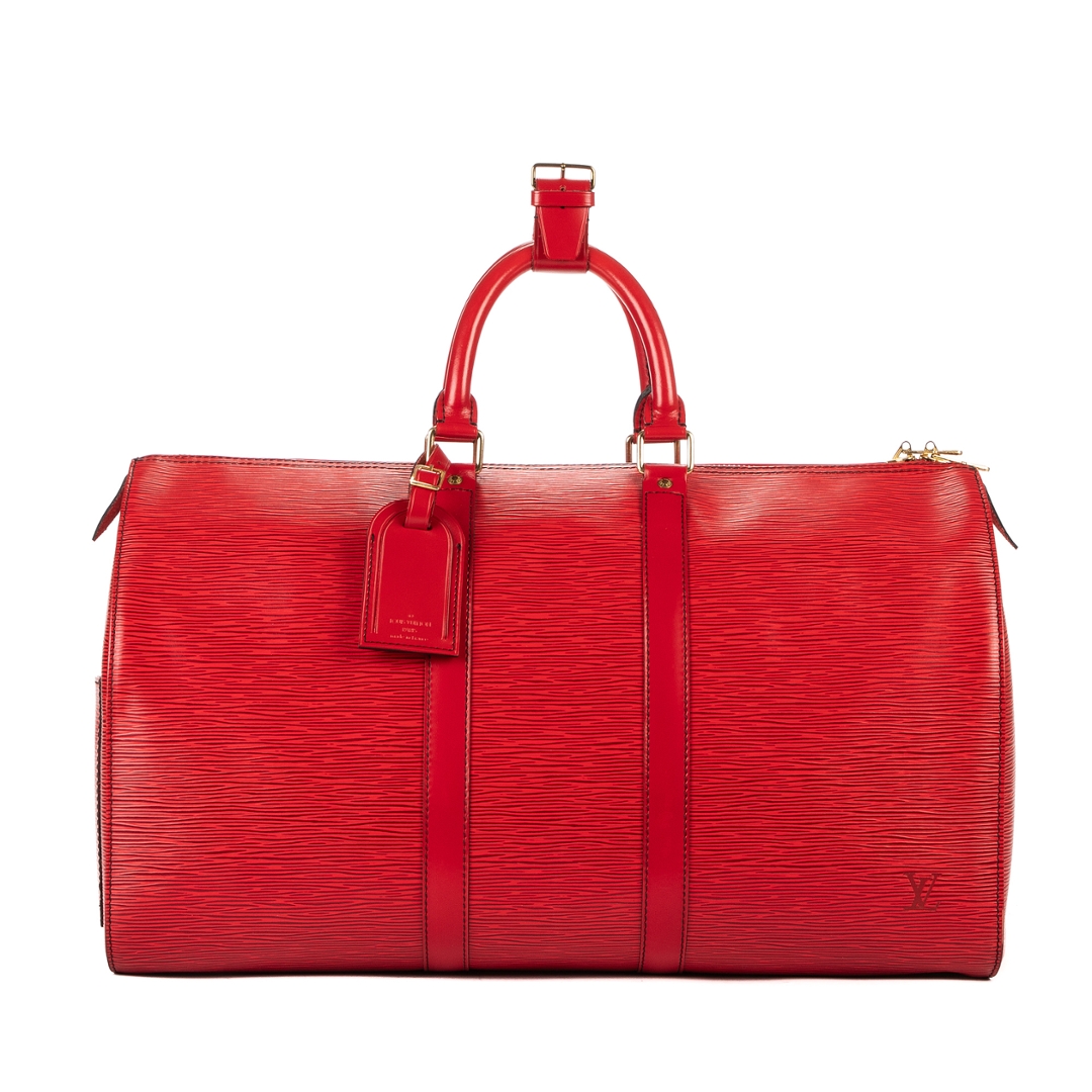 A vintage Louis Vuitton Keepall Black Stitchings bag is a striking embodiment of bold luxury and impeccable craftsmanship. Expertly crafted from red Epi leather, it features a beautifully textured surface with distinctive black stitching that adds a touch of contrast and contemporary edge. The discreet LV embossing at the base and gold-tone hardware elevate its sophisticated aesthetic.