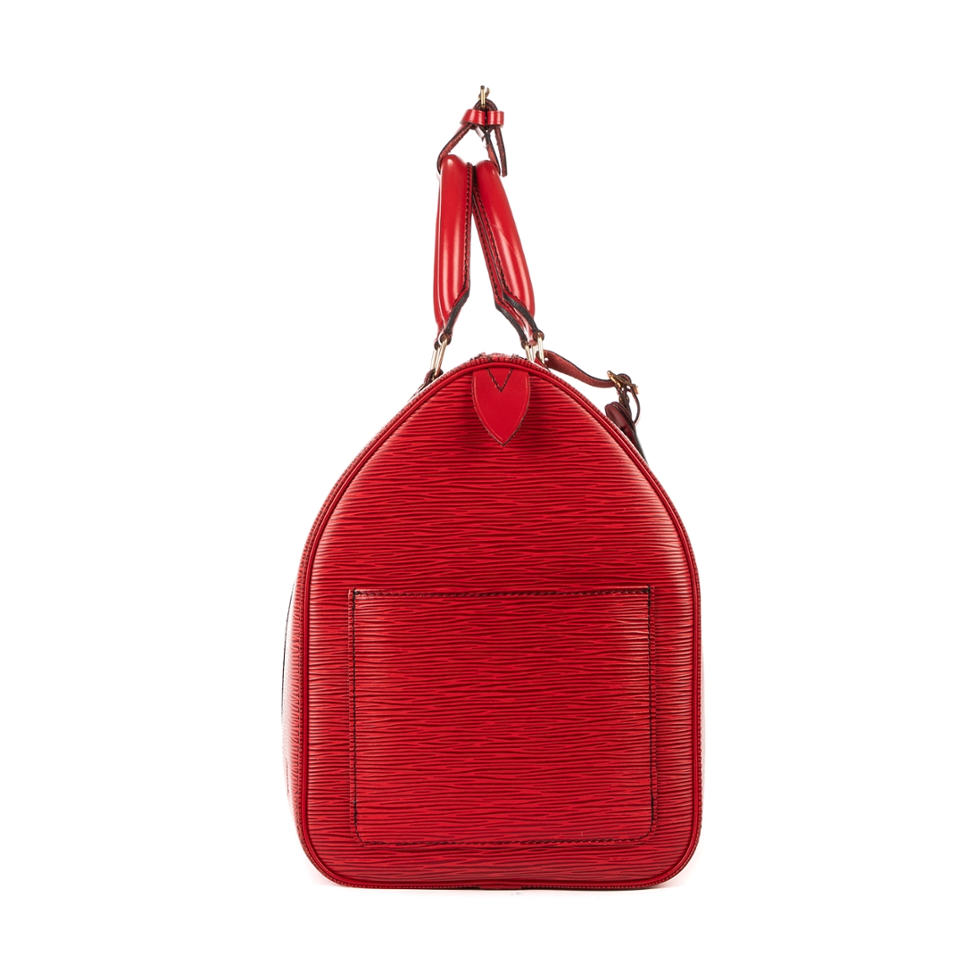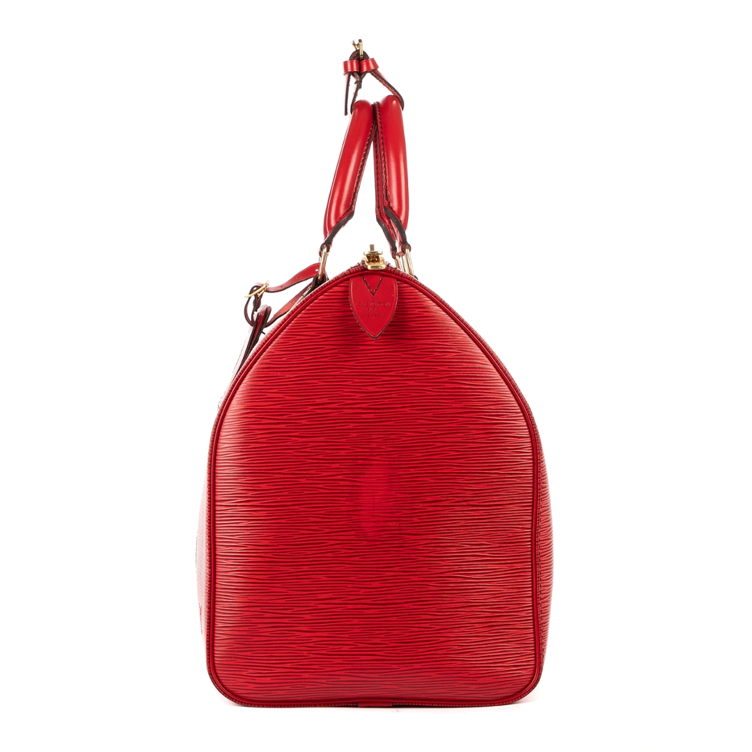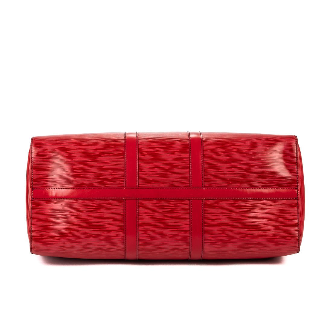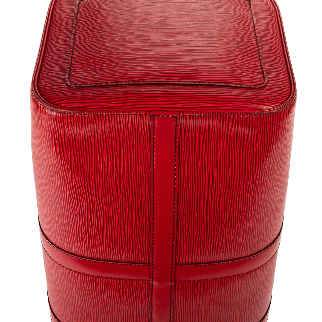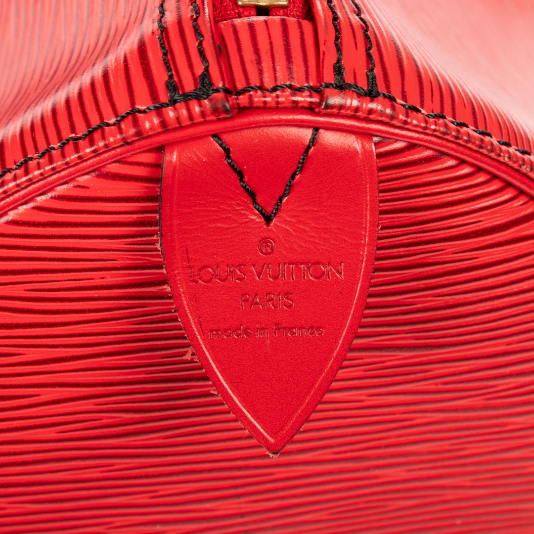 A vintage Louis Vuitton Keepall Black Stitchings bag is a striking embodiment of bold luxury and impeccable craftsmanship. Expertly crafted from red Epi leather, it features a beautifully textured surface with distinctive black stitching that adds a touch of contrast and contemporary edge. The discreet LV embossing at the base and gold-tone hardware elevate its sophisticated aesthetic.