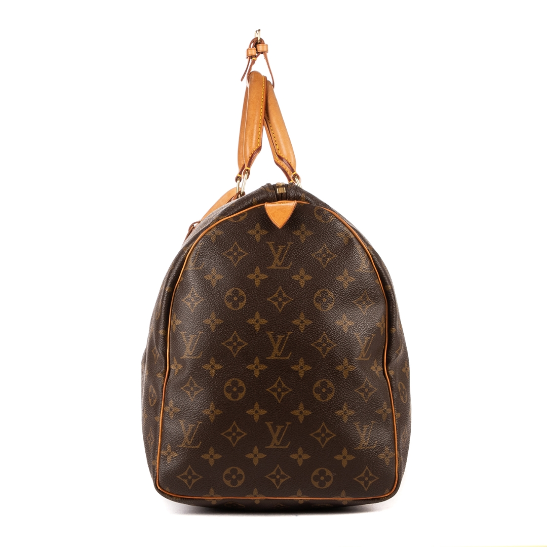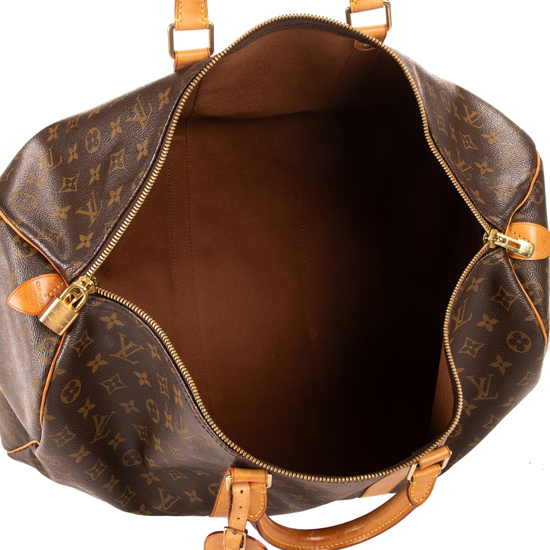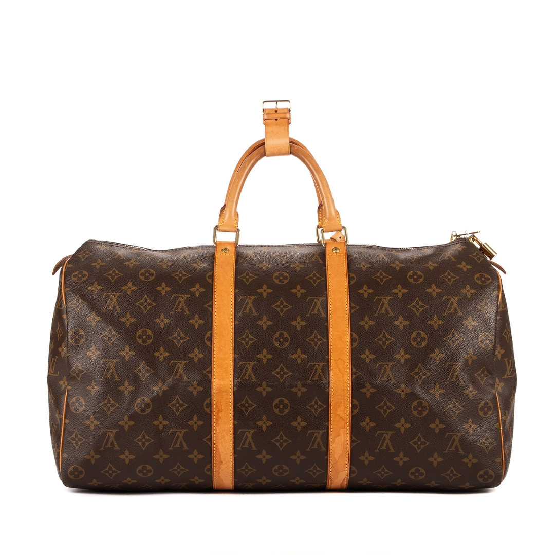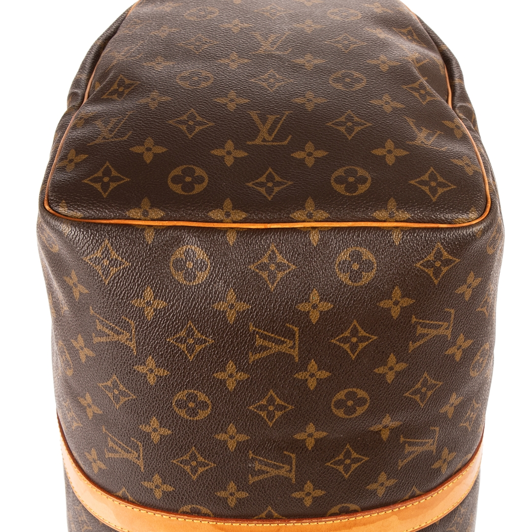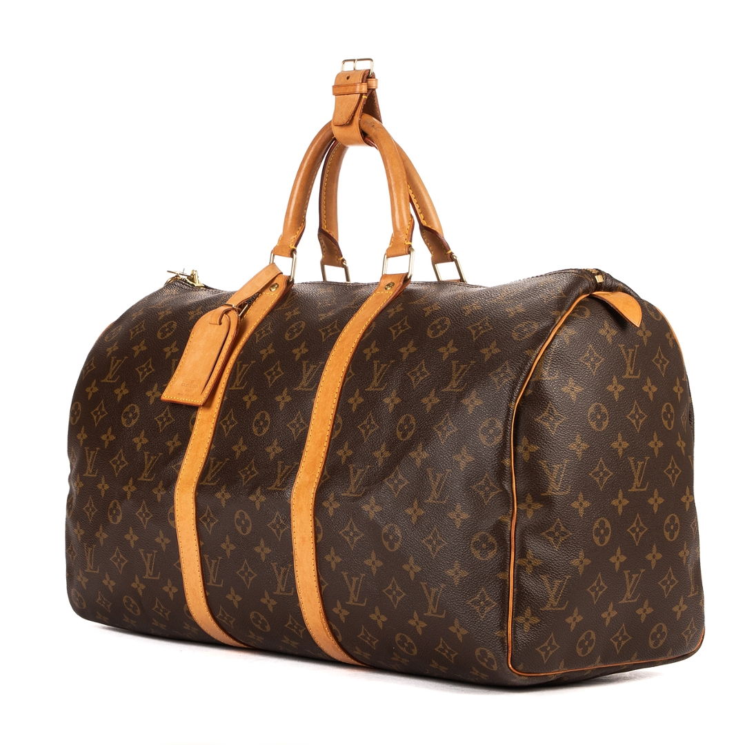 A vintage brown monogram canvas Louis Vuitton Keepall with a certificate of authenticity, Approximately 26cm height, 50cm width.