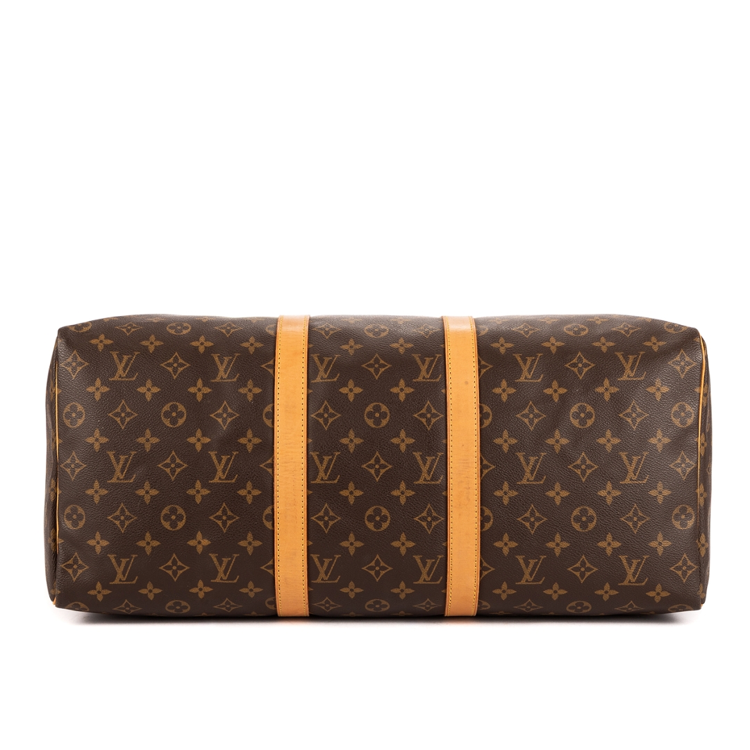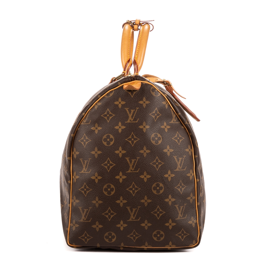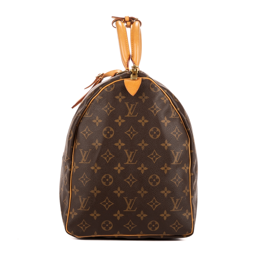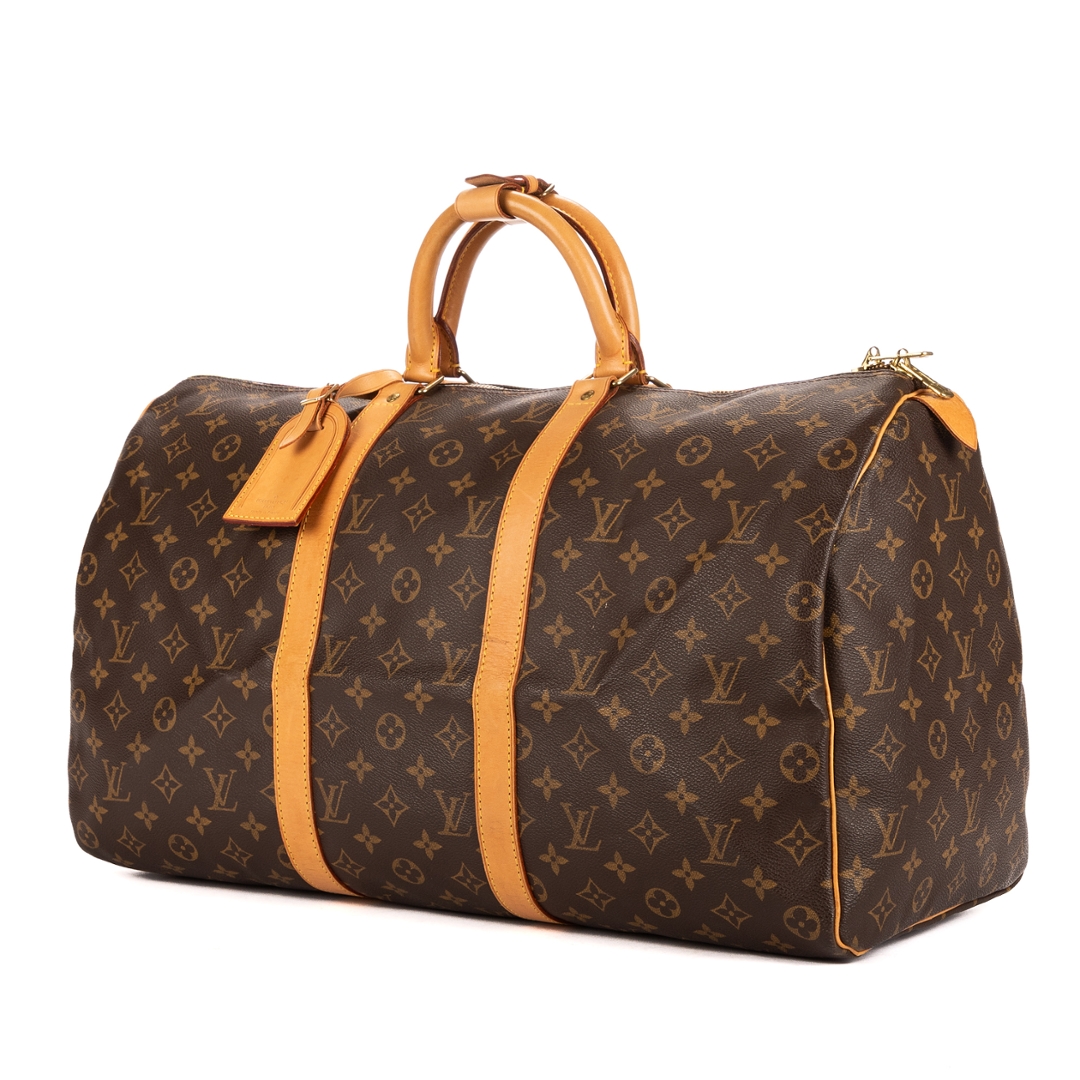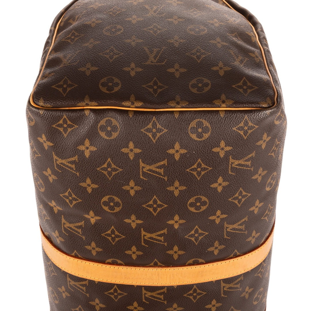 A vintage Louis Vuitton monogram coated canvas Keepall bag with a certificate of authenticity, Approximately 26cm height, 50cm width.