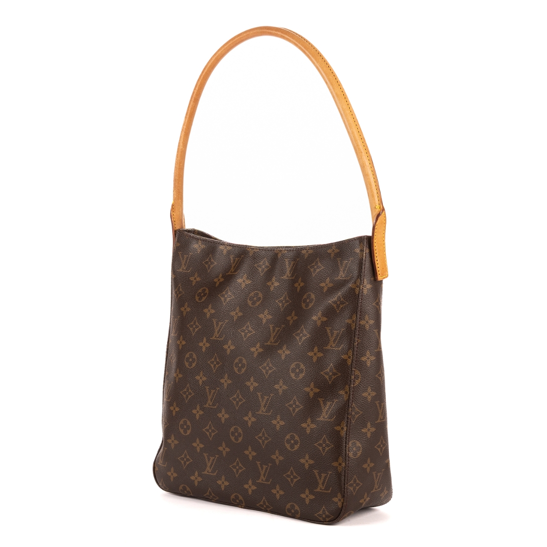 A vintage Louis Vuitton Looping bag crafted in the house’s iconic monogram coated canvas, defined by its clean, minimalist silhouette and signature curved shoulder strap. The structured rectangular body is complemented by natural leather trim, creating a timeless everyday piece that reflects Louis Vuitton’s enduring design heritage.