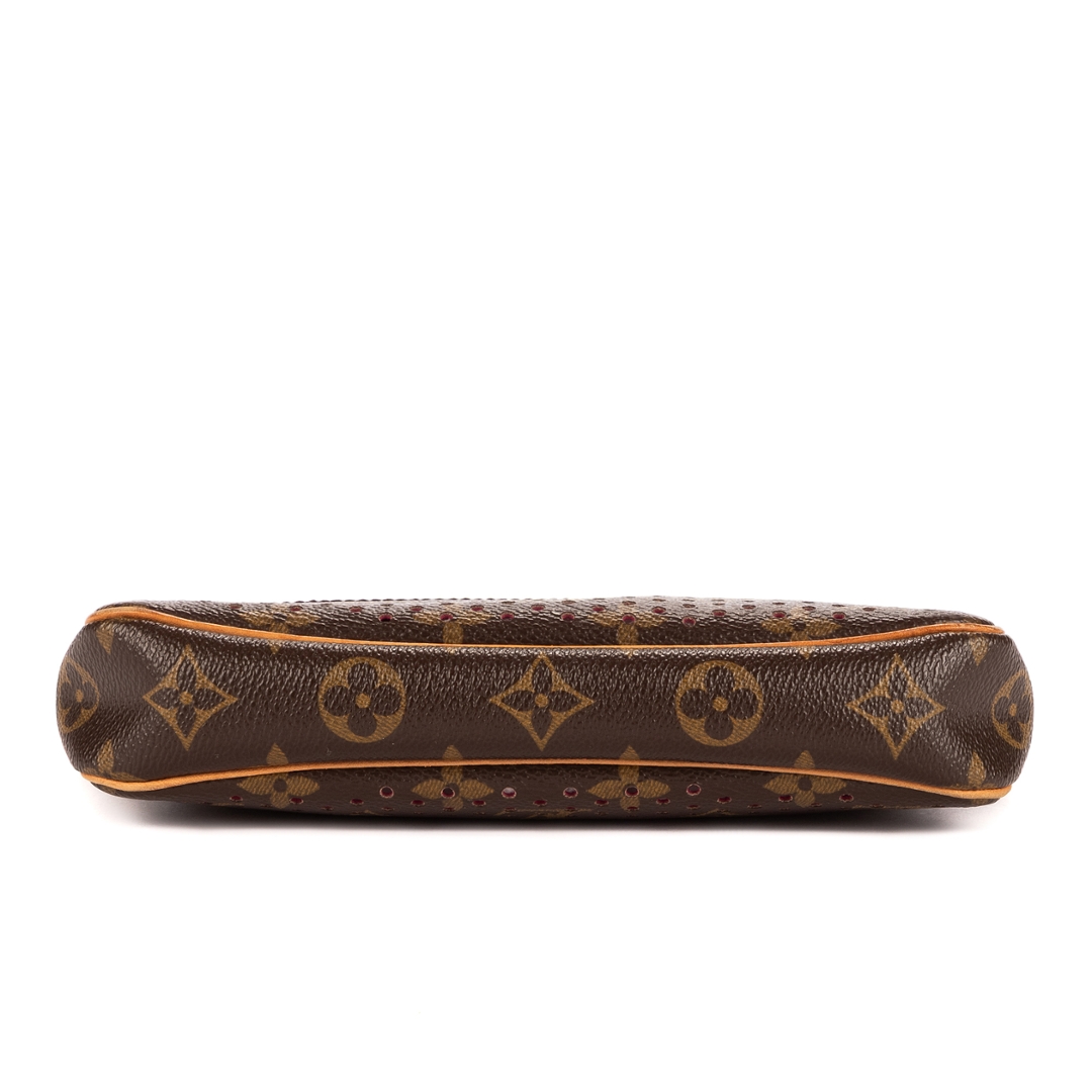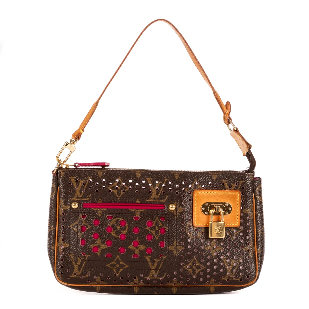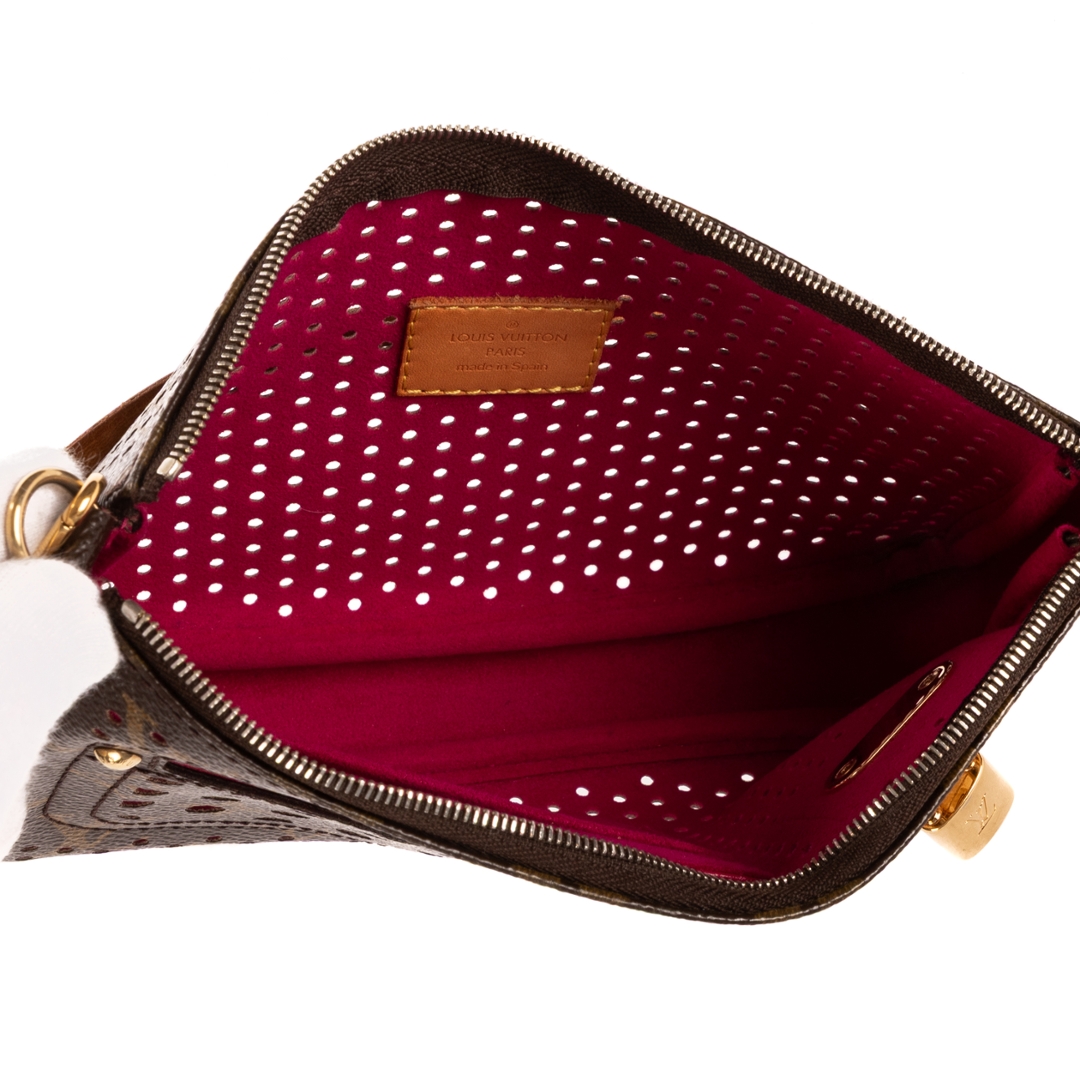 A vintage Louis Vuitton brown/fuchsia coated canvas Ltd. Ed. Monogram Perforated 2006 Accessory Pouch bag with a certificate of authenticity, Approximately 13cm height, 21cm width.