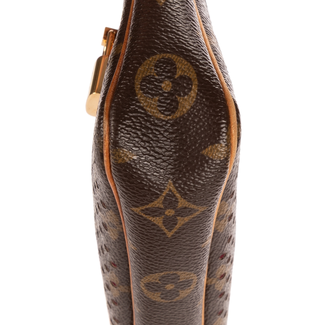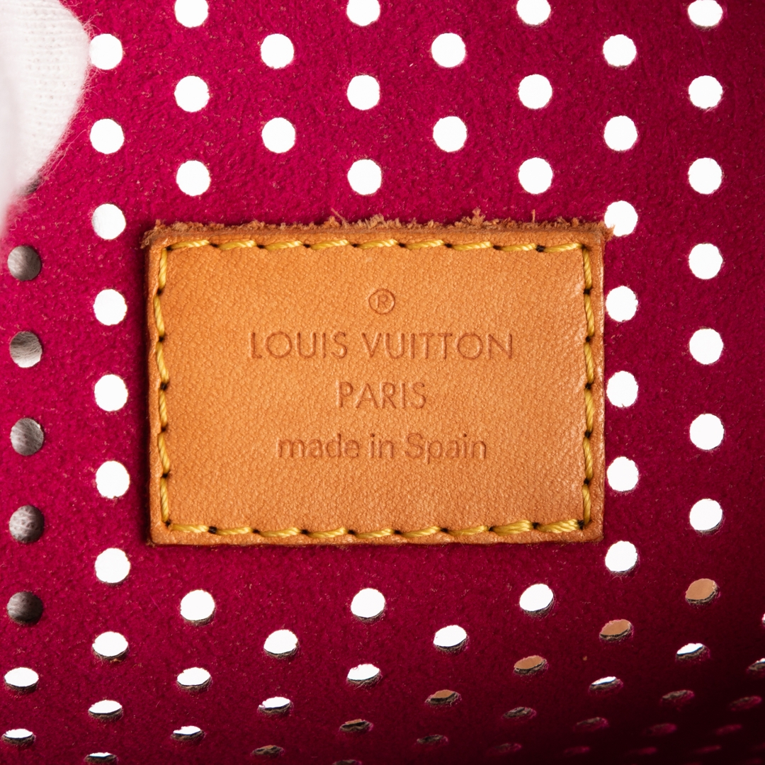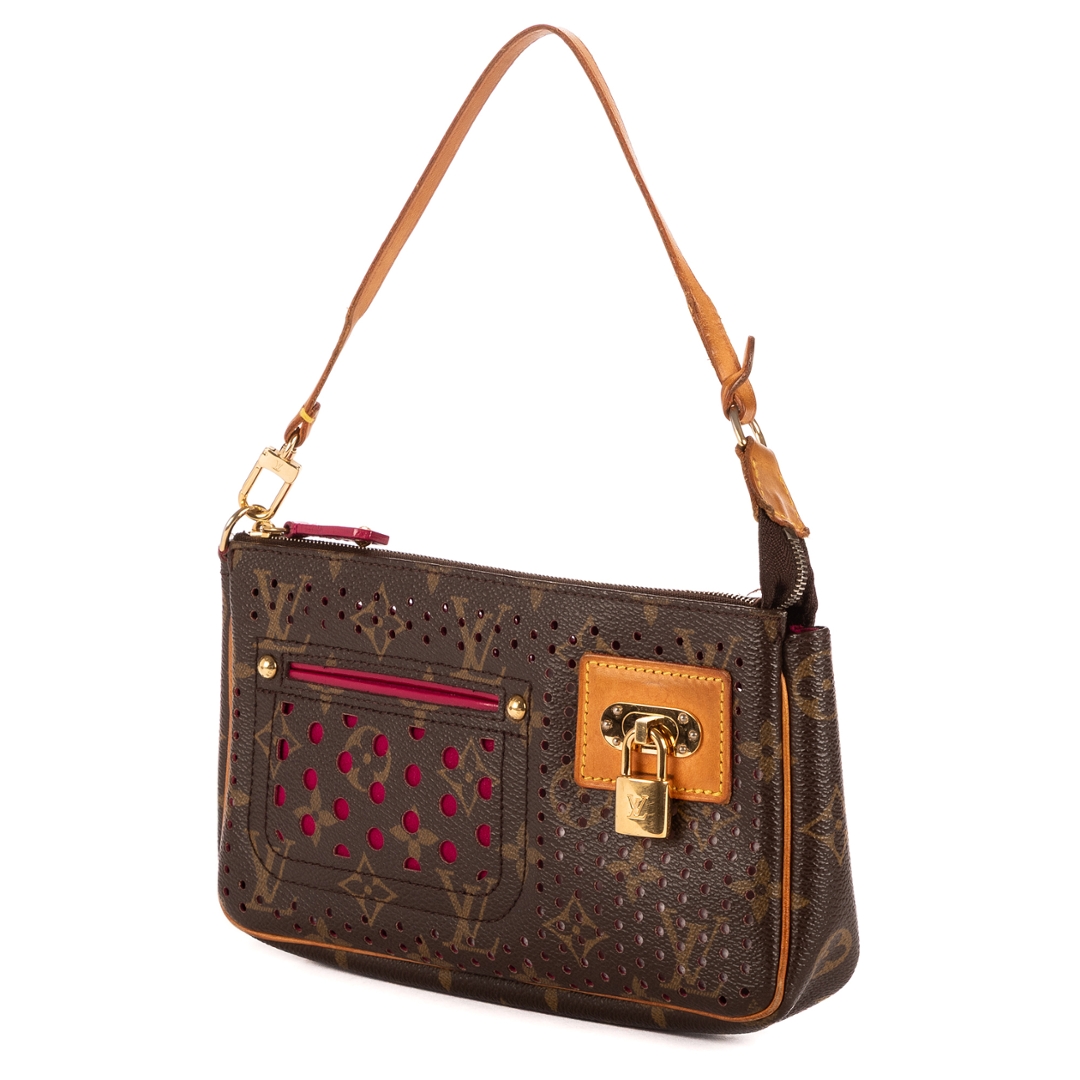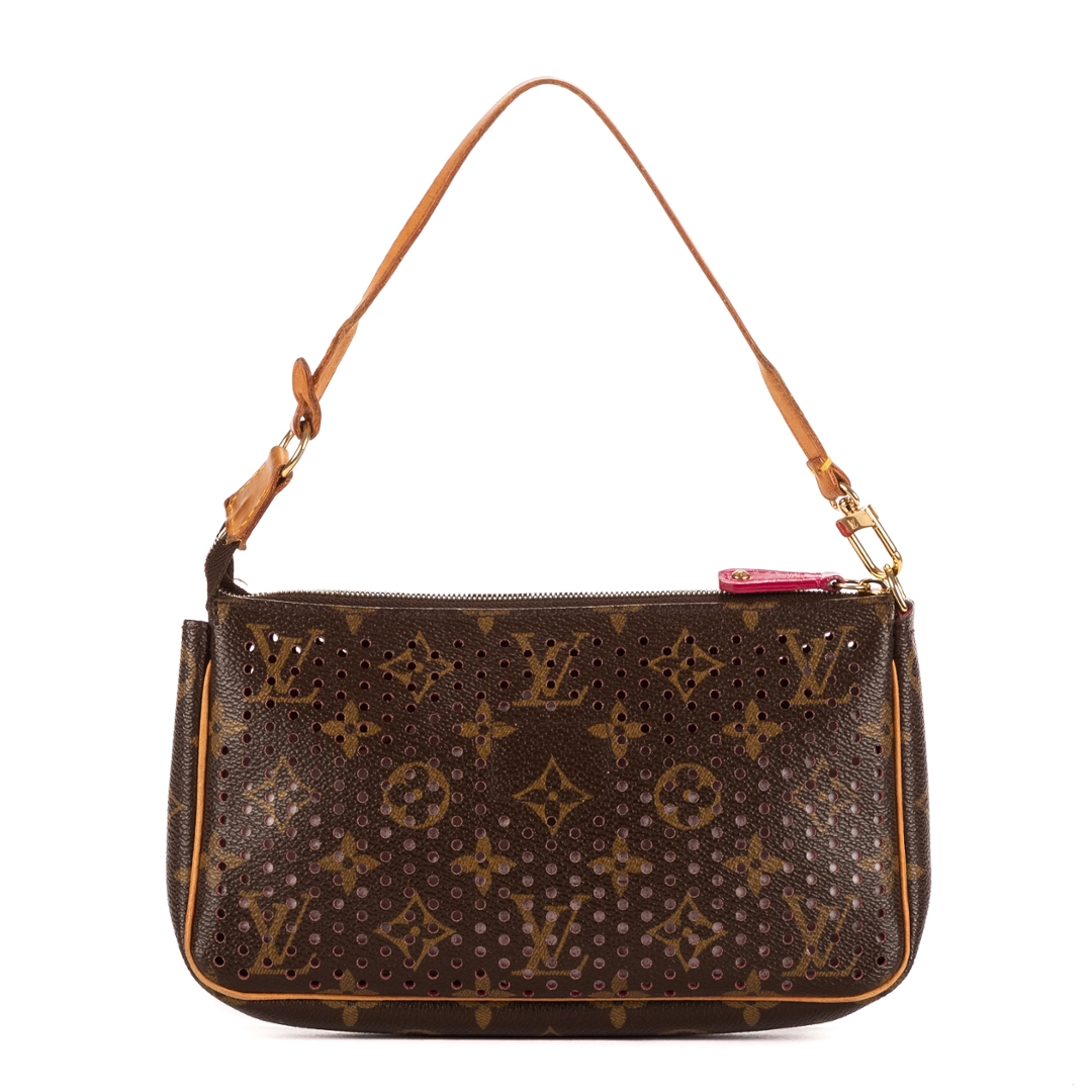 A vintage Louis Vuitton brown/fuchsia coated canvas Ltd. Ed. Monogram Perforated 2006 Accessory Pouch bag with a certificate of authenticity, Approximately 13cm height, 21cm width.