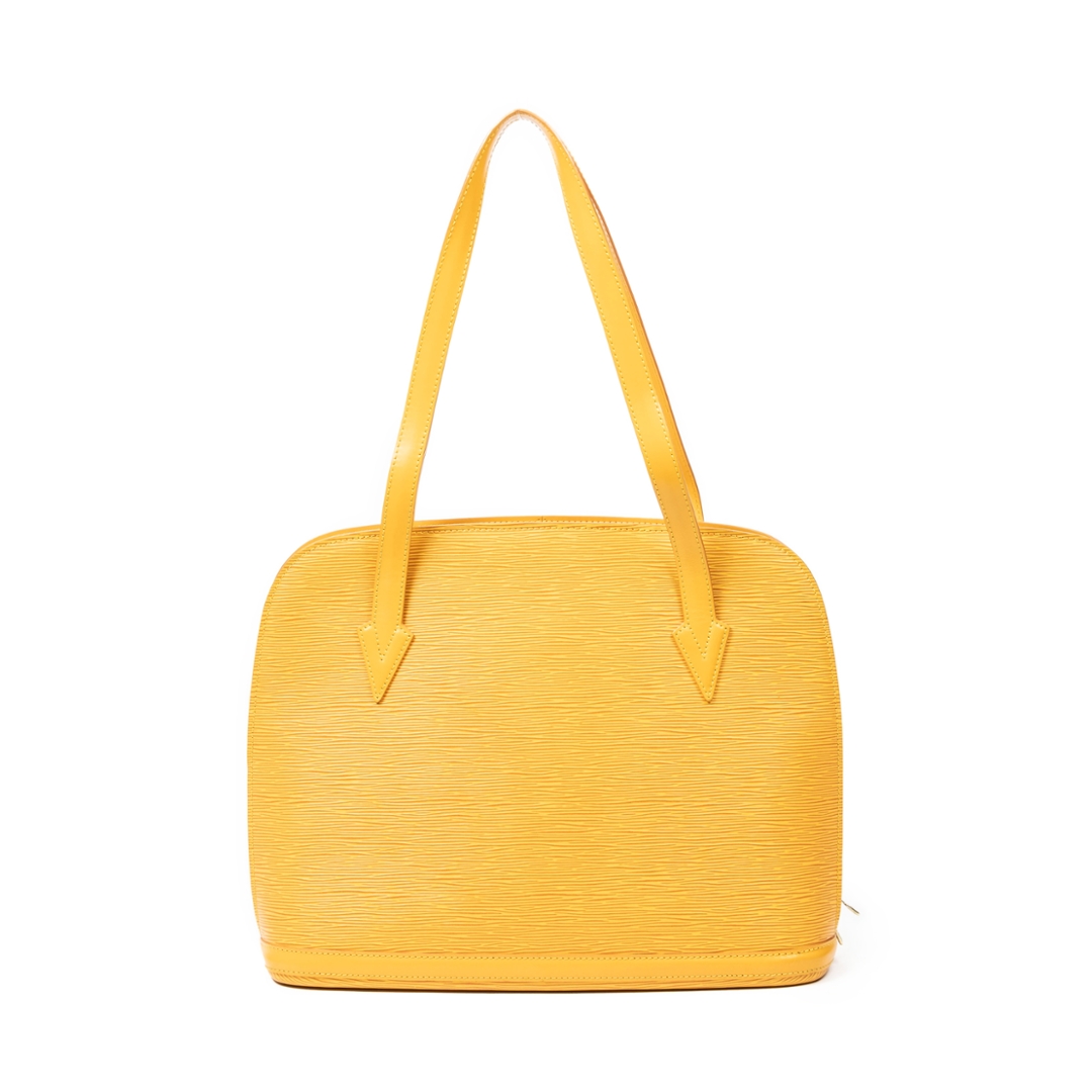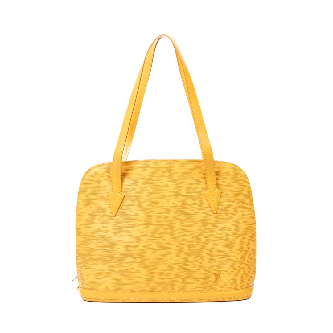 A vintage Lussac bag from Louis Vuitton, crafted in vibrant yellow calf leather with the brand’s distinctive textured finish. The clean, structured silhouette is defined by long shoulder straps and minimal exterior detailing, showcasing Louis Vuitton’s refined approach to functional, design-led handbags.