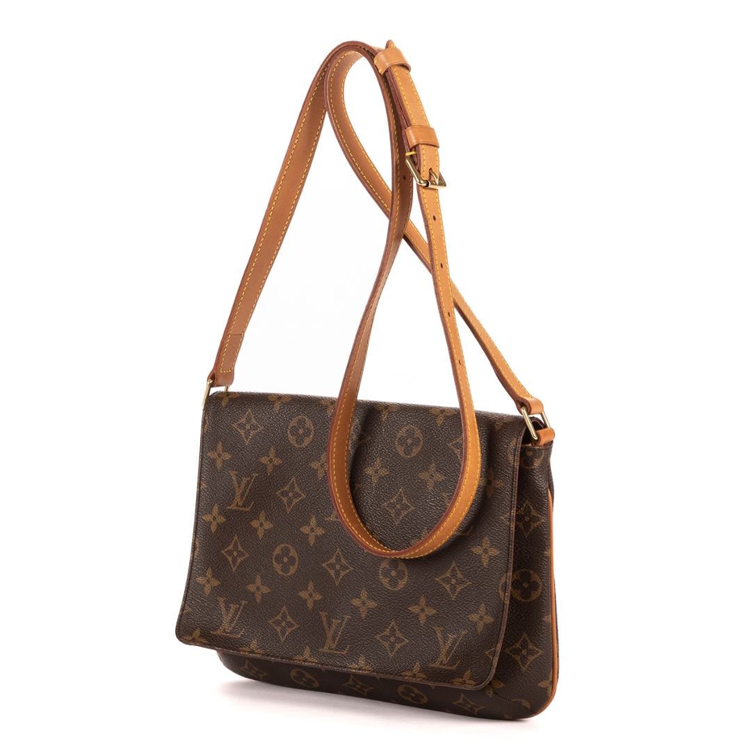 A vintage Louis Vuitton Musette Tango bag crafted in the house’s signature monogram coated canvas, offering a compact and effortlessly elegant silhouette. The clean flap-front design is paired with natural leather trim and a slim adjustable shoulder strap, creating a timeless piece that transitions seamlessly from day to evening wear.