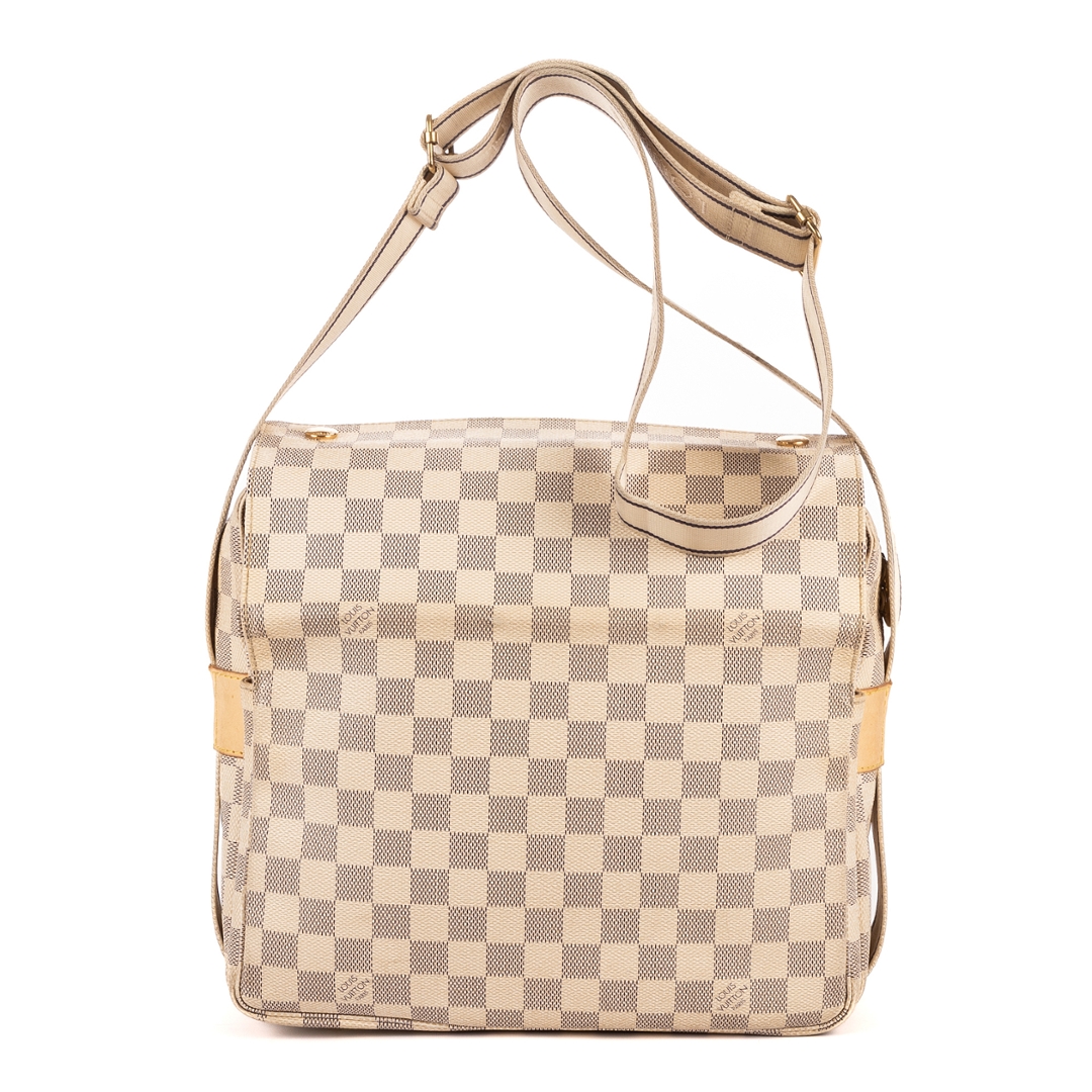 A vintage Louis Vuitton Naviglio bag crafted in refined white coated canvas, showcasing the house’s signature checkerboard pattern in a lighter, more contemporary palette. The structured silhouette is complemented by natural leather trim and a wide adjustable shoulder strap, delivering a practical yet elevated everyday design.