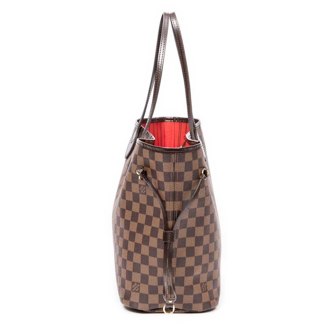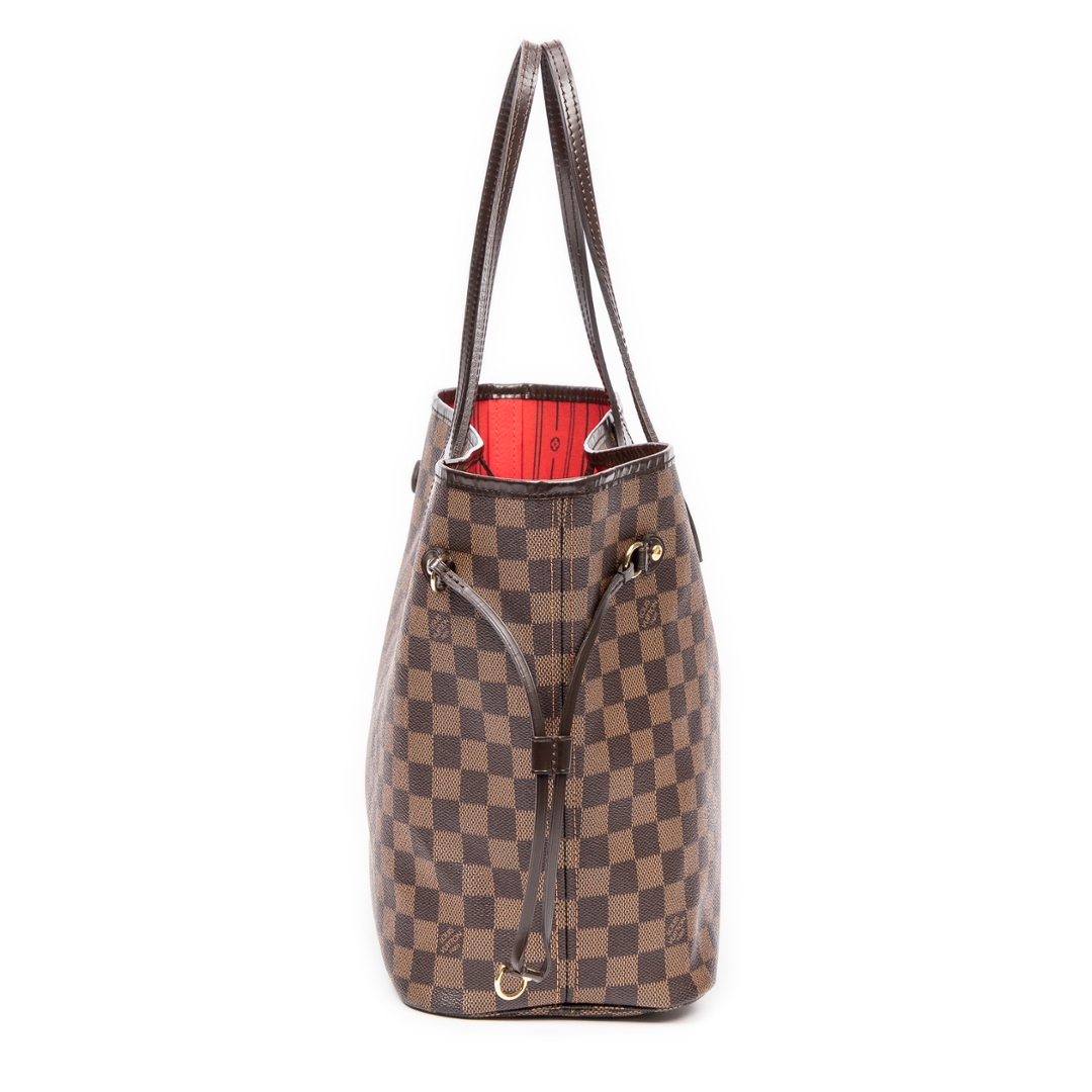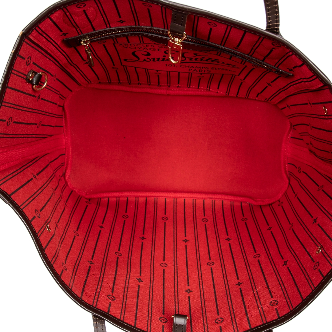 Measuring approximately 29cm in height and 32cm in width, the Neverfull offers ample space while maintaining a sleek, structured silhouette. The slim leather straps ensure comfortable wear, and the adjustable side laces allow for a customisable shape — from a roomy open tote to a more compact style. The interior, lined in rich red fabric, adds a bold pop of colour while providing practical organisation for everyday essentials.