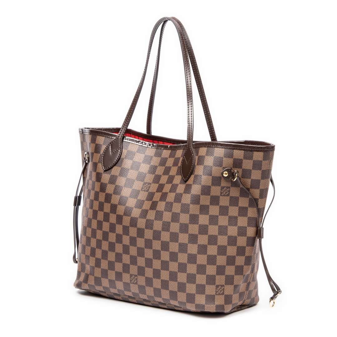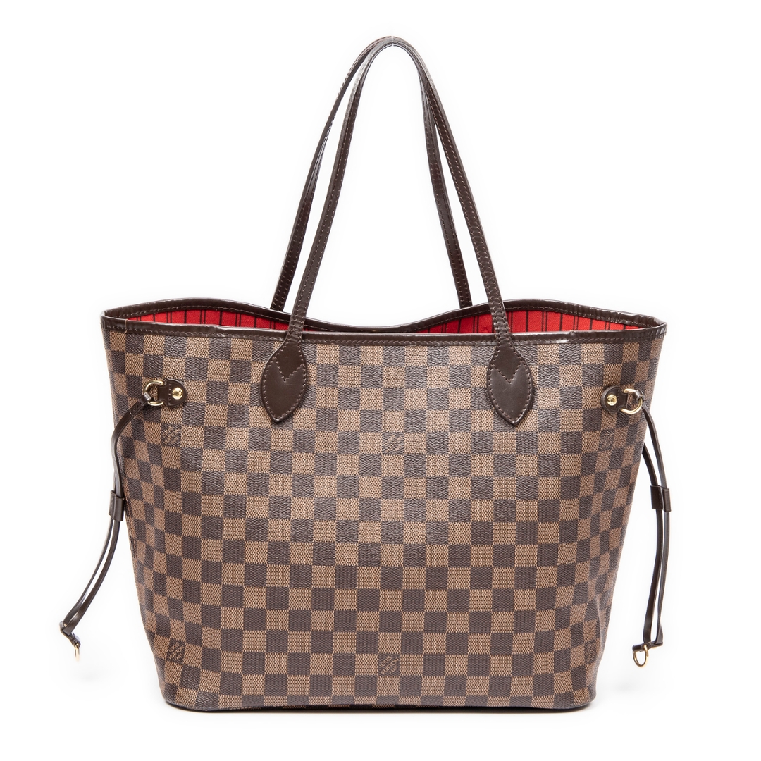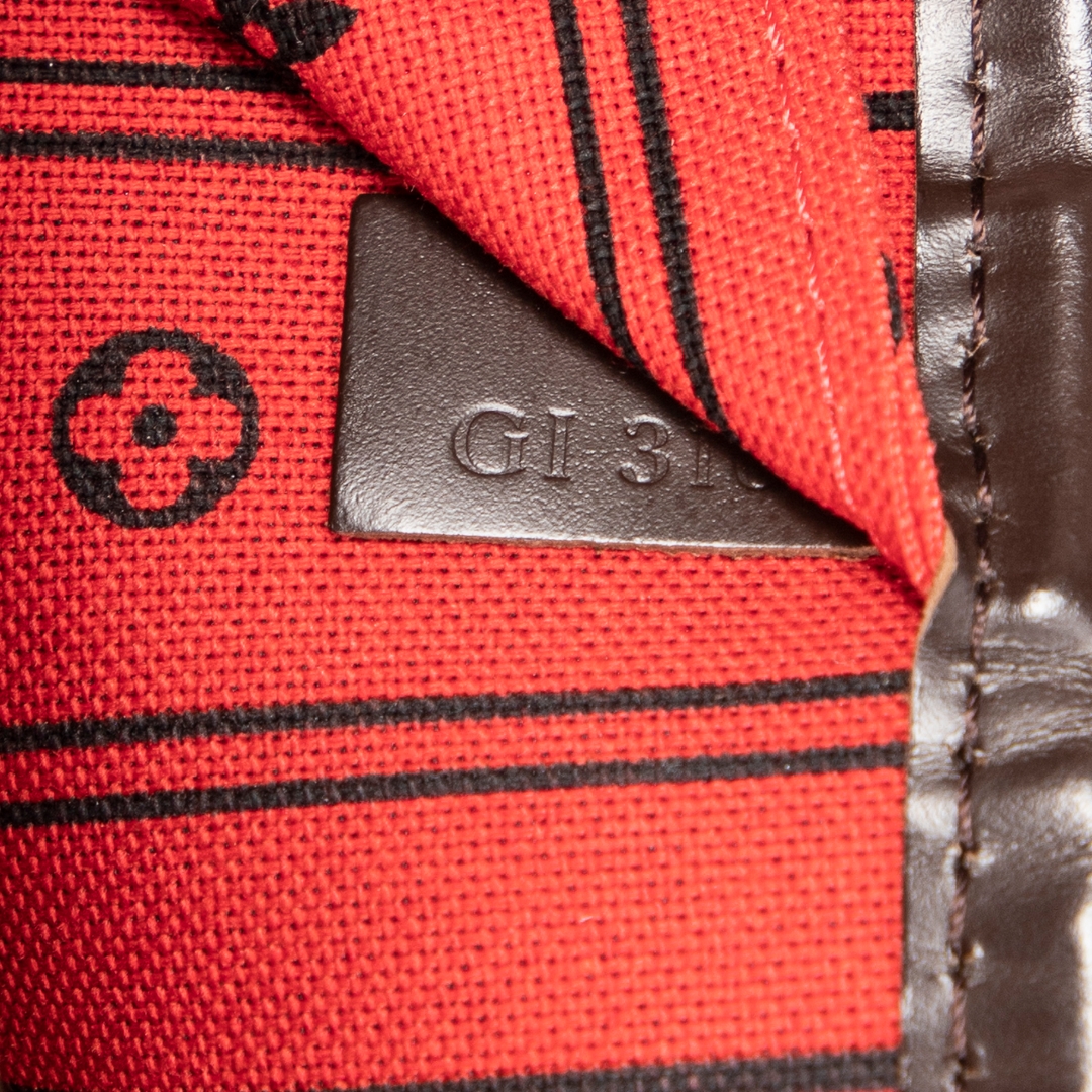 Measuring approximately 29cm in height and 32cm in width, the Neverfull offers ample space while maintaining a sleek, structured silhouette. The slim leather straps ensure comfortable wear, and the adjustable side laces allow for a customisable shape — from a roomy open tote to a more compact style. The interior, lined in rich red fabric, adds a bold pop of colour while providing practical organisation for everyday essentials.