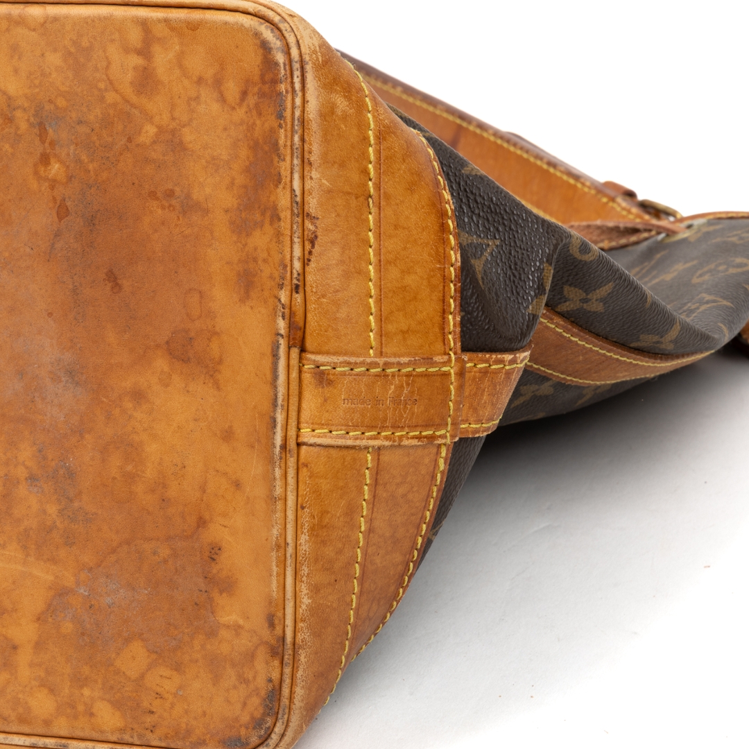 A vintage Louis Vuitton Noé bag crafted in the house’s iconic monogram coated canvas, showcasing a timeless silhouette originally designed for both function and style. The instantly recognisable pattern is complemented by natural leather trim, a structured base, and a classic drawstring closure, creating a relaxed yet refined bucket profile.