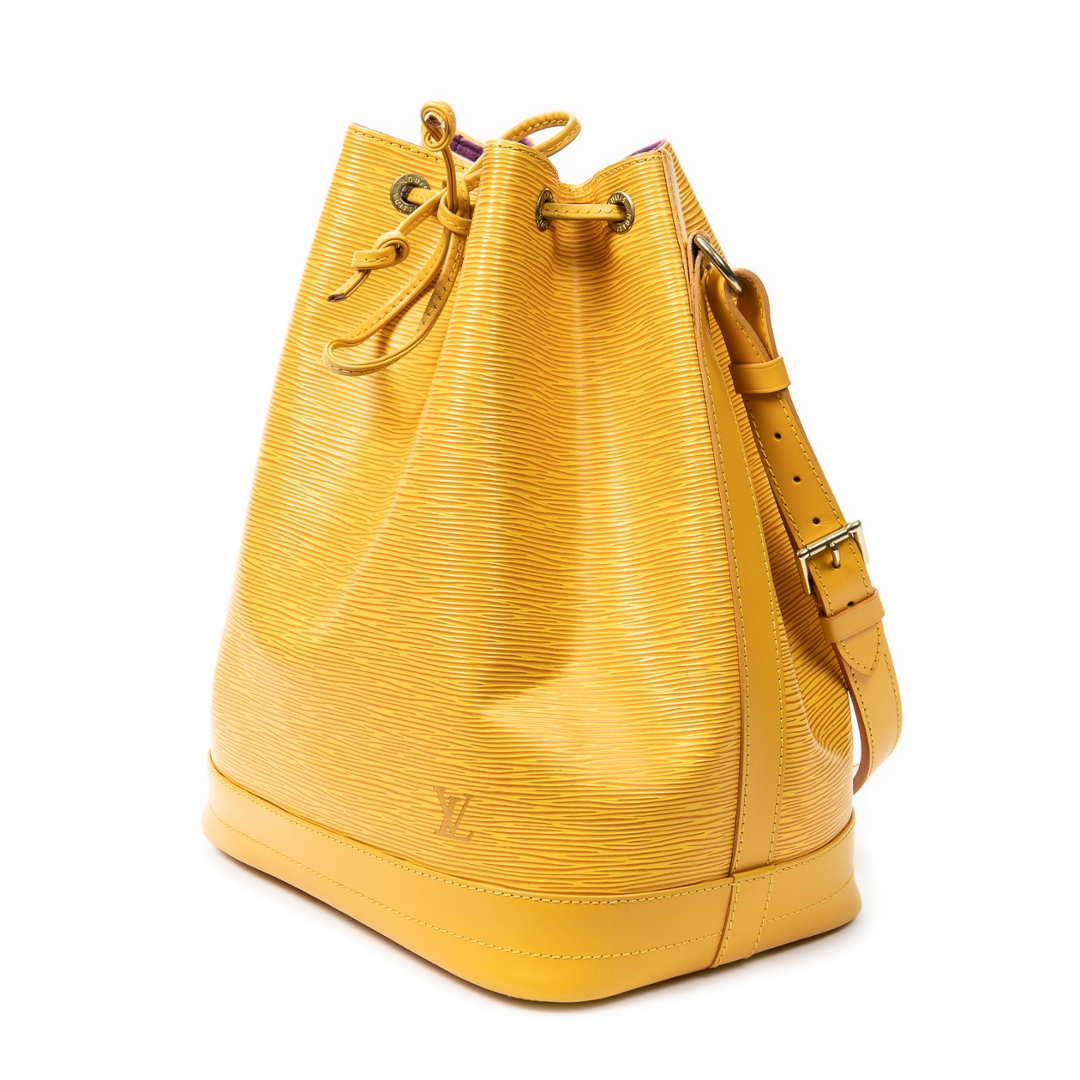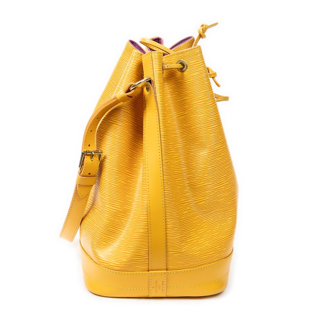 A vintage Louis Vuitton Noé bag crafted in vibrant yellow textured calf leather, offering a bold and distinctive take on one of the house’s most iconic silhouettes. The structured bucket design is enhanced by the signature drawstring closure and tonal leather trim, while the rich colourway adds a striking statement to this timeless piece.