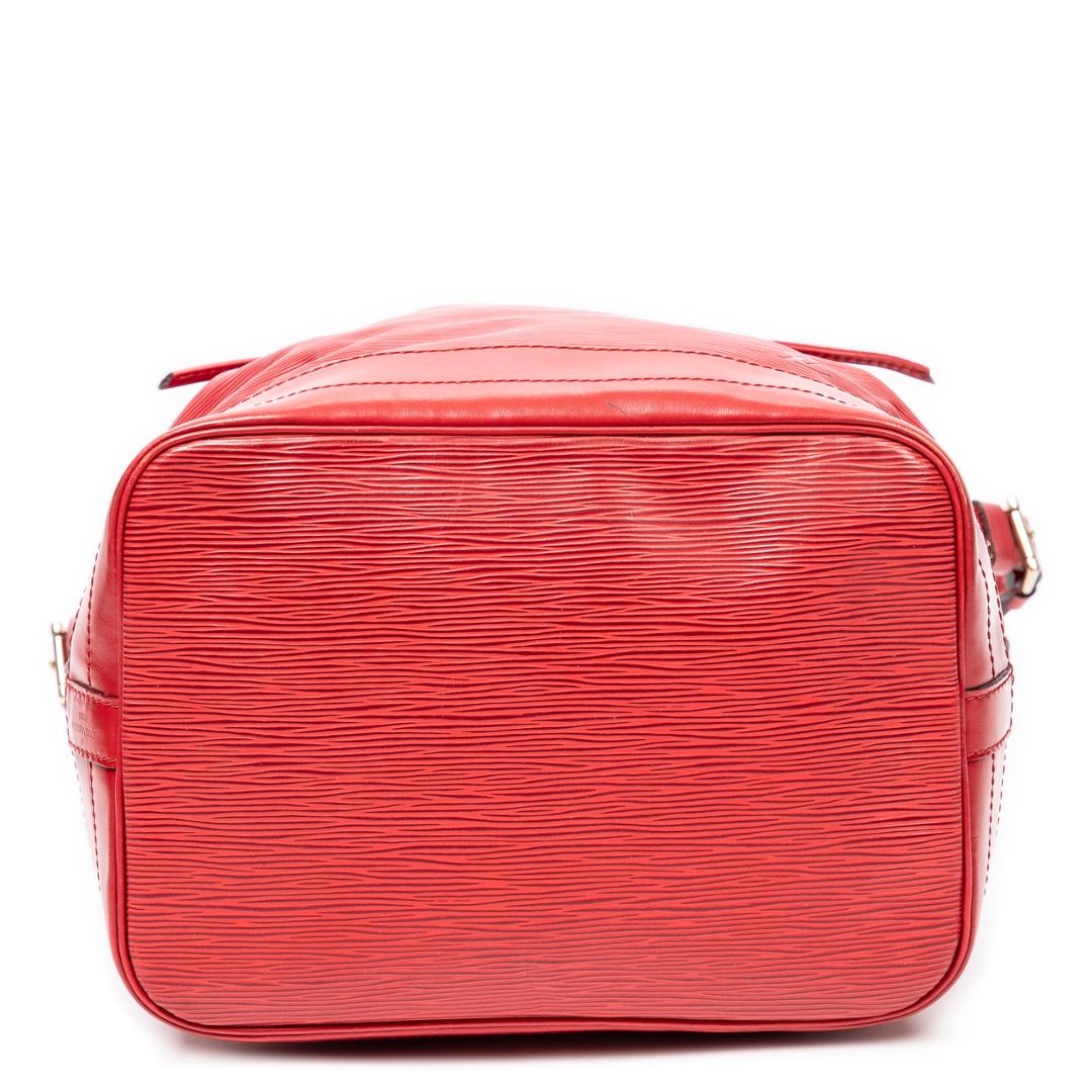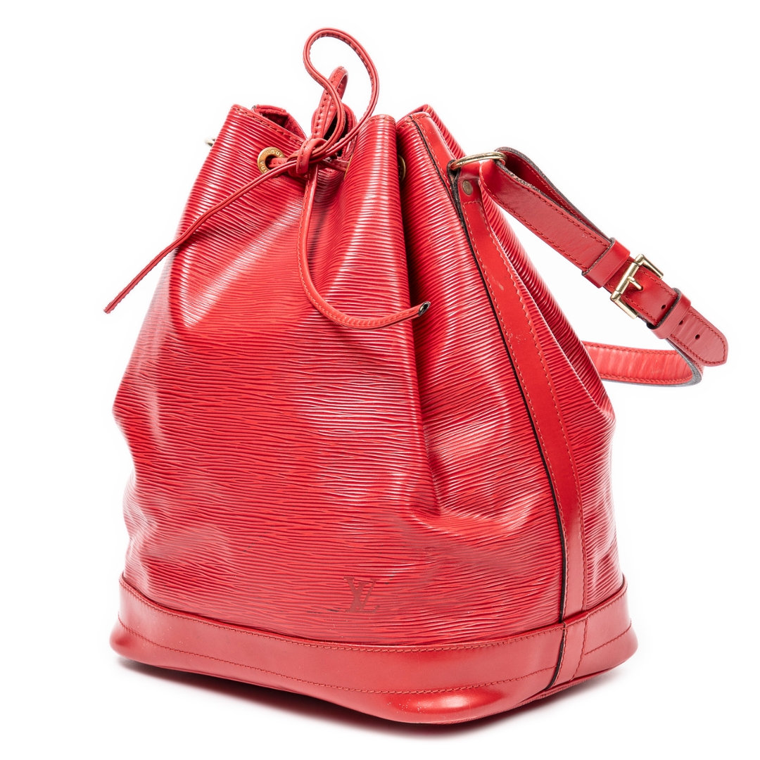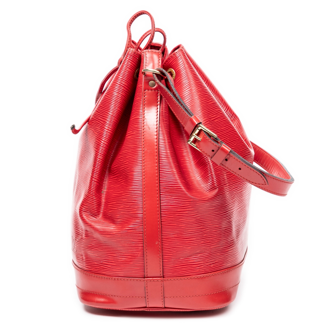 A vintage Louis Vuitton red calf leather Noe bag with a certificate of authenticity. Approximately 34cm height, 27cm width.