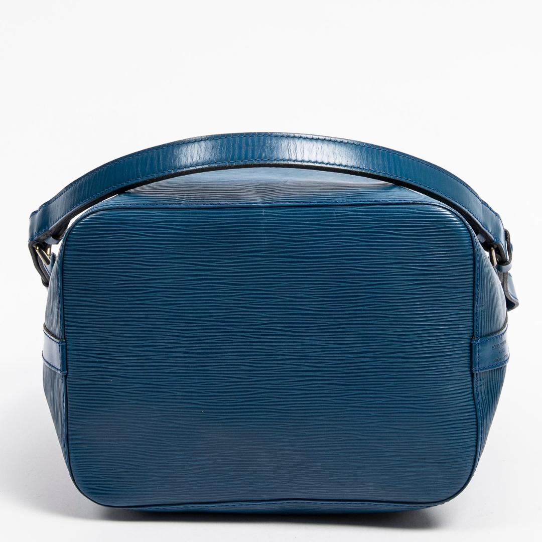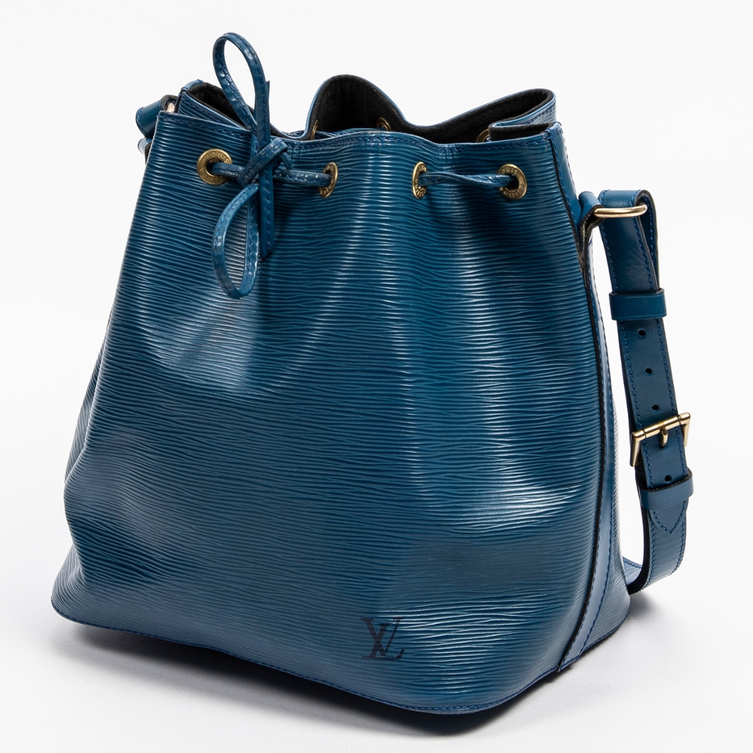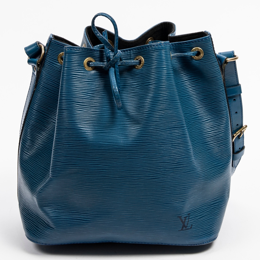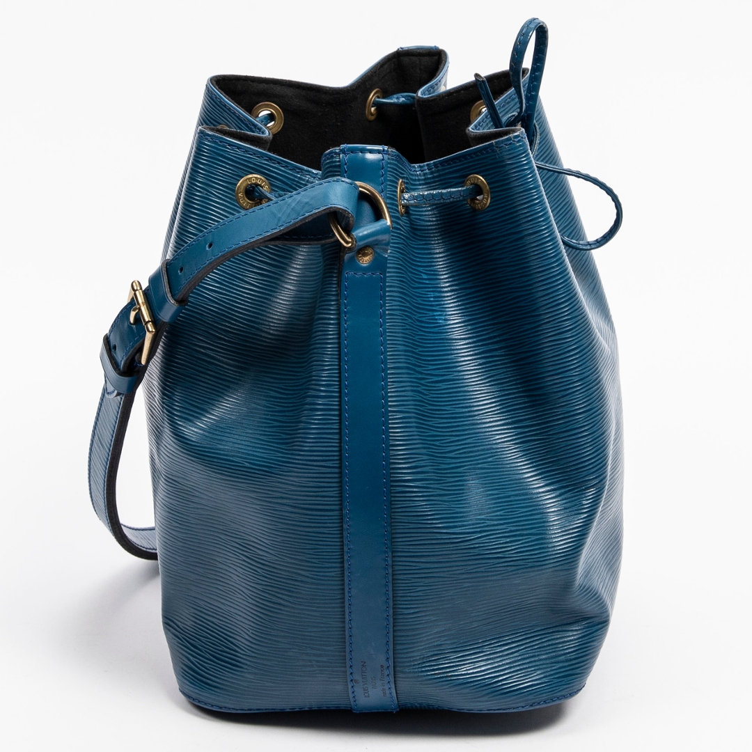 A vintage Louis Vuitton blue calf leather Noe bag with a certificate of authenticity, this striking piece highlights the classic Noe silhouette while offering a rarer and beautifully saturated blue finish. Crafted from Louis Vuitton’s distinctive Epi leather, the exterior showcases the signature textured grain, which adds depth, durability, and a refined sheen to the overall design. The drawstring closure adds a timeless touch, allowing the shape to be adjusted with ease while contributing to the Noe’s characteristic relaxed structure.