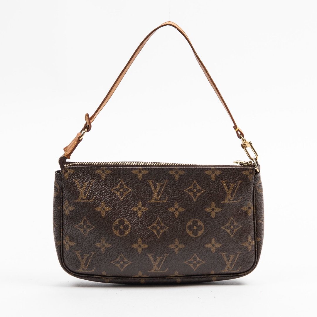 A vintage Louis Vuitton Pochette Accessoires bag crafted in the house’s iconic monogram coated canvas, finished with natural leather trim and gold-tone hardware. This compact and highly recognisable design embodies effortless Parisian styling, making it a staple piece within the Louis Vuitton collection.