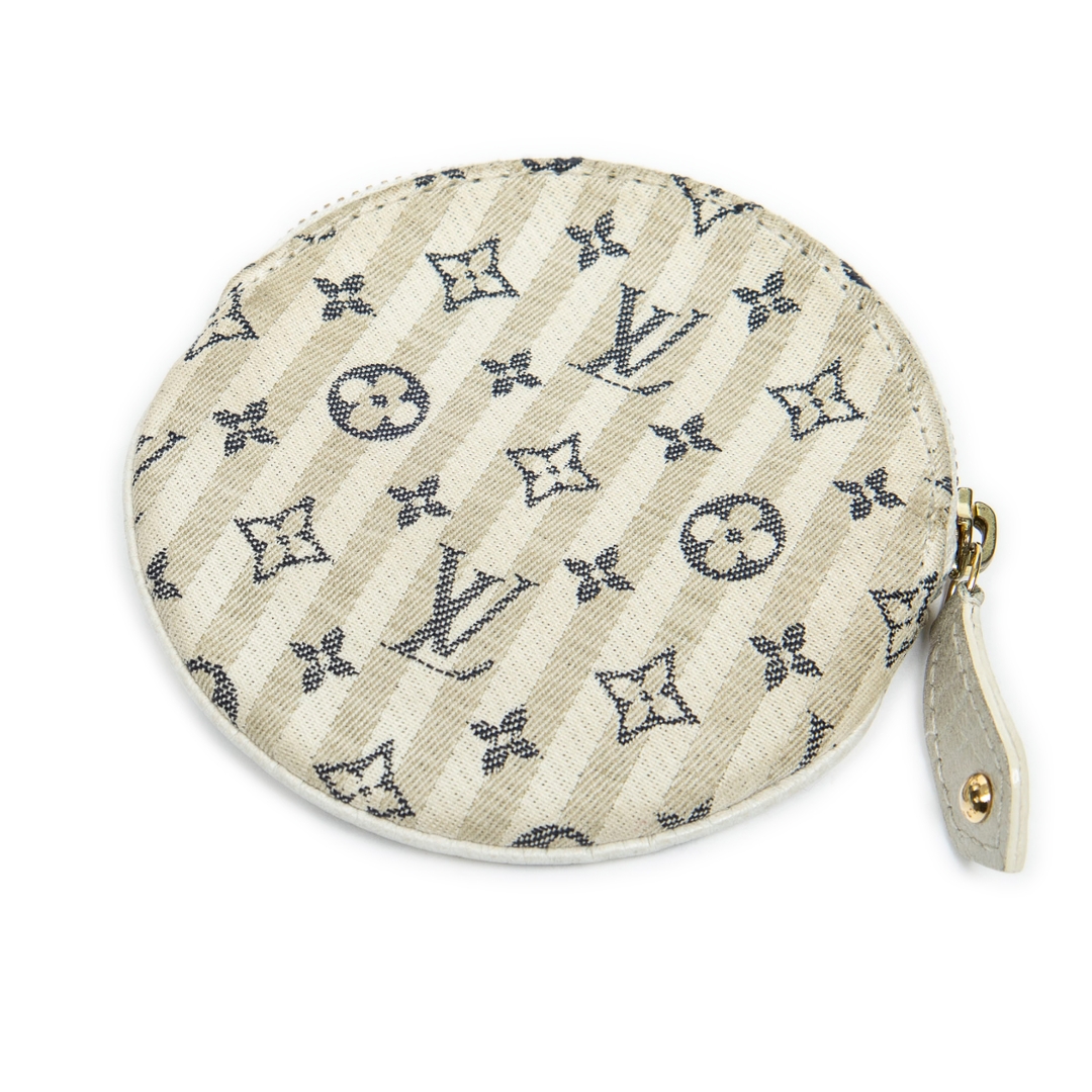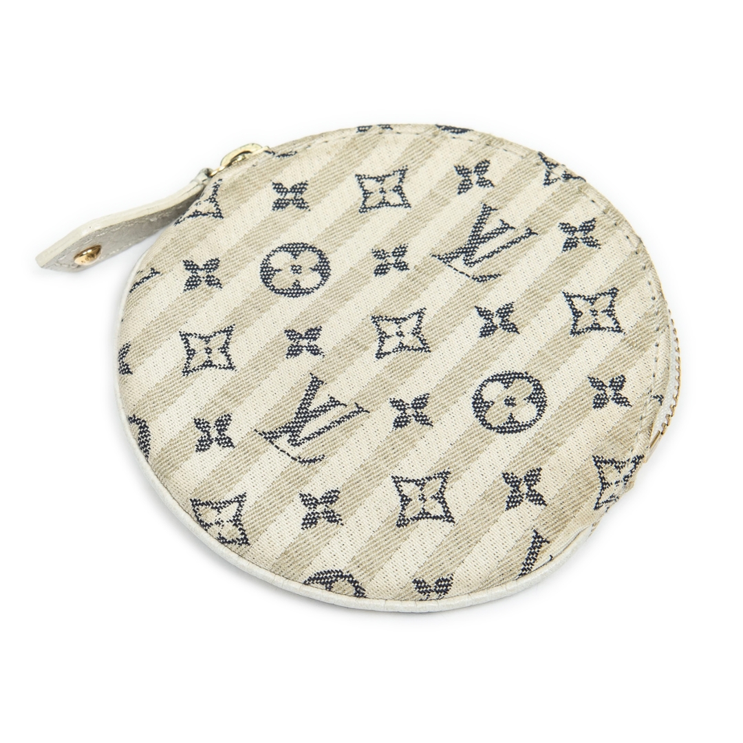 A vintage Louis Vuitton ivory/navy blue canvas Porte Monnaie Round bag with a certificate of authenticity. Approximately 9cm height, 9cm width.