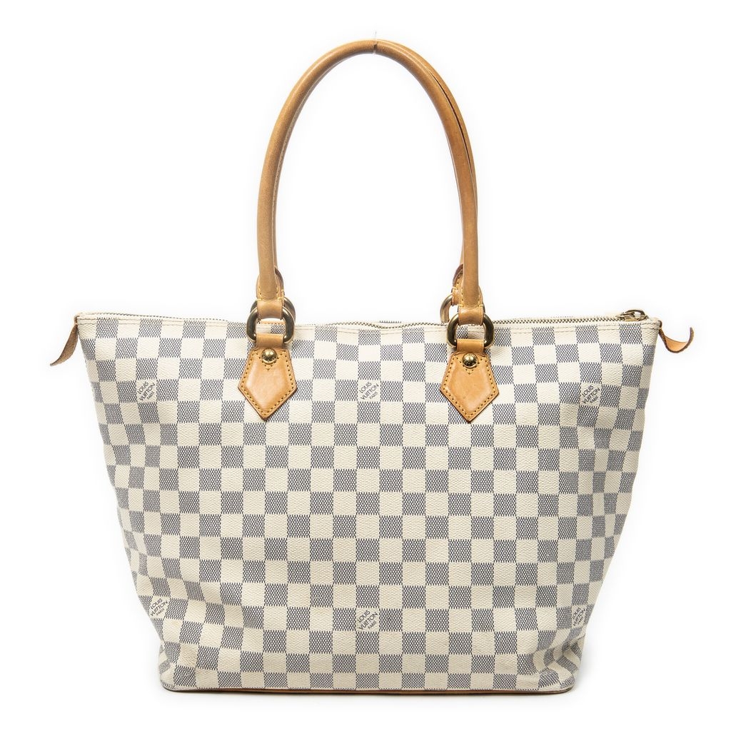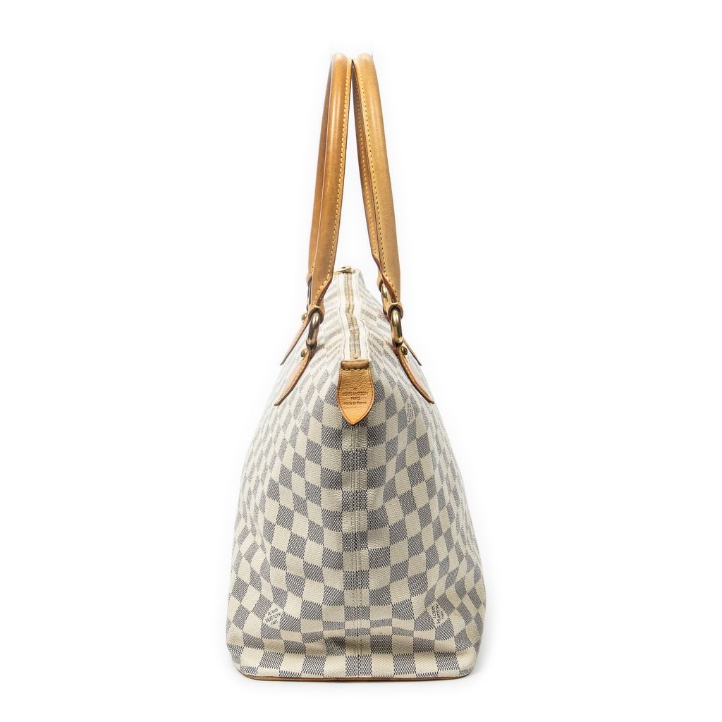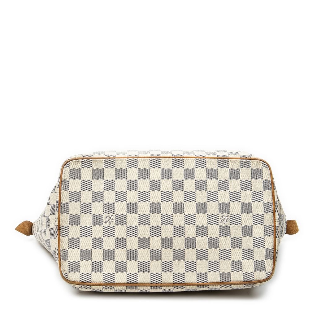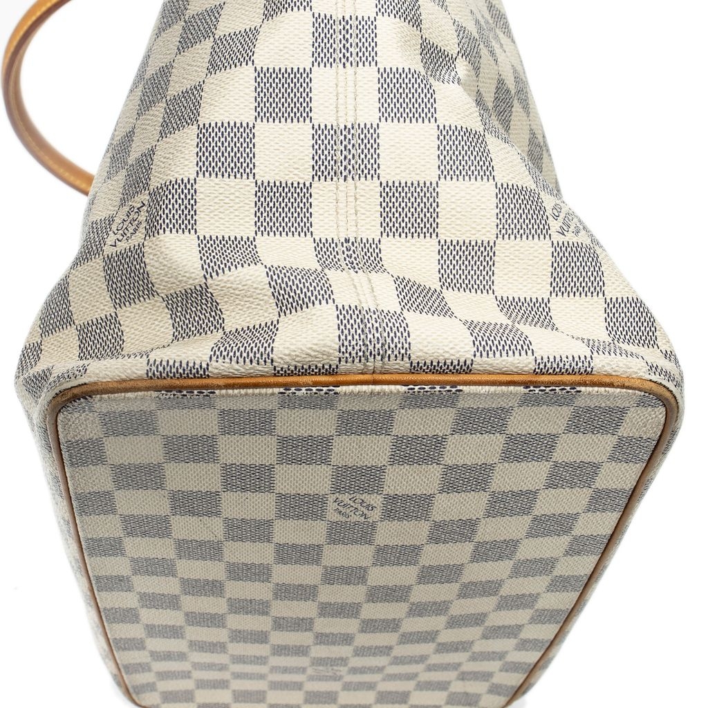 A vintage Louis Vuitton ivory-coated canvas Saleya bag with a certificate of authenticity, measuring approximately 29cm in height and 31cm in width. Featuring the iconic Damier Azur canvas paired with natural cowhide leather handles, the Saleya is a refined yet practical design, ideal for everyday sophistication. Its structured silhouette makes it both elegant and versatile, embodying the timeless aesthetic of Louis Vuitton.