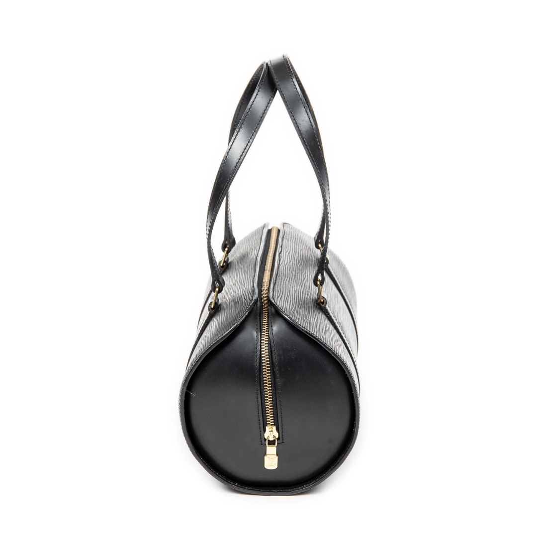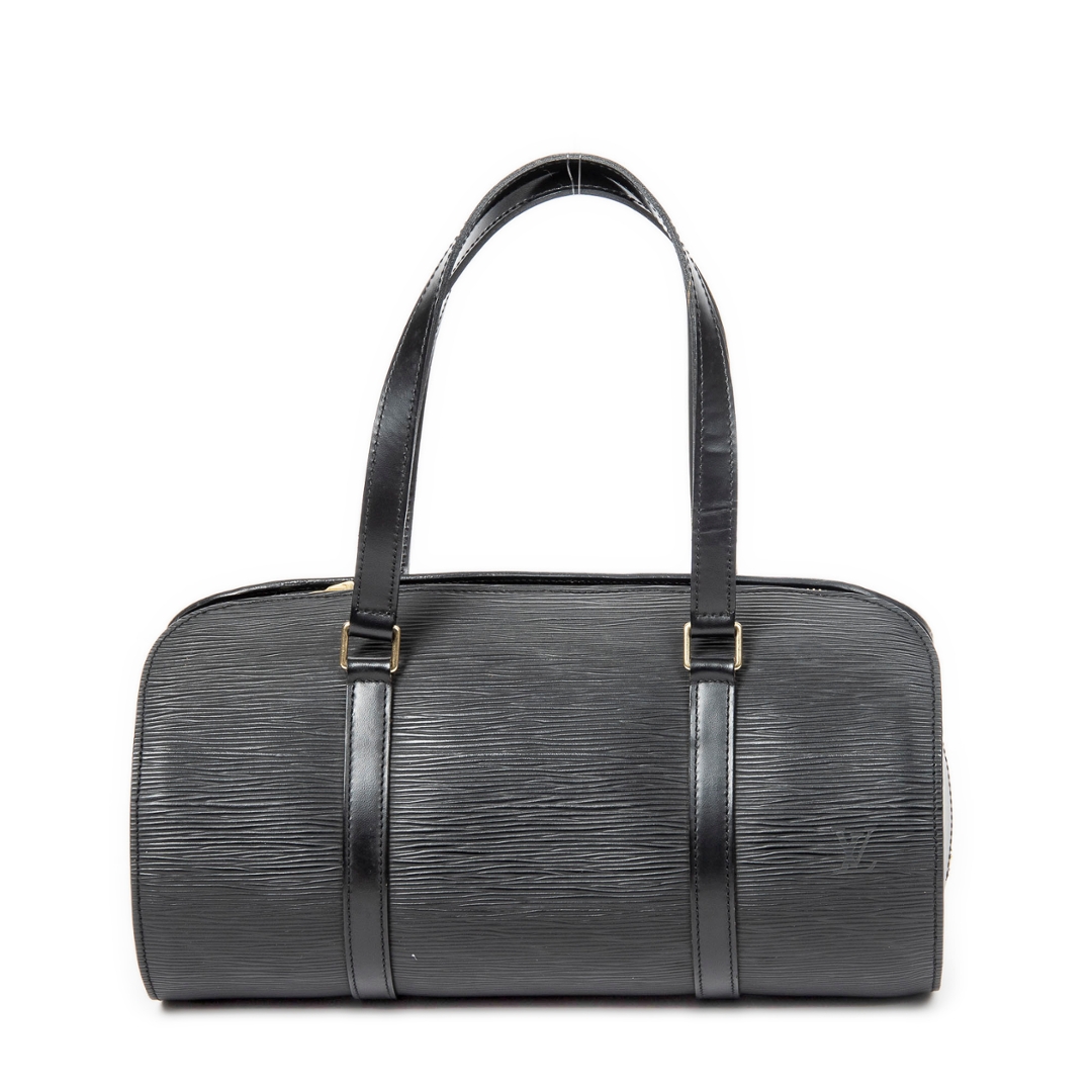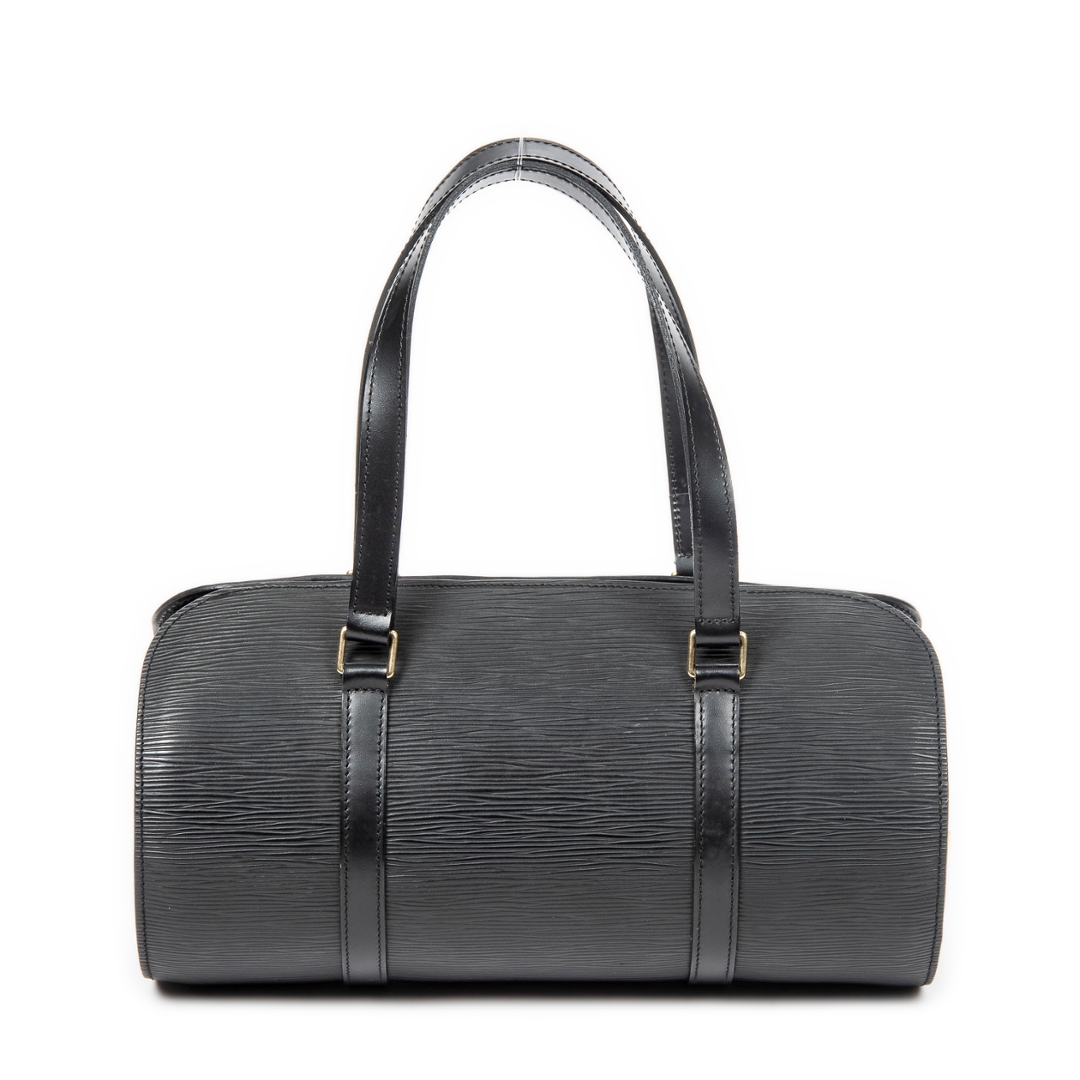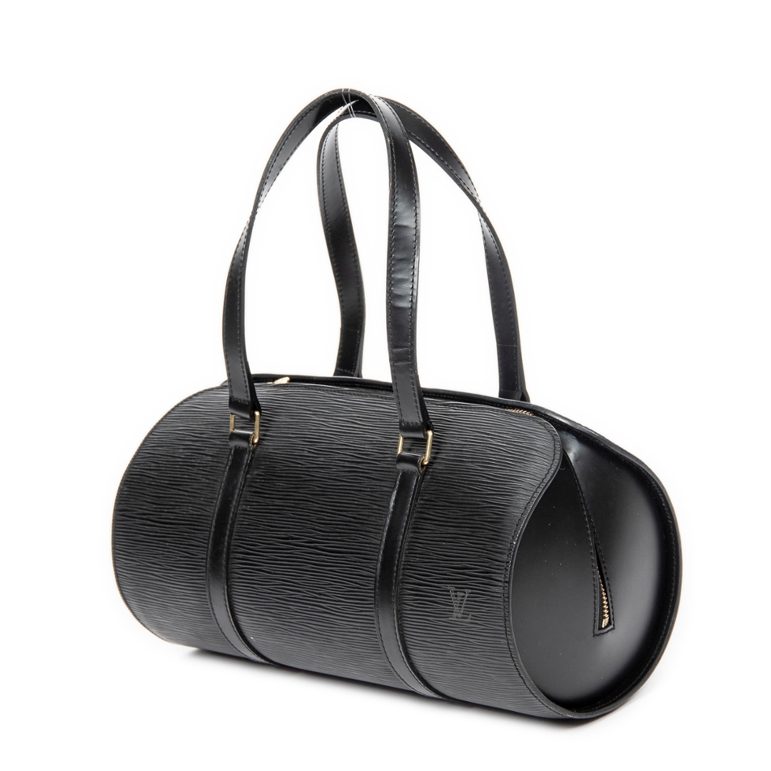 A vintage Louis Vuitton black calf leather Soufflot bag with a certificate of authenticity, Approximately 15cm height, 30cm width.