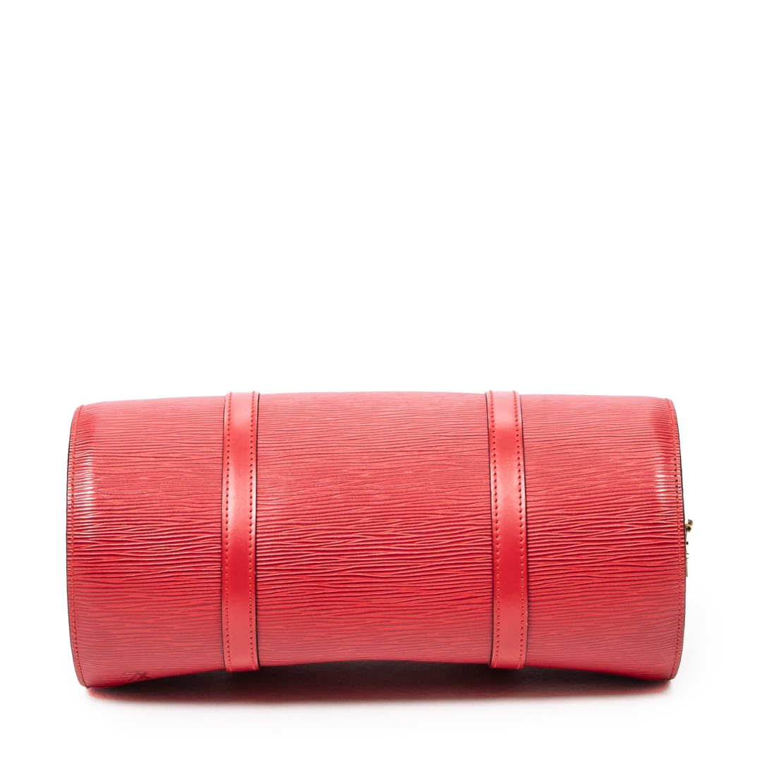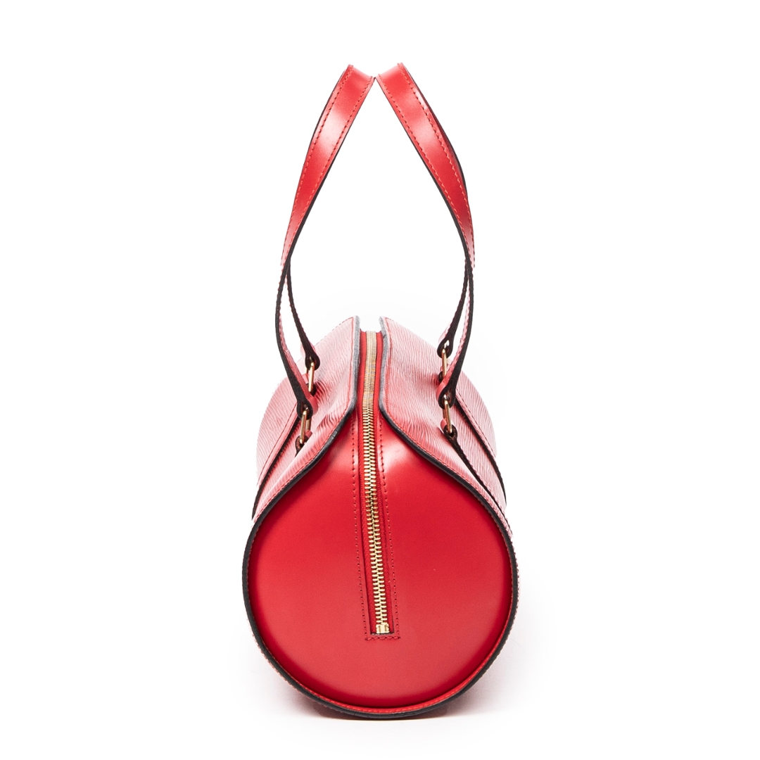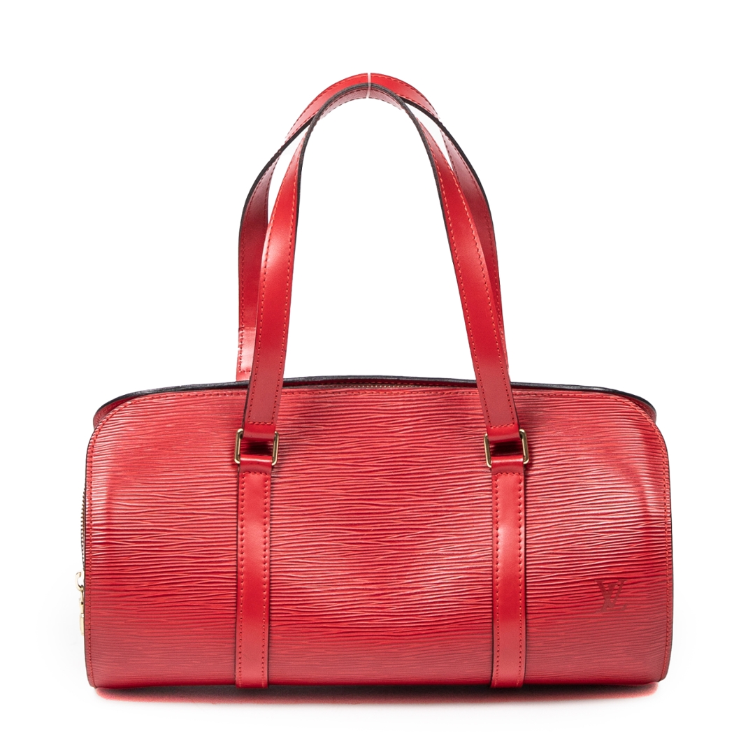 A vintage Louis Vuitton Soufflot bag crafted in striking red calf leather with the house’s signature textured finish, offering a bold yet refined interpretation of a classic cylindrical silhouette. The structured form is complemented by matching leather handles and subtle LV embossing, delivering a clean and elegant aesthetic that stands out effortlessly.