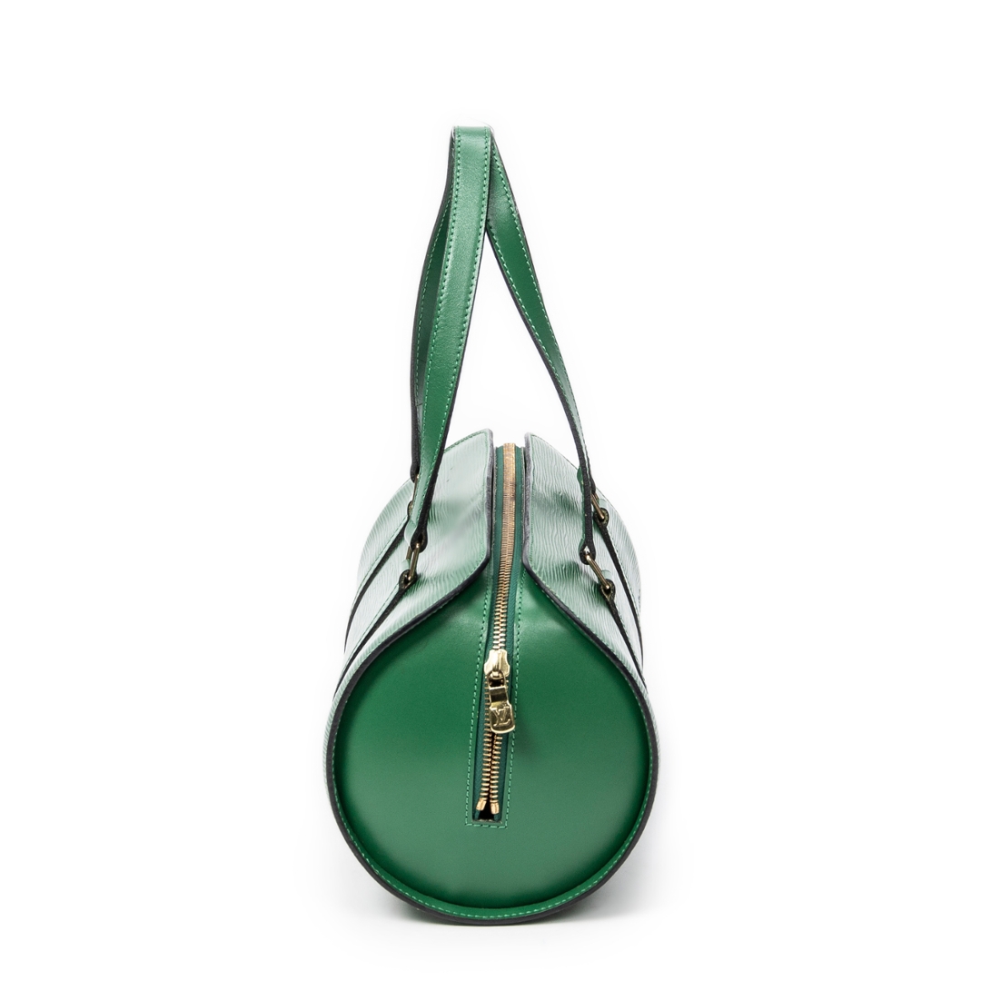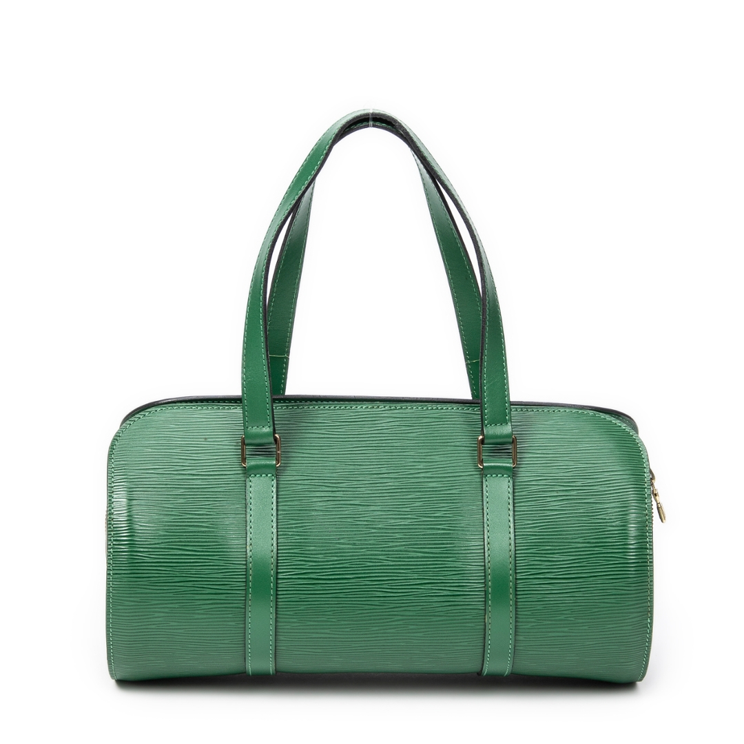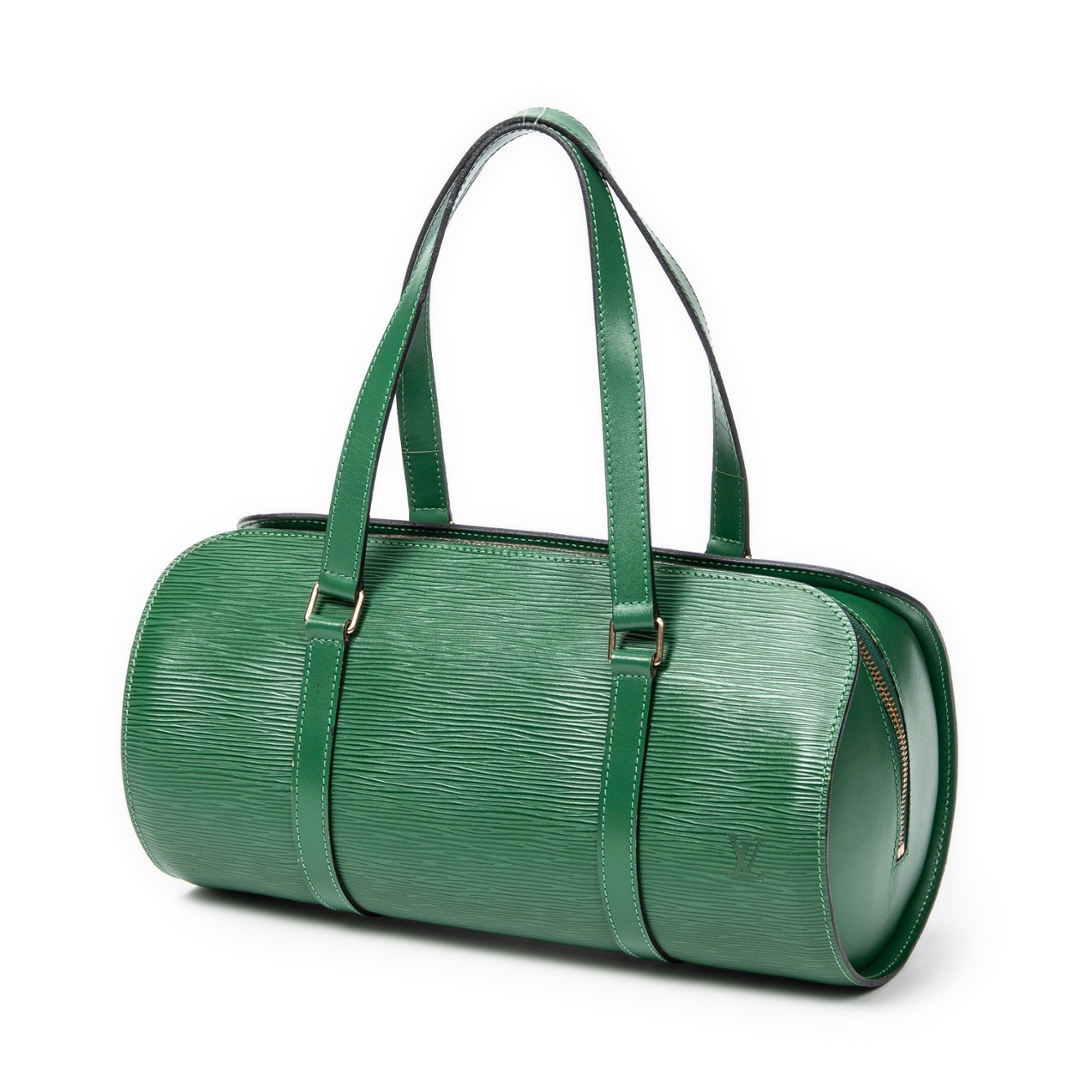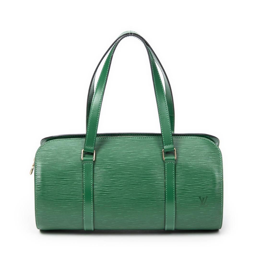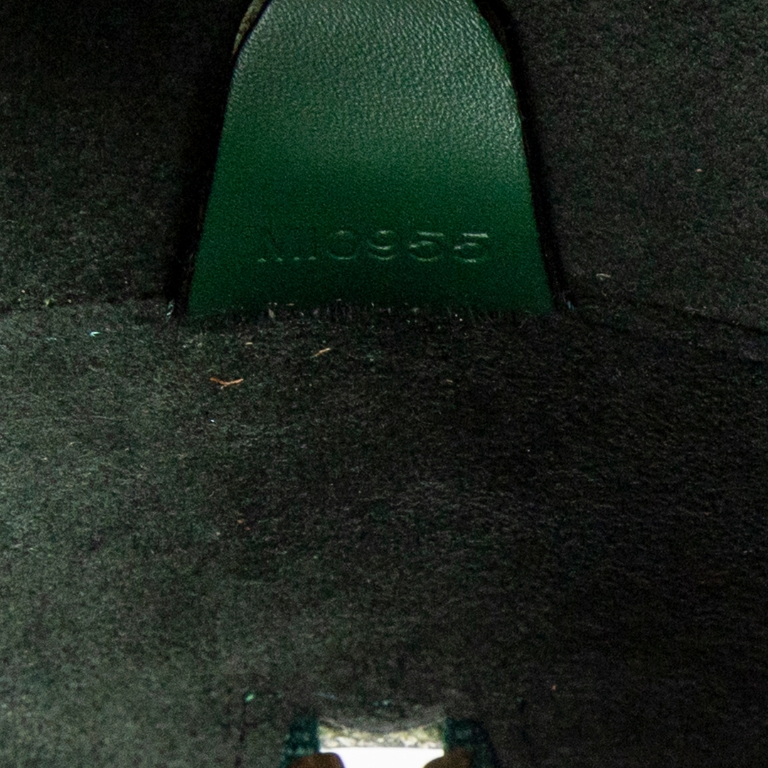 A vintage Louis Vuitton green calf leather Soufflot bag with a certificate of authenticity, Approximately 15cm height, 30cm width.
