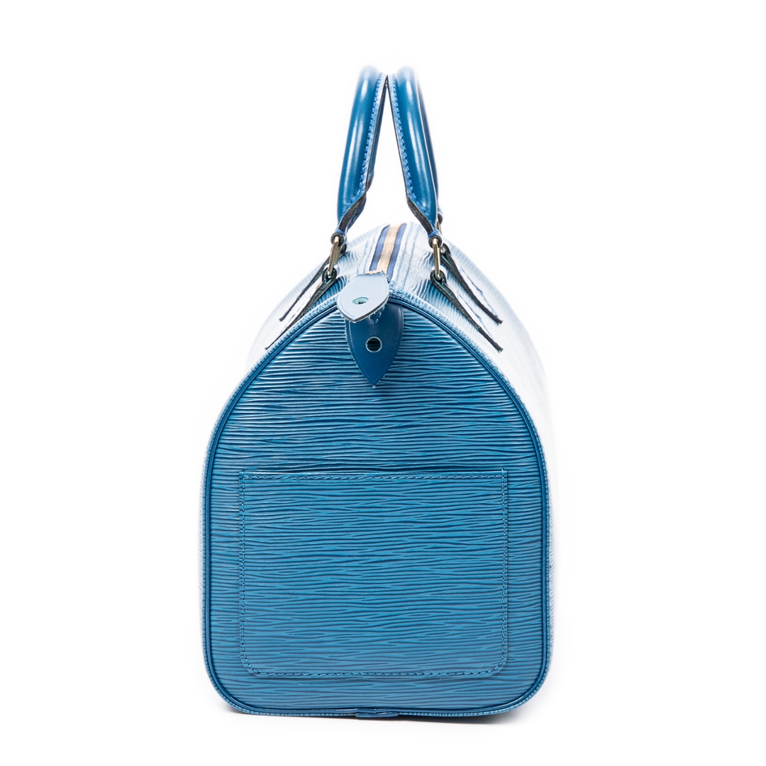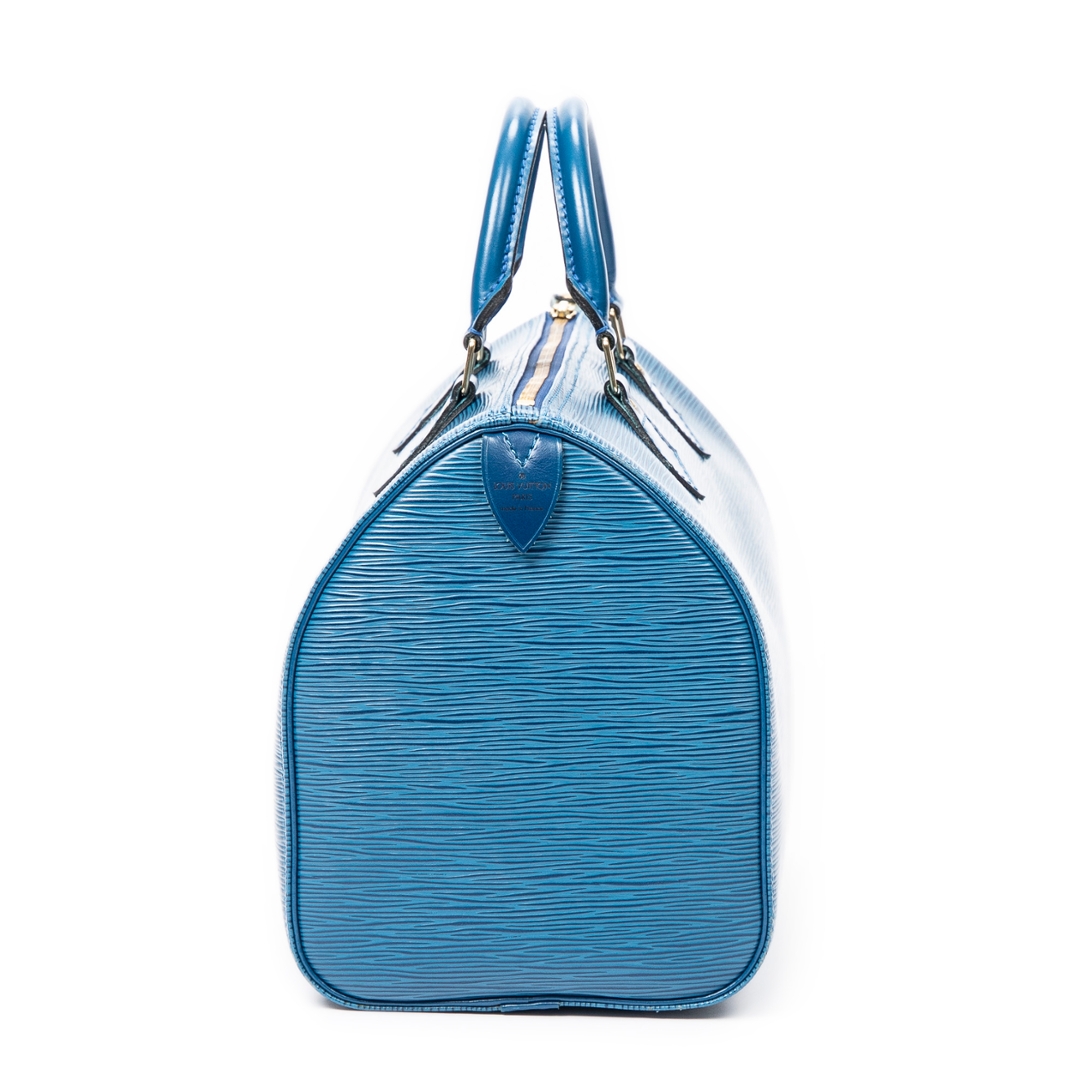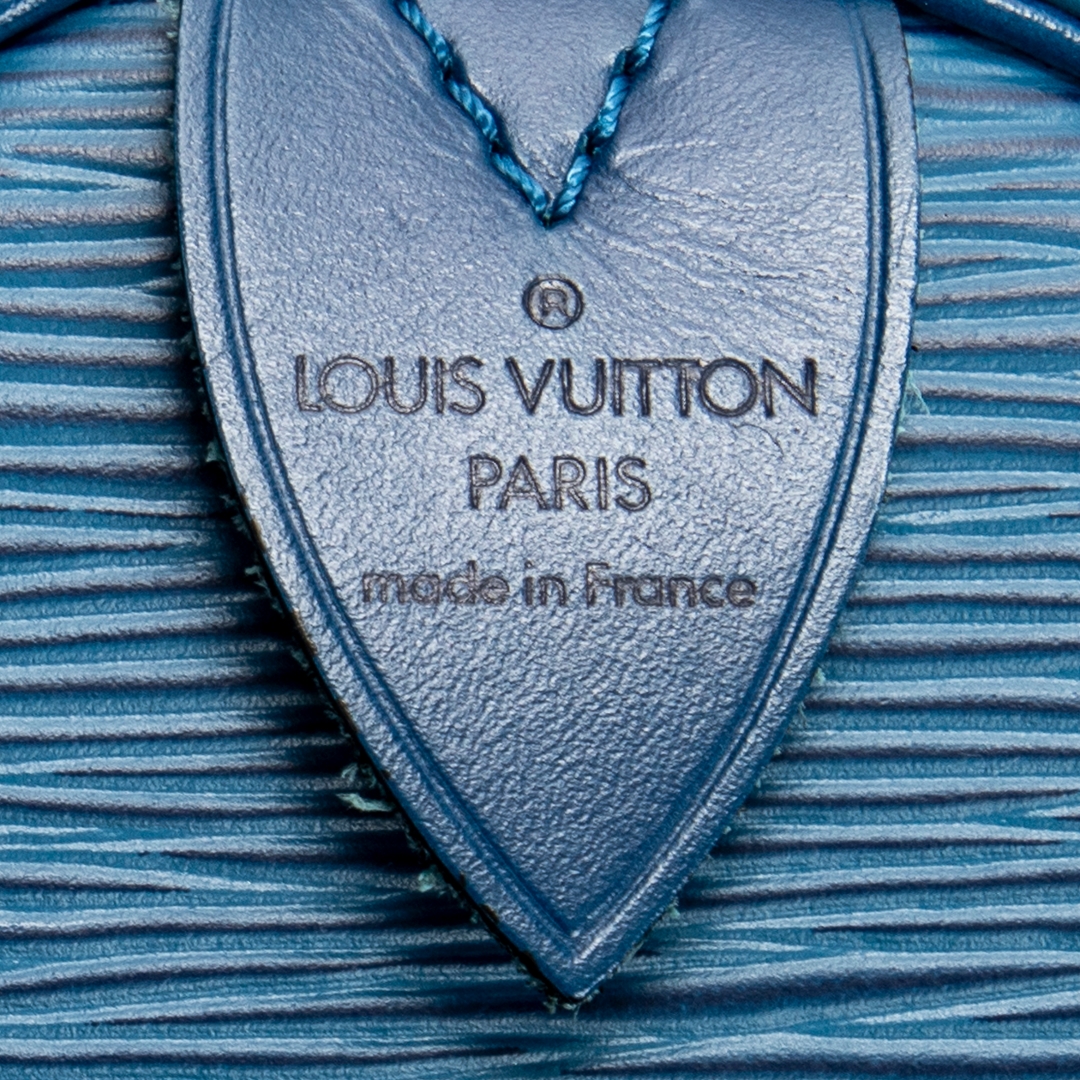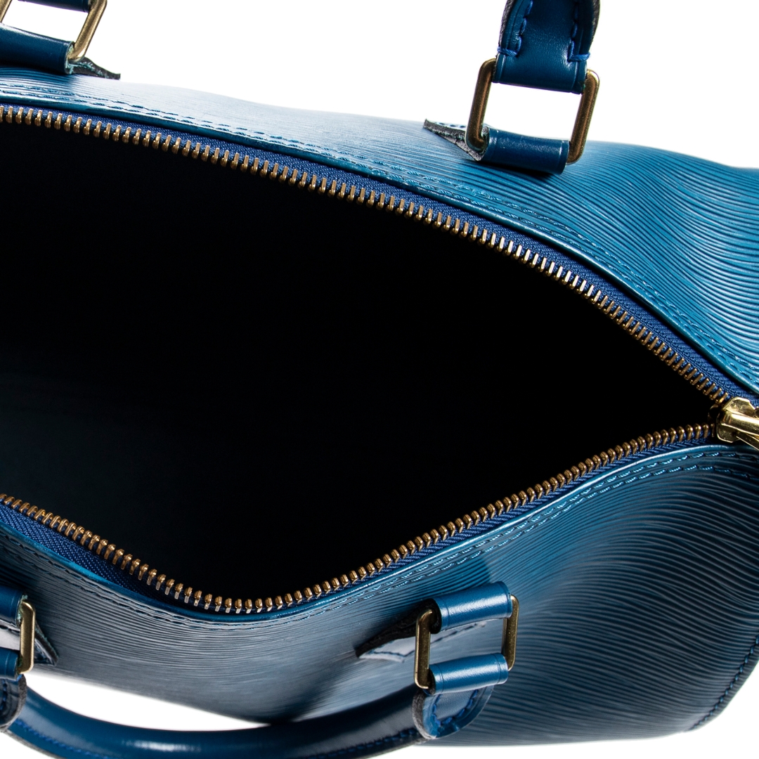A vintage Louis Vuitton blue calf leather Speedy bag with a certificate of authenticity, Approximately 22cm height, 32cm width.