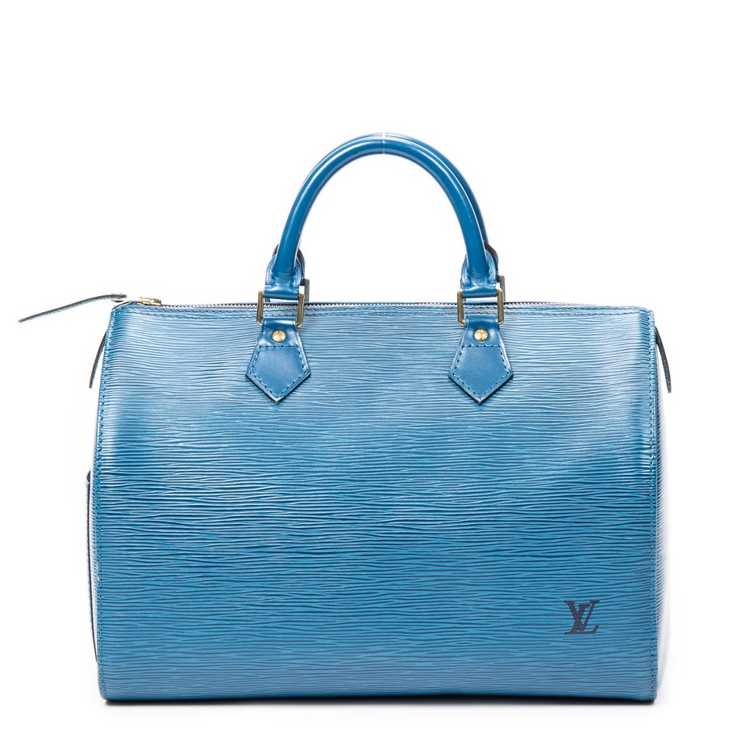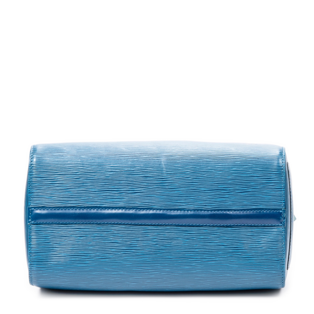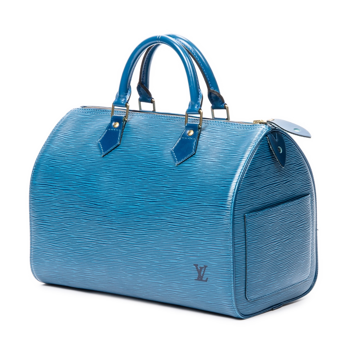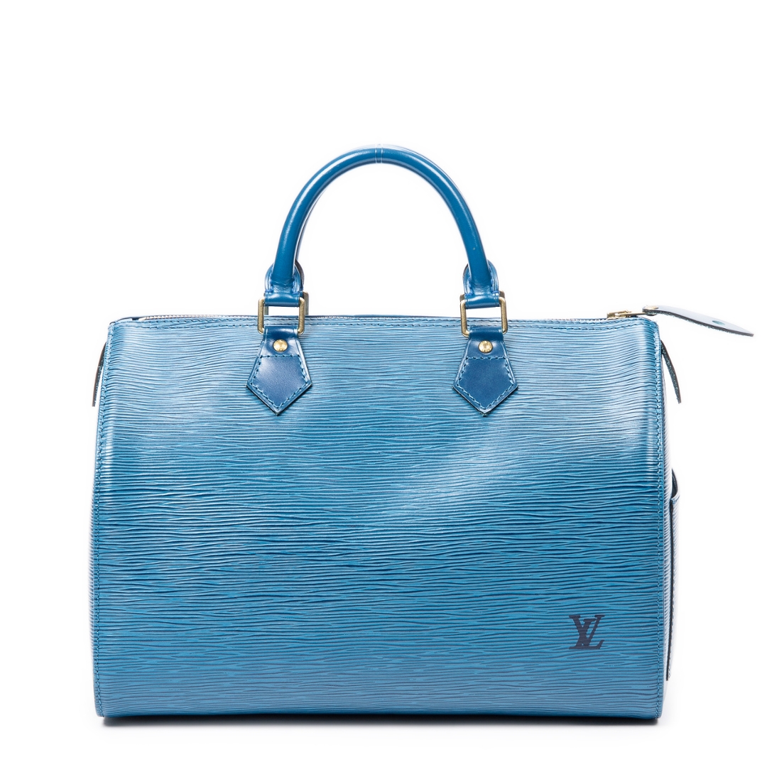 A vintage Louis Vuitton blue calf leather Speedy bag with a certificate of authenticity, Approximately 22cm height, 32cm width.