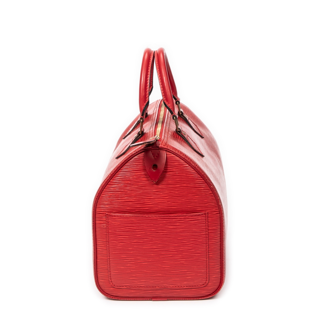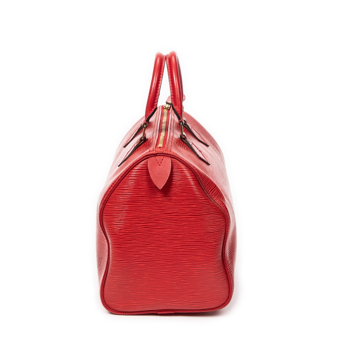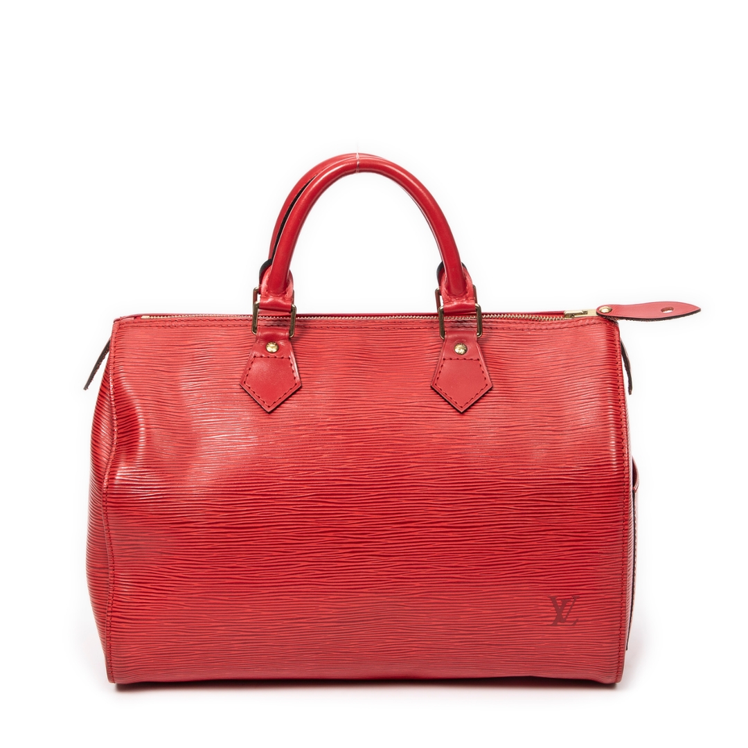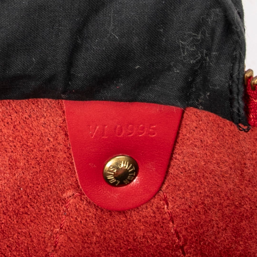 A vintage Louis Vuitton red calf leather Speedy bag with a certificate of authenticity. Approximately 22cm height, 32cm width.