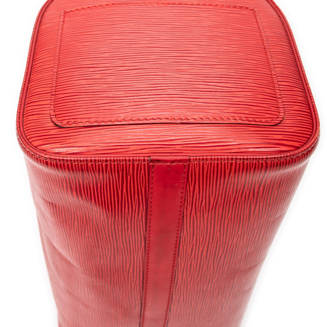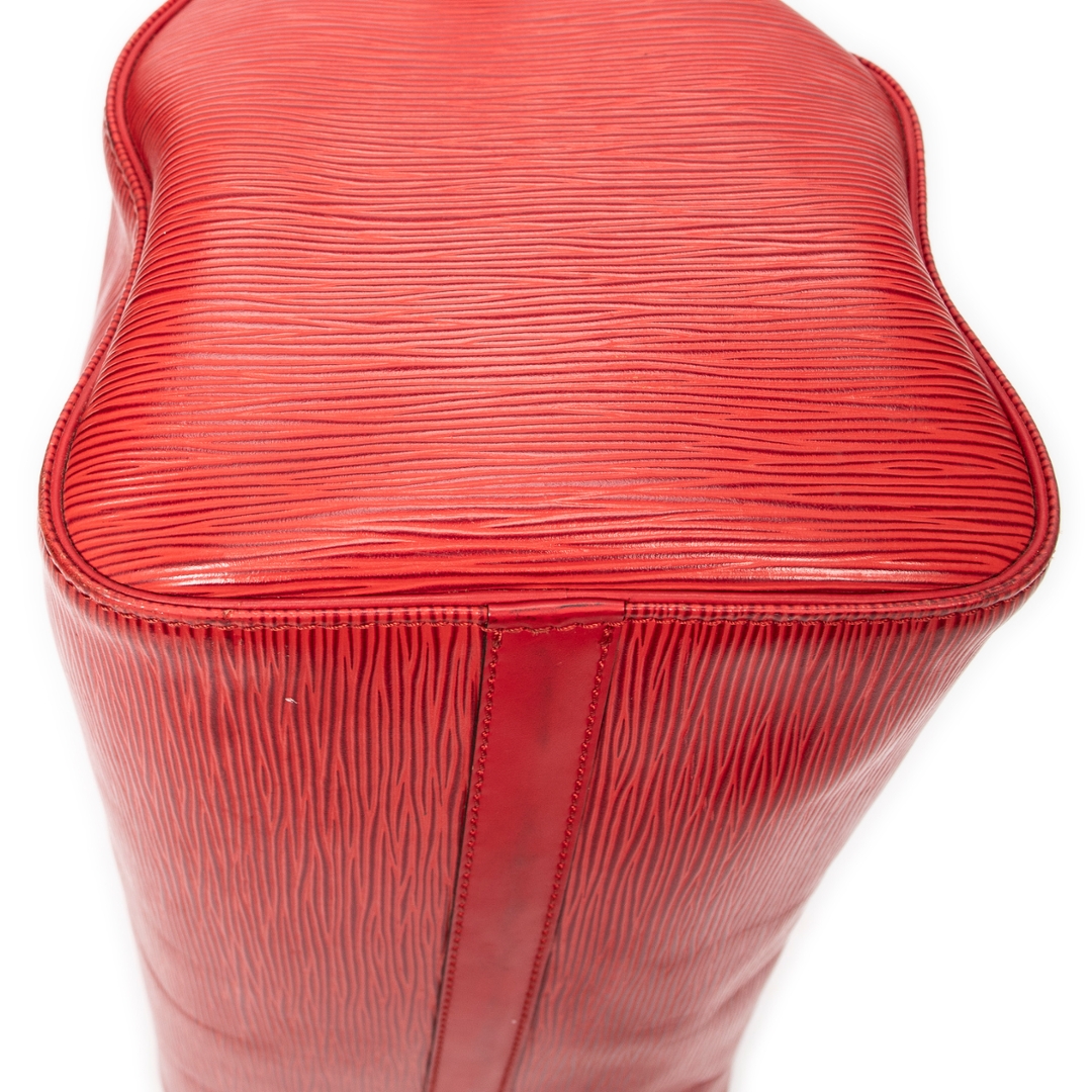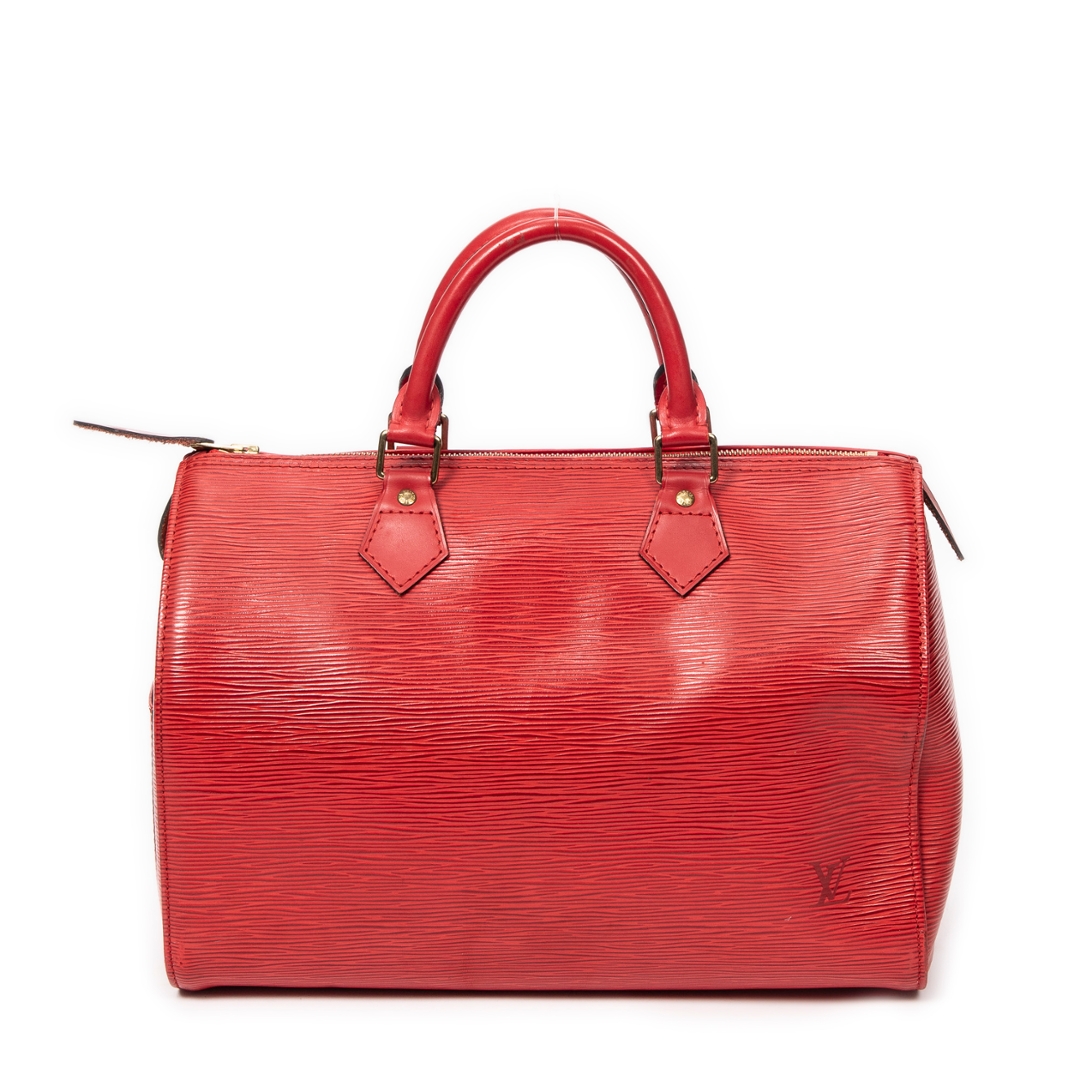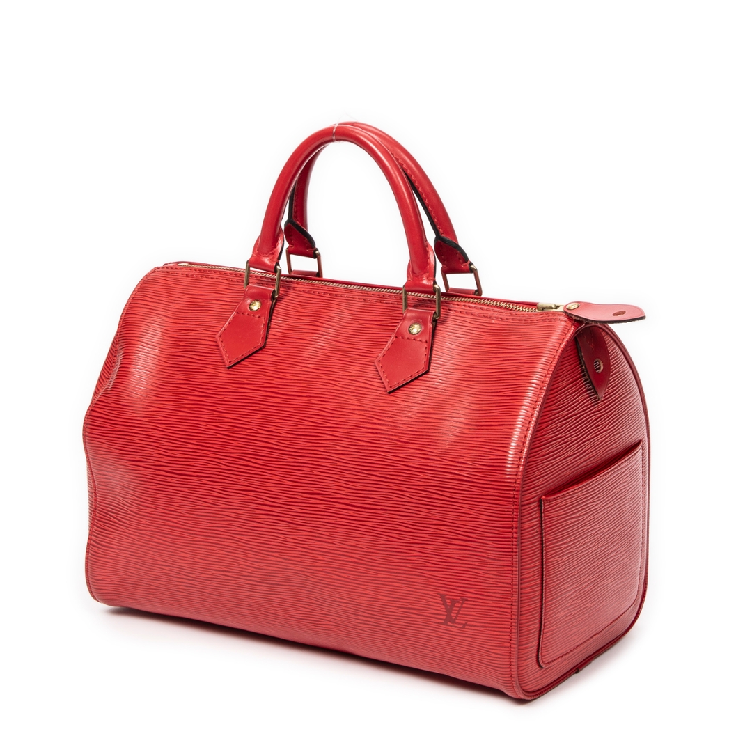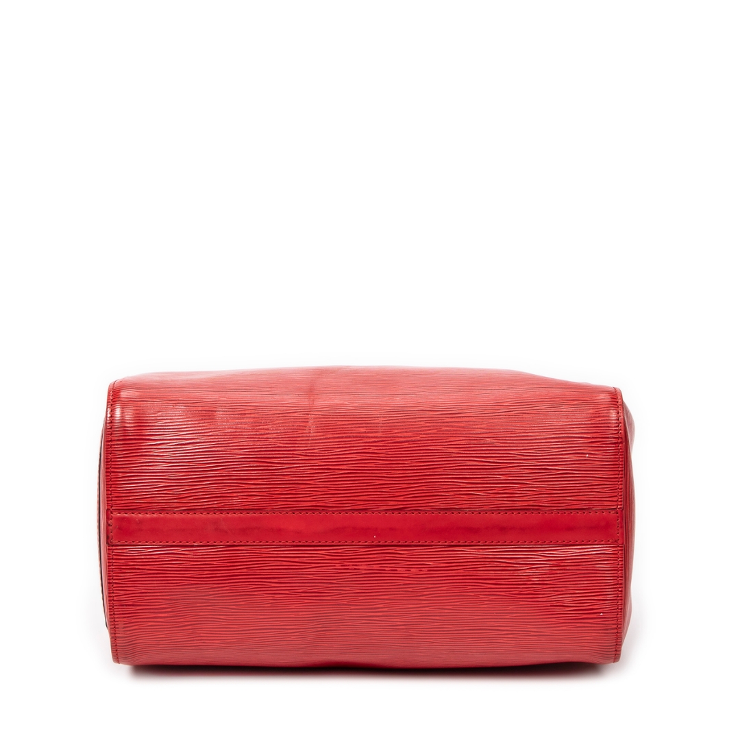 A vintage Louis Vuitton red calf leather Speedy bag with a certificate of authenticity. Approximately 22cm height, 32cm width.