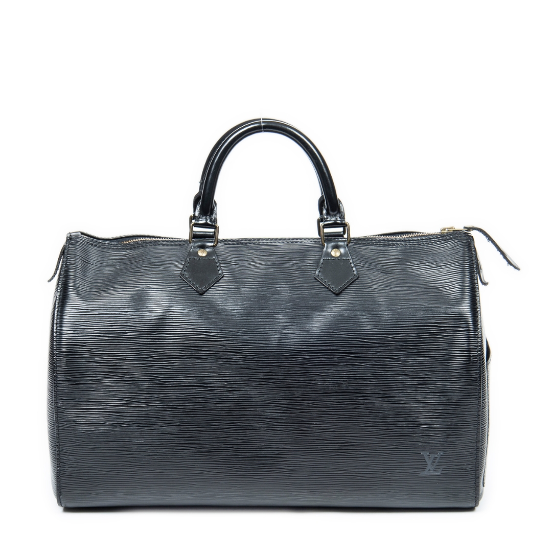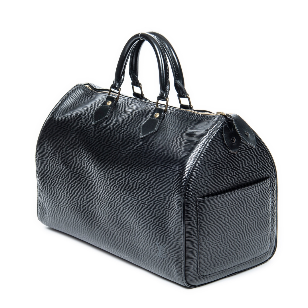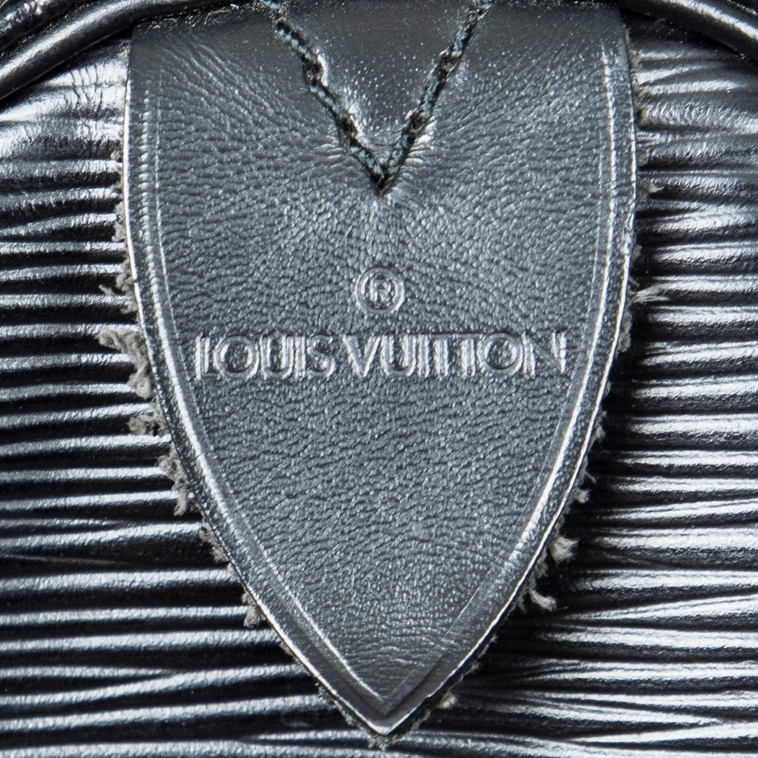 A vintage Louis Vuitton black calf leather Speedy bag with a certificate of authenticity, Approximately 24cm height, 37cm width.