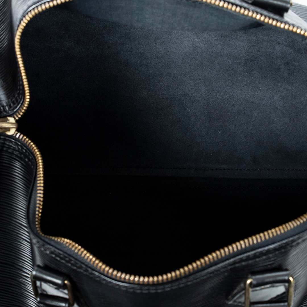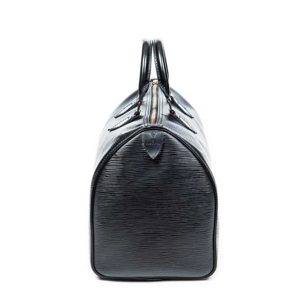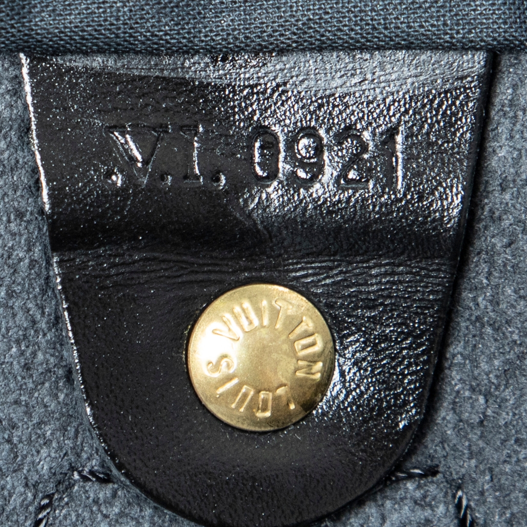 A vintage Louis Vuitton black calf leather Speedy bag with a certificate of authenticity, Approximately 24cm height, 37cm width.