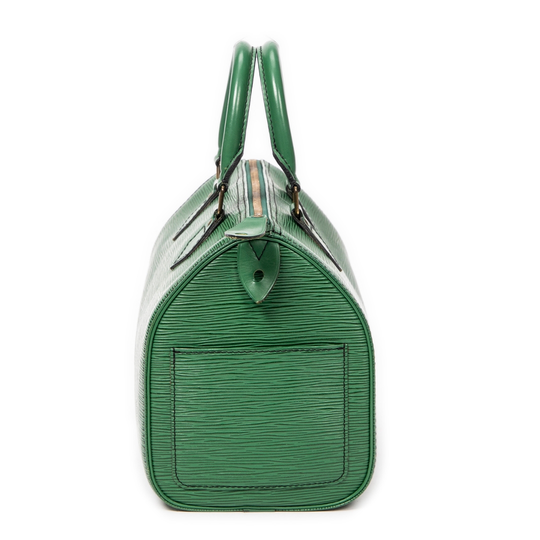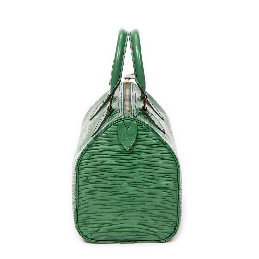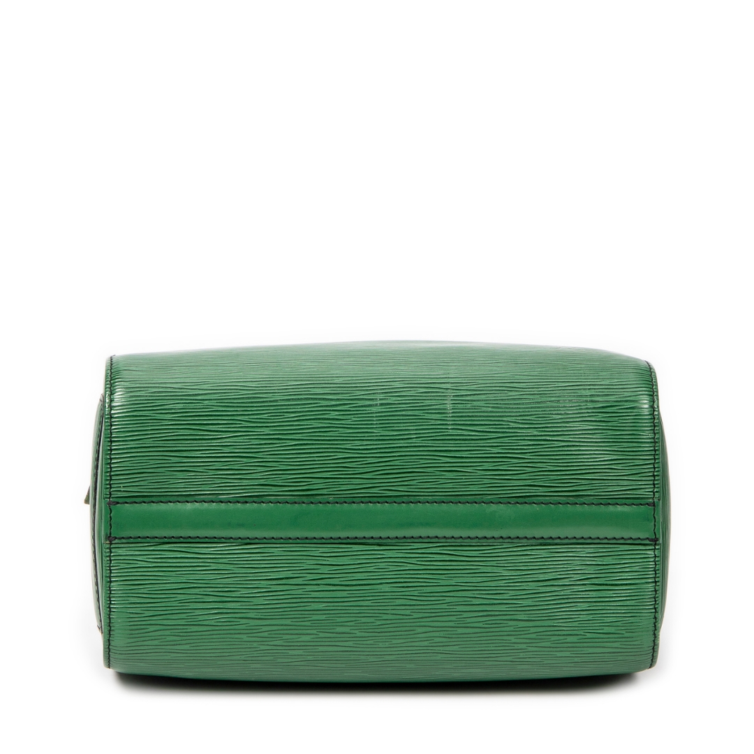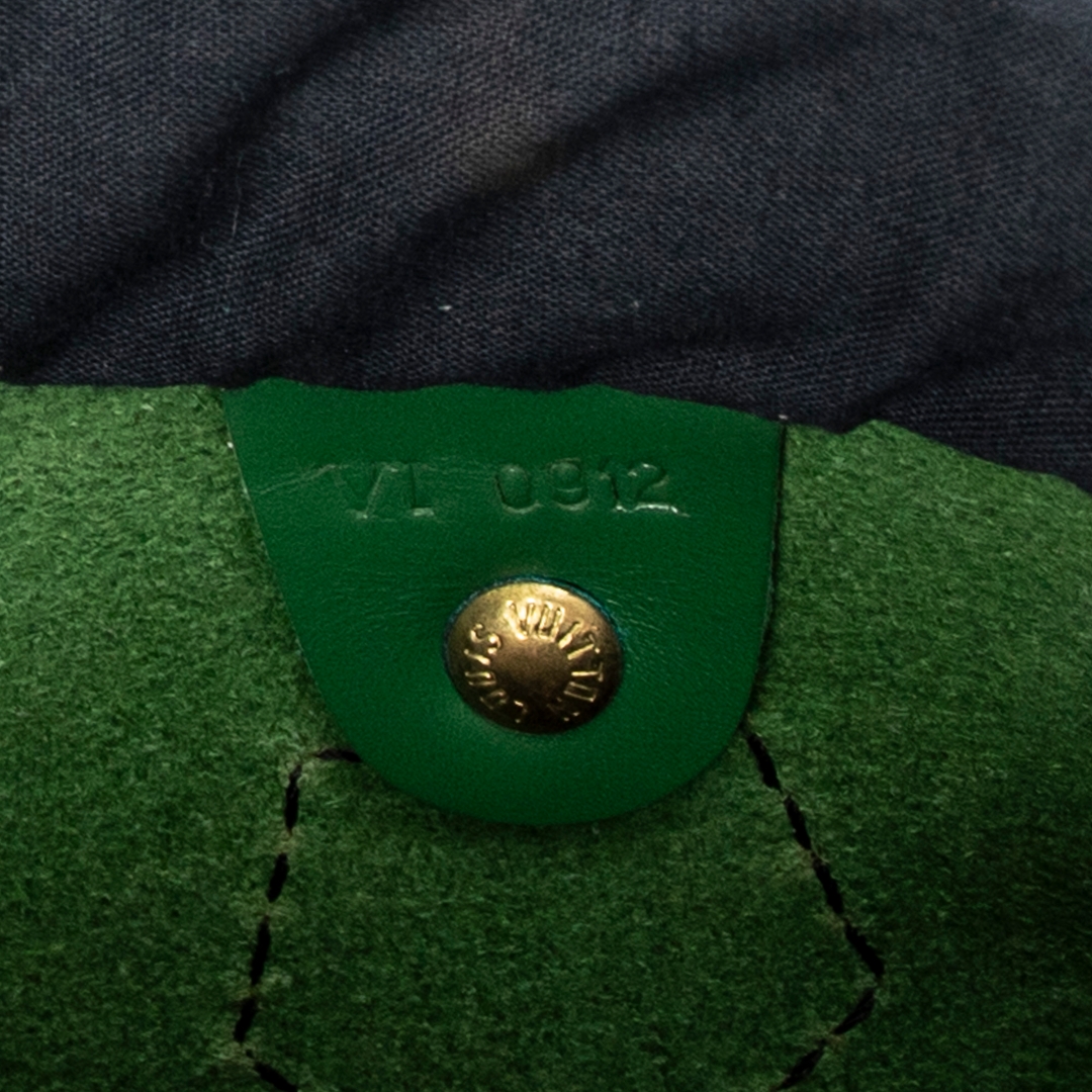 A vintage Louis Vuitton green calf leather Speedy Black Stitching bag with a certificate of authenticity, Approximately 19cm height, 27cm width.