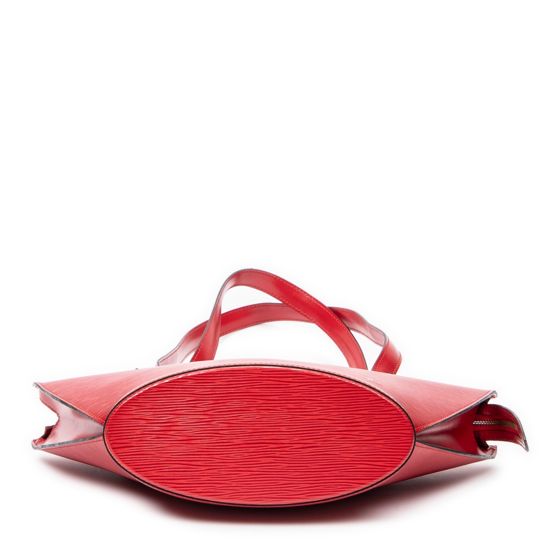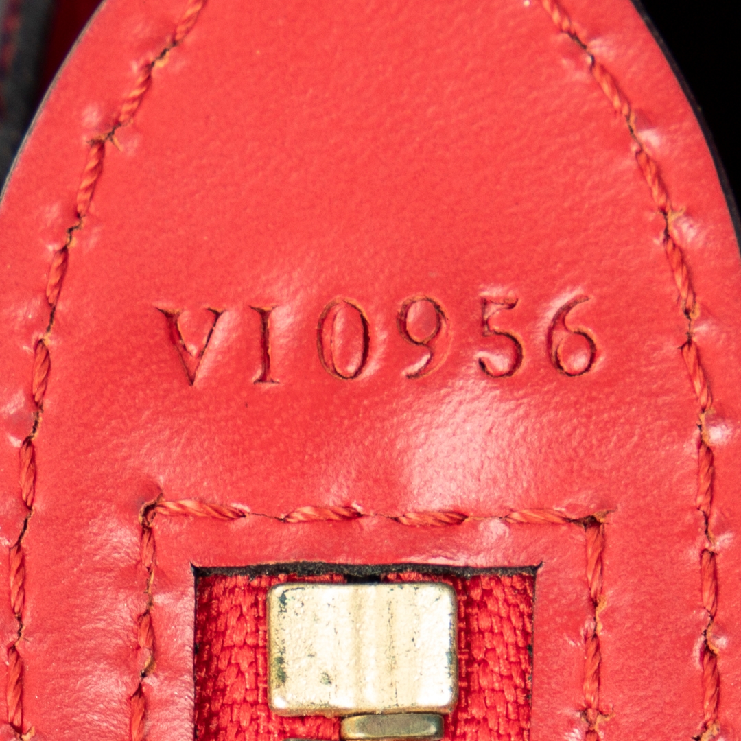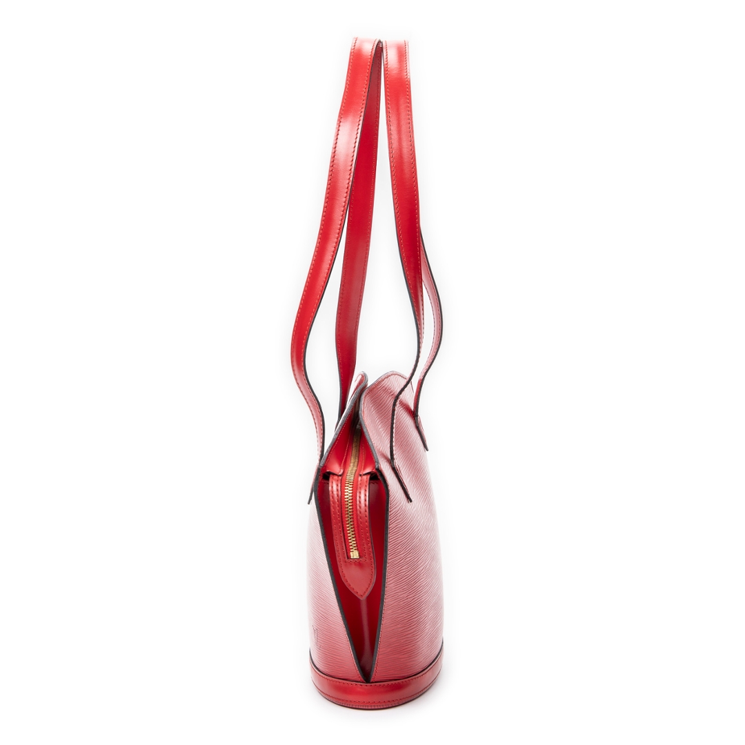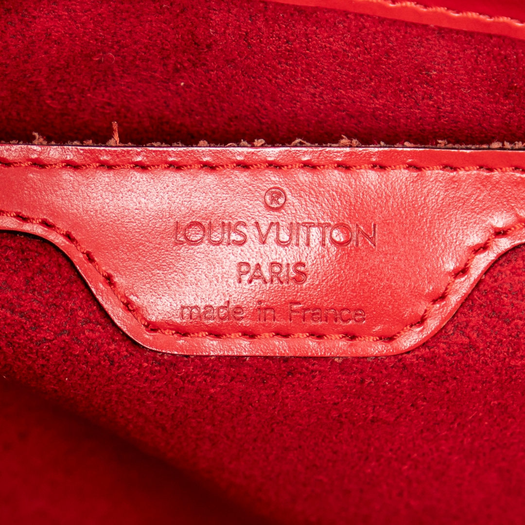 A vintage Louis Vuitton red calf leather St-Jacques Long Straps bag with a certificate of authenticity. Approximately 24cm height, 23cm width.