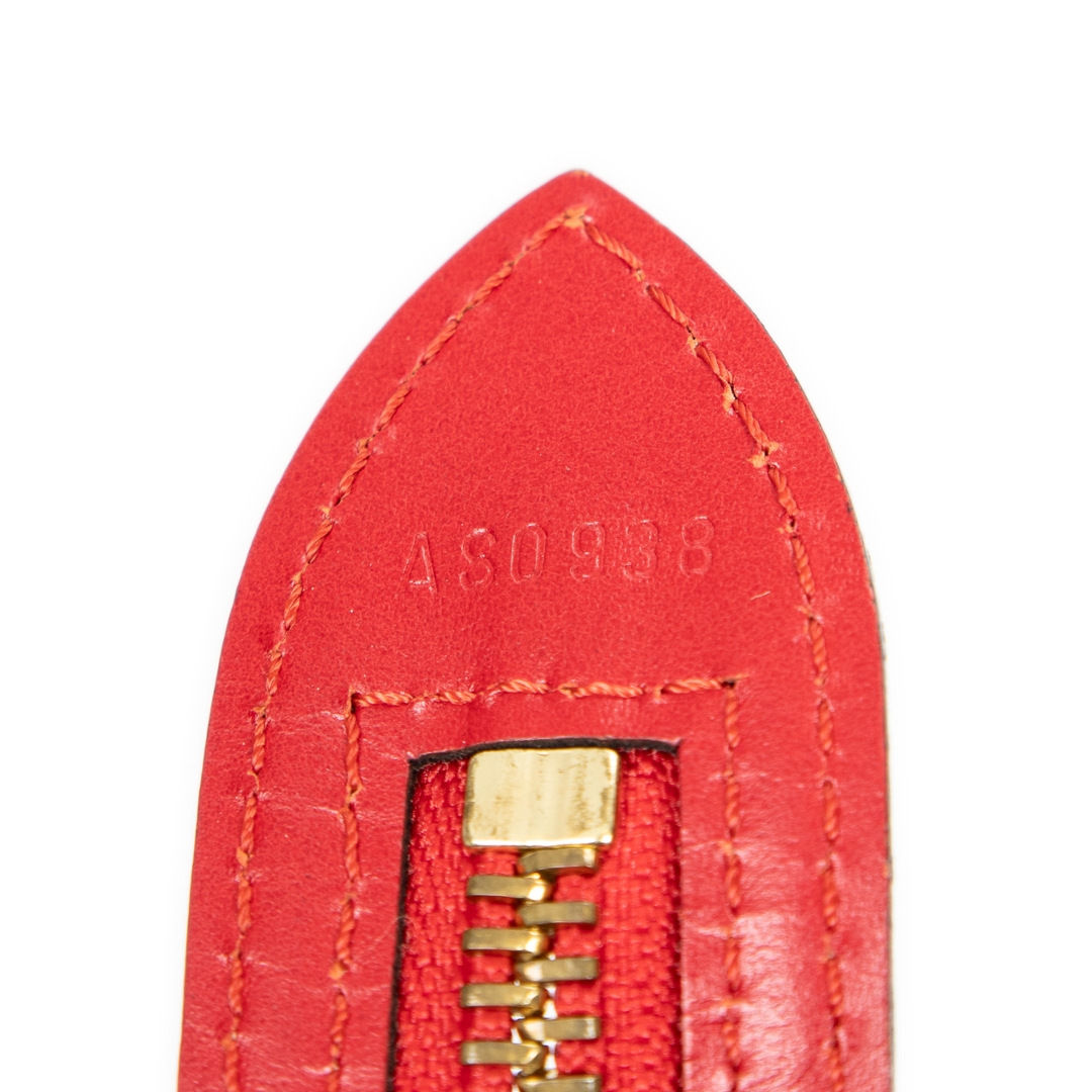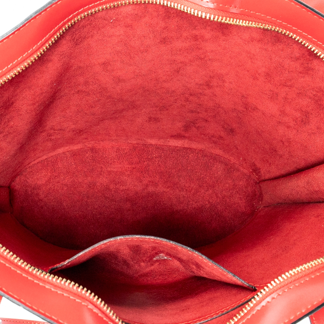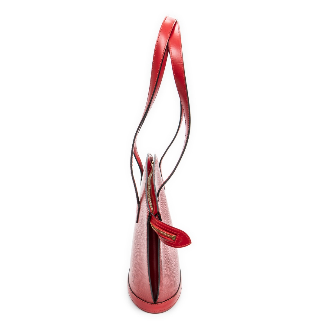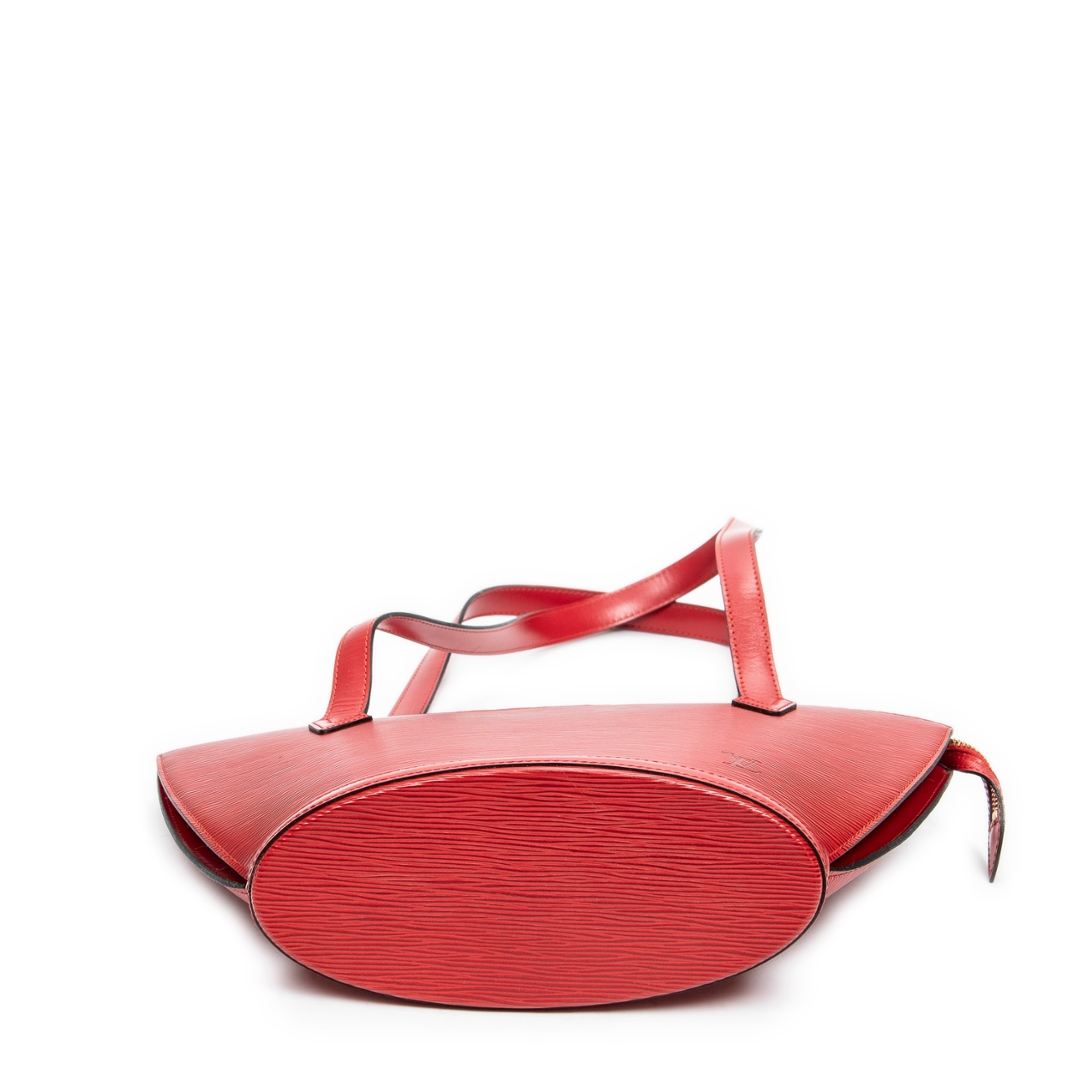 A vintage Louis Vuitton red calf leather St-Jacques Long Straps bag with a certificate of authenticity, Approximately 24cm height, 23cm width.
