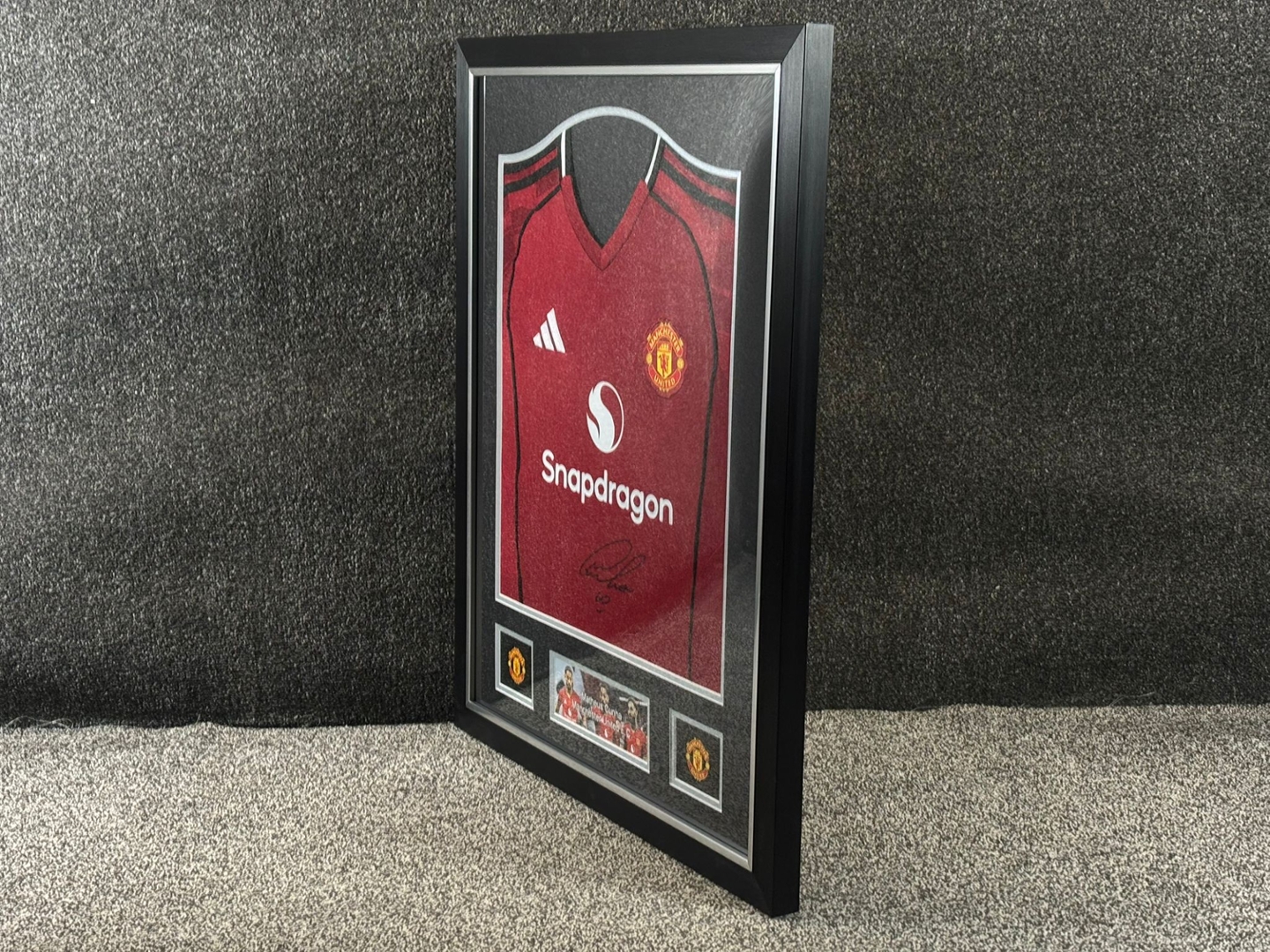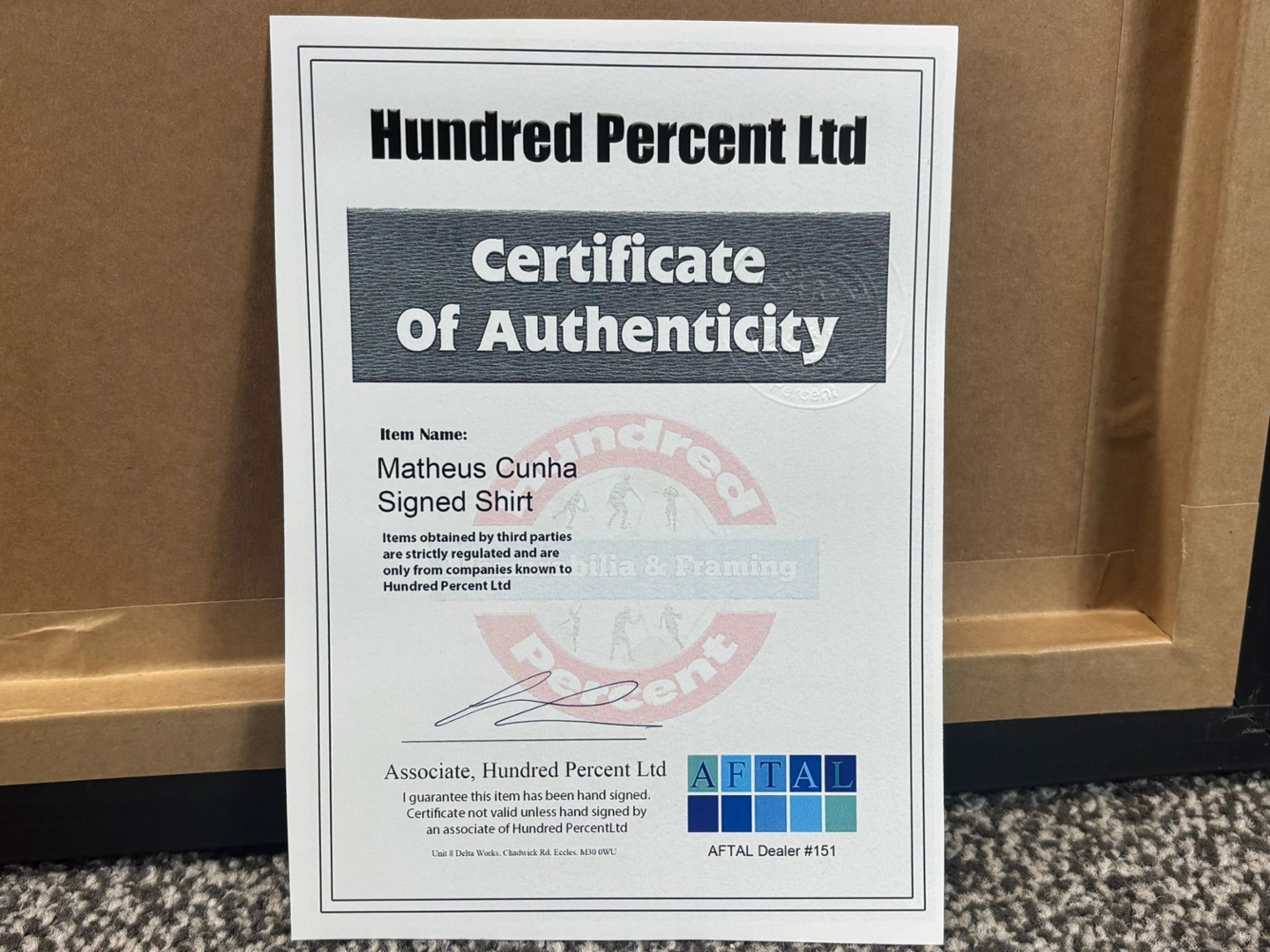 A signed and authenticated Matheus Cunha Man United Football Shirt in a presentation frame. Approx 83cm height, 68cm width.
