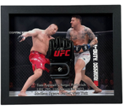 Set within a sleek presentation frame equipped with illuminating LED lights, these boxing shorts become a focal point in any setting. The dynamic lighting enhances the visual impact, drawing attention to the intricate details of the garment and accentuating its significance as a collector's item.