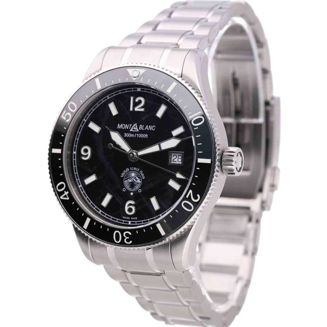 A Montblanc 1858 Iced Sea Automatic Date reference 129372 is presented in stainless steel with a 41mm case, paired with a matching steel bracelet. The watch features a black glacier-pattern dial inspired by the Mer de Glace, with luminous Arabic numerals and hands for clear legibility. A unidirectional black ceramic bezel frames the dial, reinforcing its professional dive-watch credentials, while the date display is neatly positioned at 3 o’clock.