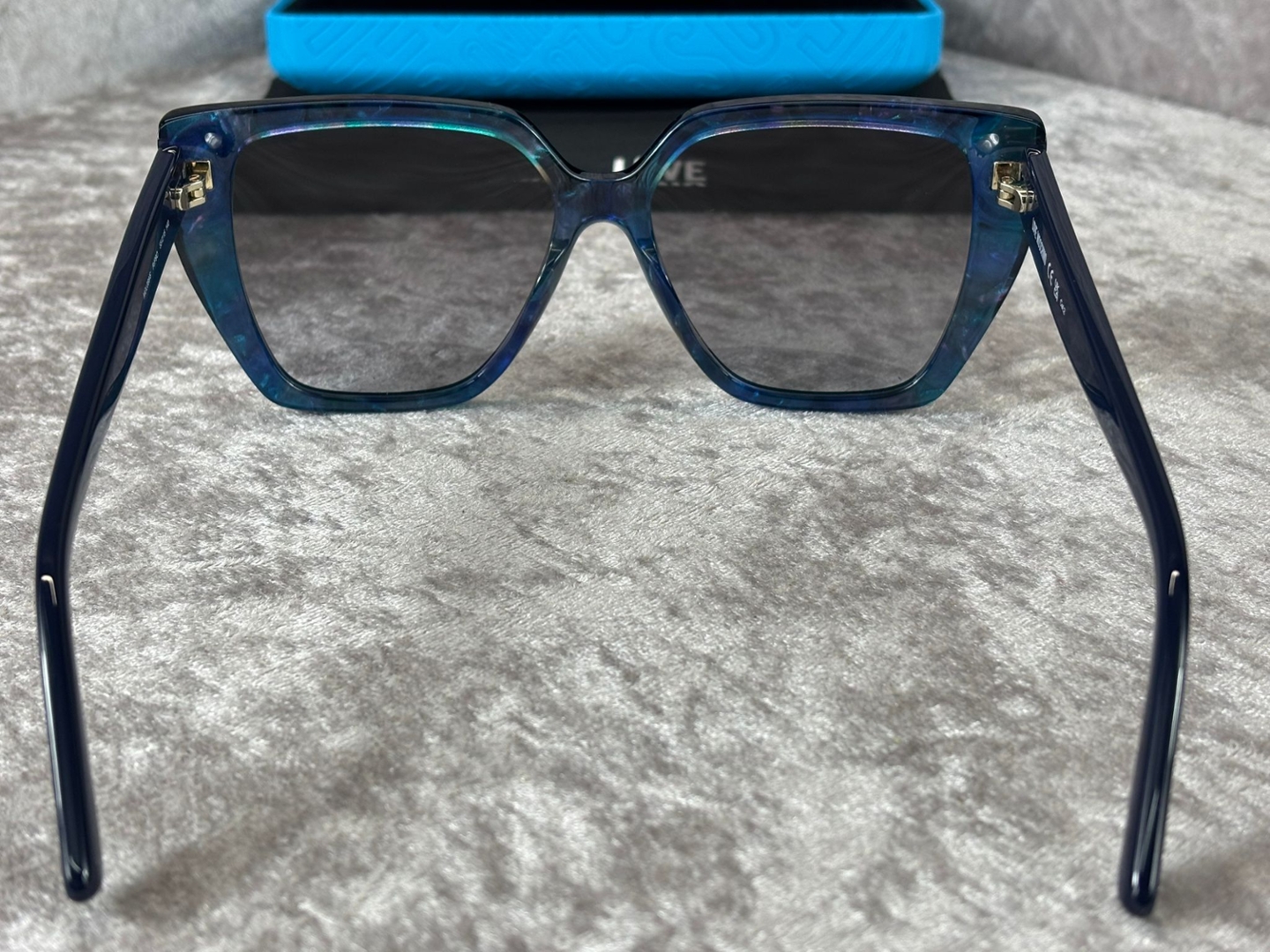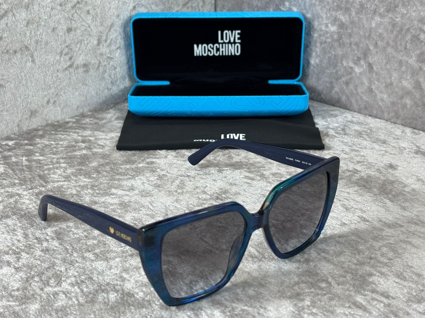 A Brand new, unused pair of Moschino Rectangular - Blue Sunglasses.