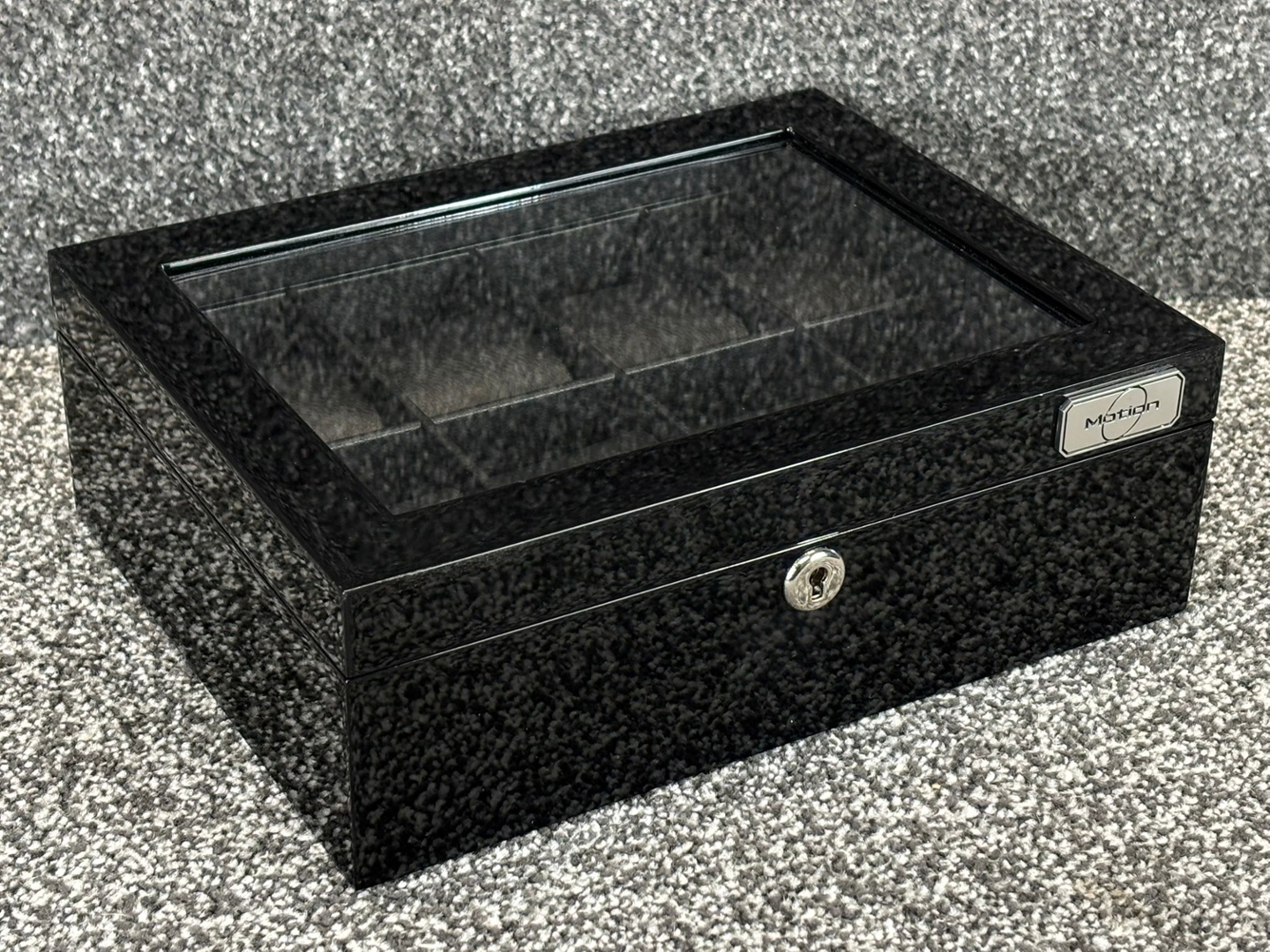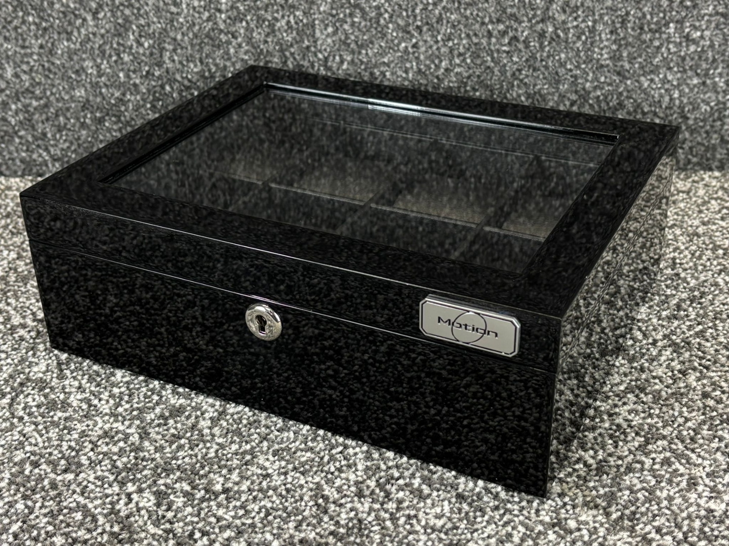 A Motion 8 Compartment Black Wooden Piano Finish Watch Box, designed to present and protect a curated watch collection with understated elegance. The exterior features a deep black piano finish with a clear glass display lid, allowing the contents to be admired at a glance while remaining securely housed. Clean lines and a compact profile give the piece a refined, modern presence suitable for both contemporary and classic interiors.