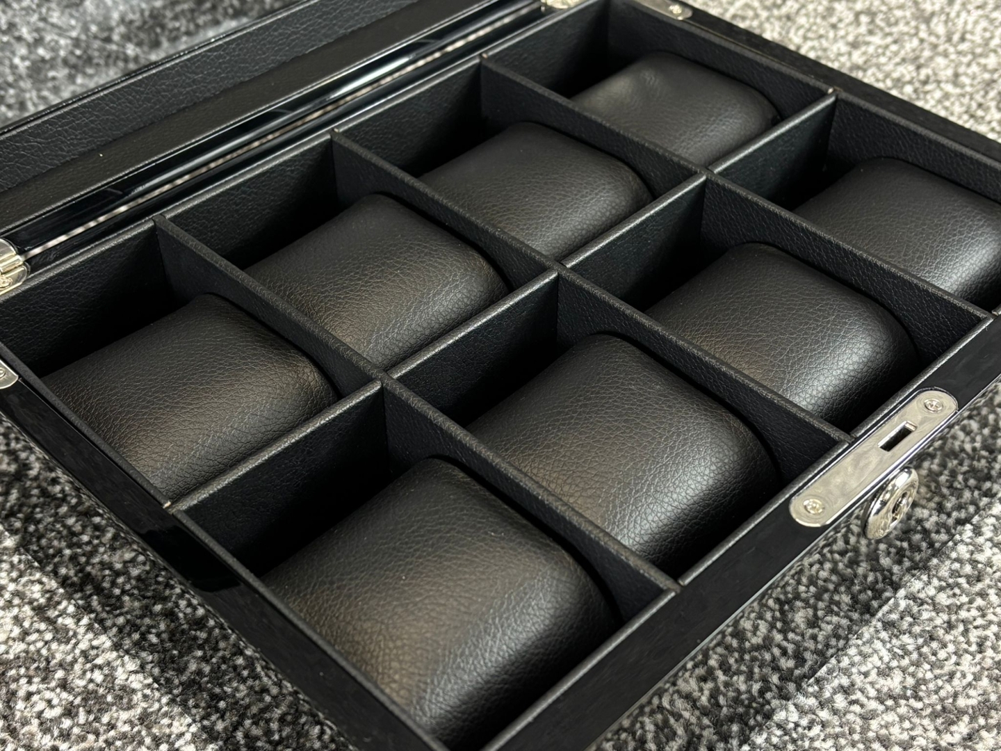 Measuring approximately 9cm in height, 27cm in width and 21cm in depth, this watch box offers generous capacity without excessive footprint. A practical and visually striking storage solution, perfectly suited to collectors seeking both protection and presentation.