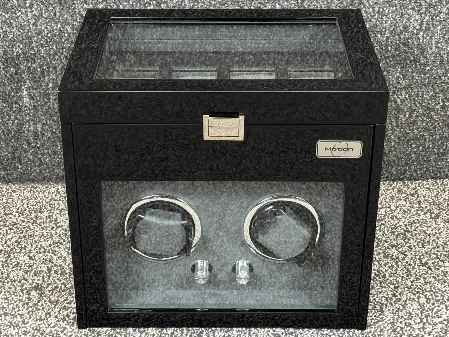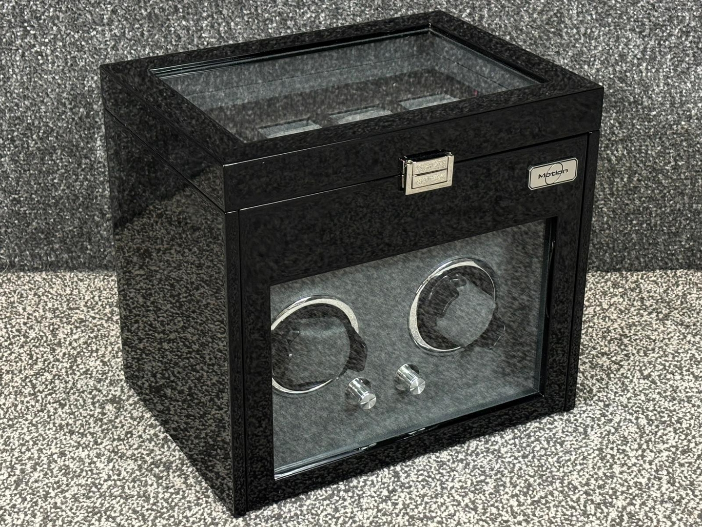 A Motion Double Black Wooden Piano Finish Watch Winder, comprising a four watch storage compartment at the top & with a black leather & grey suede interior. Approx 27cm height, 30cm width, 22cm depth.