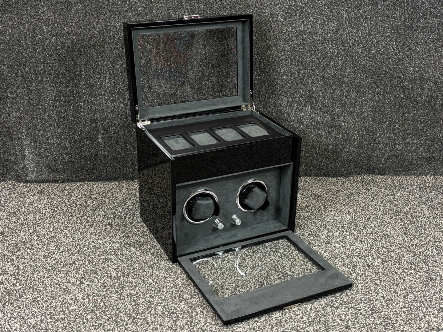 Opening the lid reveals a soft grey suede interior, providing a gentle and protective environment for your watches. With dimensions of approximately 27cm in height, 30cm in width, and 22cm in depth, it offers ample space while maintaining a compact footprint.