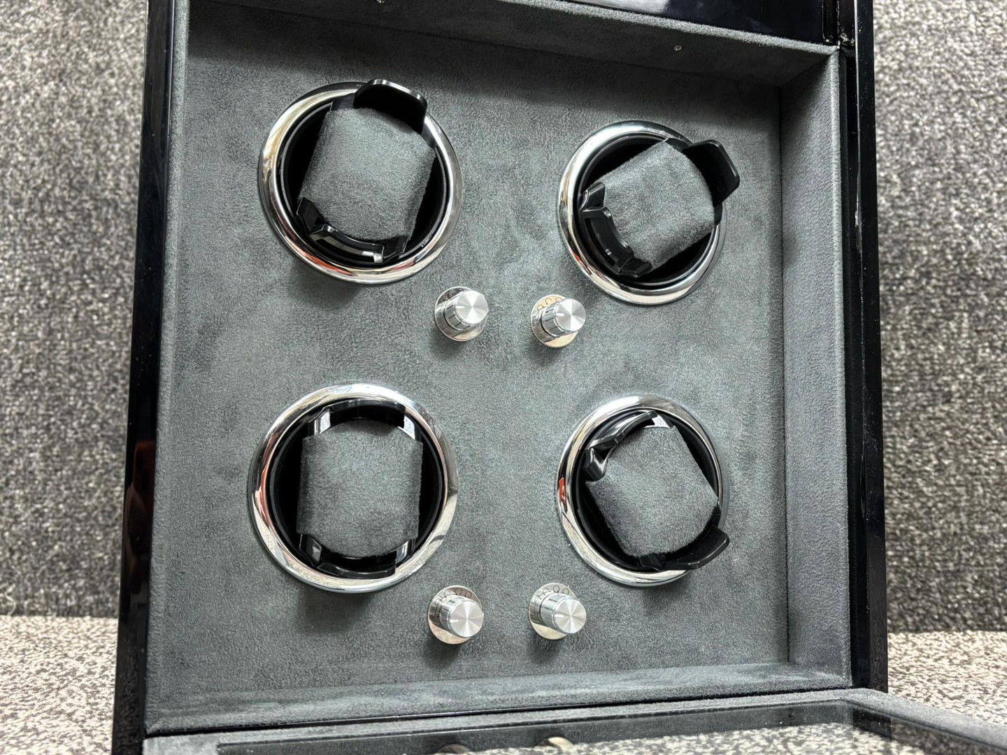 A Motion Quad Black Wooden Piano Finish Watch Winder, comprising a four watch storage compartment on top & with a black leather & grey suede interior. Approx 38cm height, 30cm width, 22cm depth.