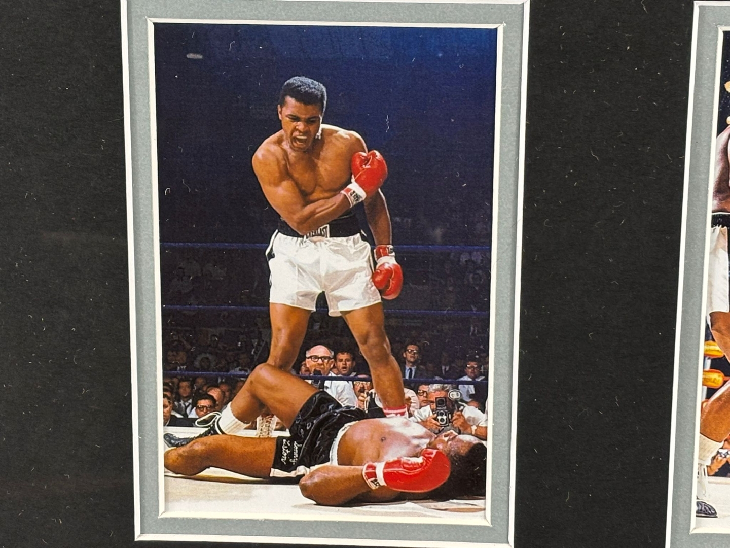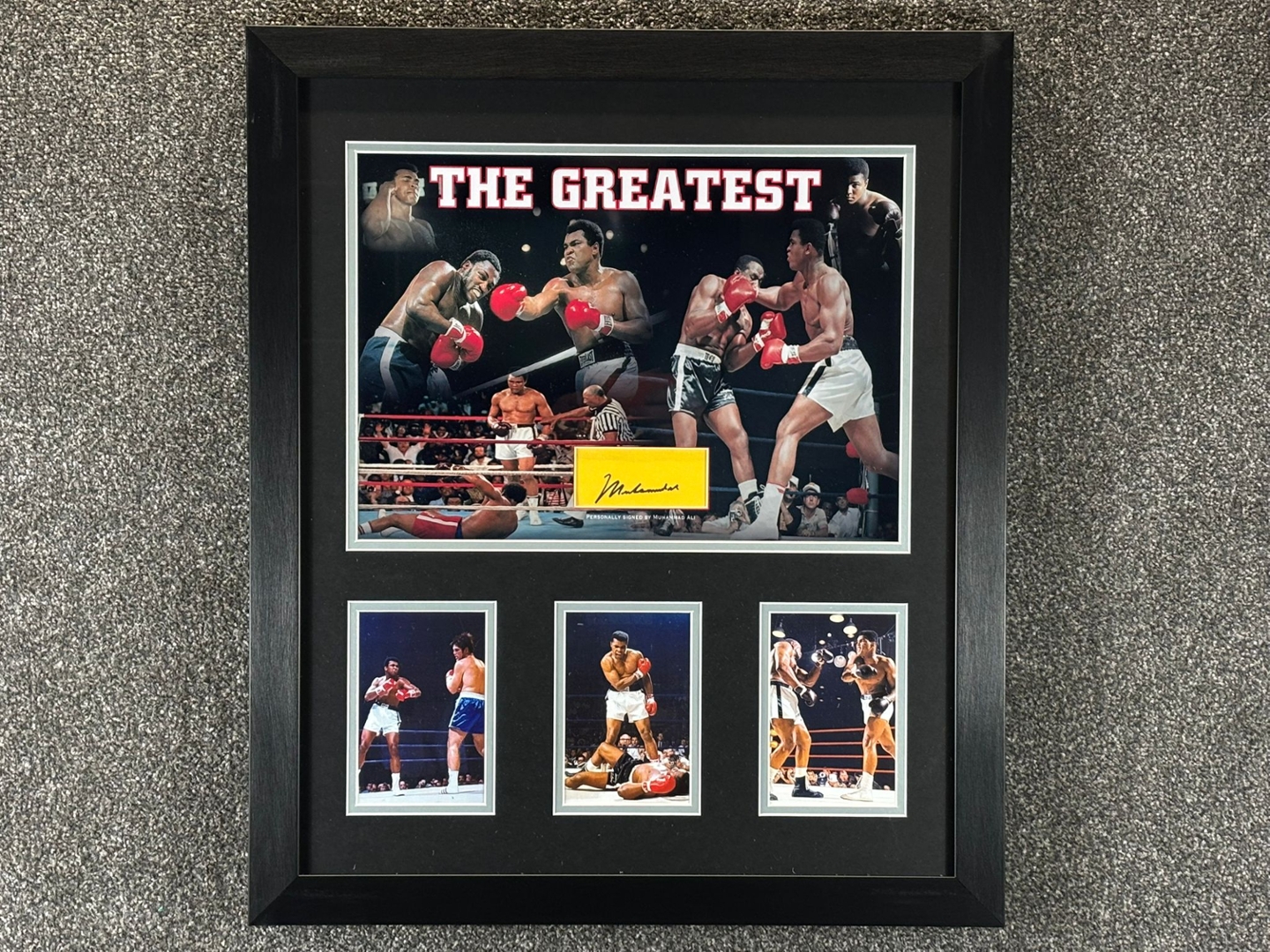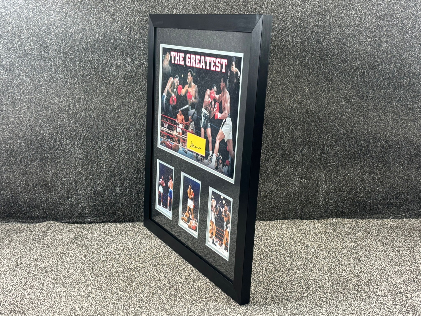 The montage is complemented by three additional action photographs beneath, each showcasing iconic moments from Ali’s legendary career. The smart double-mounting and bold black frame work together to highlight the imagery, ensuring strong visual contrast and a professional finish suited to any display environment.