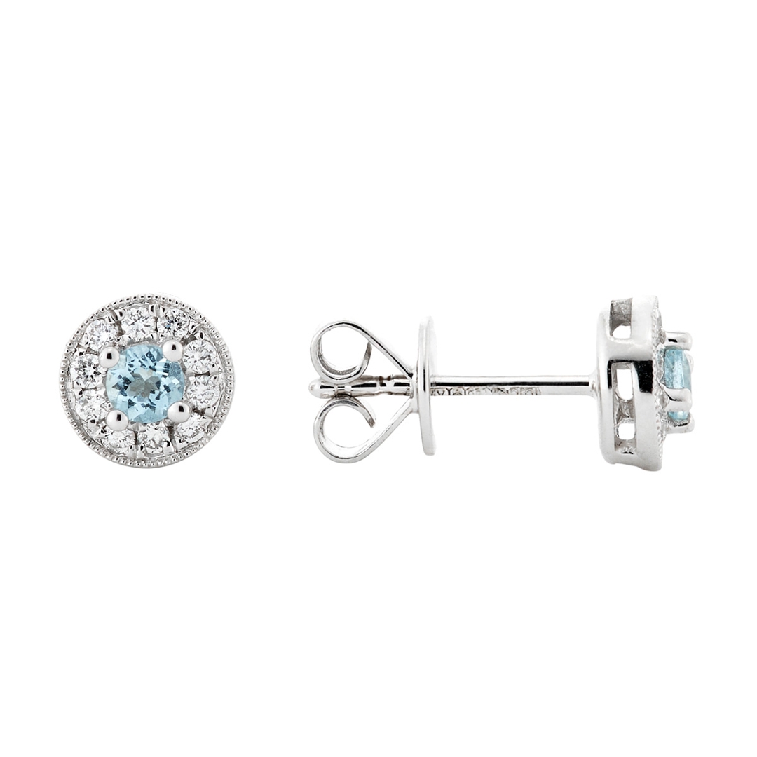 A brand-new, unused, certified pair of 18ct white gold natural diamond and aquamarine round-shaped cluster earrings, these delicate and refined pieces radiate soft elegance and timeless charm. At the centre of each earring is a round step-cut aquamarine, totalling 0.21ct, displaying a gentle pale blue hue that evokes calm, clarity, and understated sophistication.