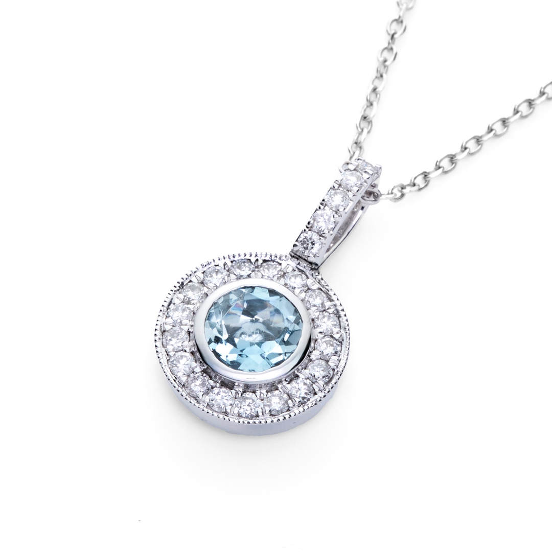A brand-new, unused, certified natural diamond & aquamarine round-shaped cluster pendant, with one round mixed-cut aquamarine gemstone at the centre & a cluster of brilliant-cut diamonds in a halo setting, in 18ct white gold.