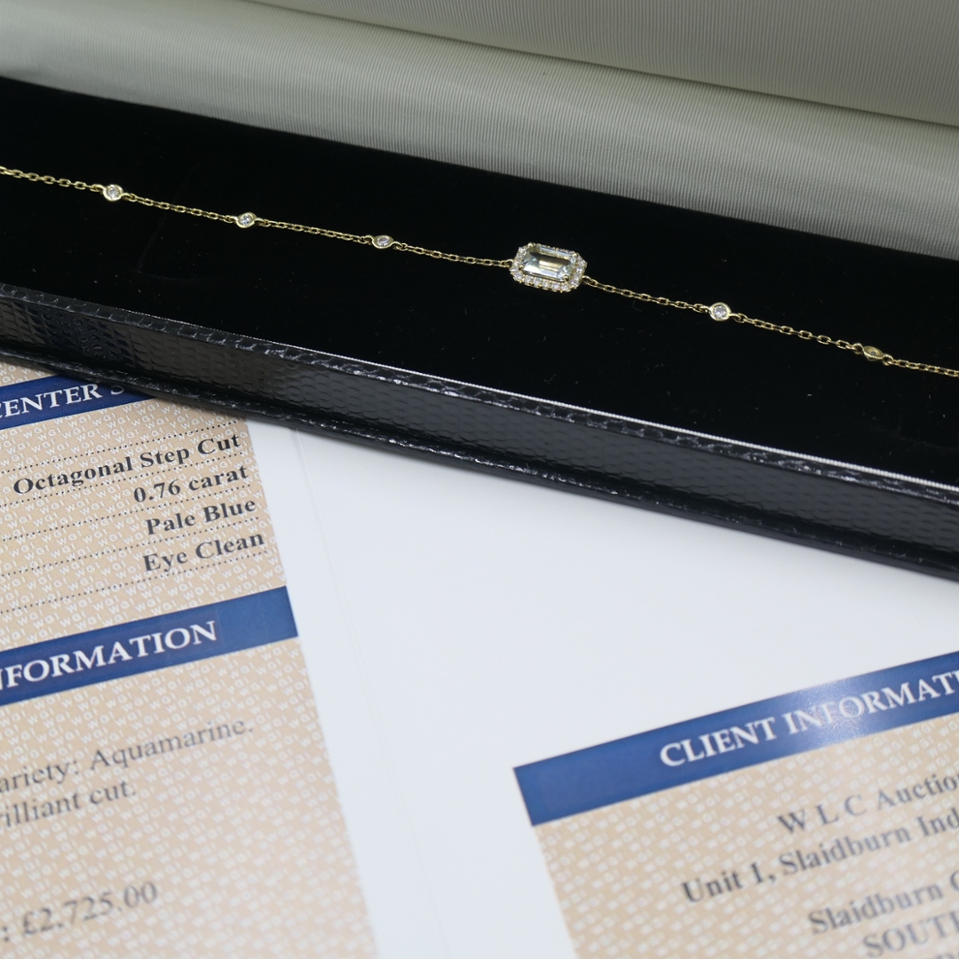 A brand-new, unused, certified 18ct yellow gold natural diamond and aquamarine chain bracelet, designed with refined elegance and timeless appeal. At the centre lies a 0.76ct octagonal step-cut aquamarine, with its pale blue tones offering a serene, captivating brilliance. This striking gemstone is beautifully complemented by 0.34ct of round brilliant-cut diamonds, graded F–G for colour and SI1–SI2 for clarity, set delicately along the chain to enhance the bracelet’s sophisticated sparkle against the warmth of the yellow gold.