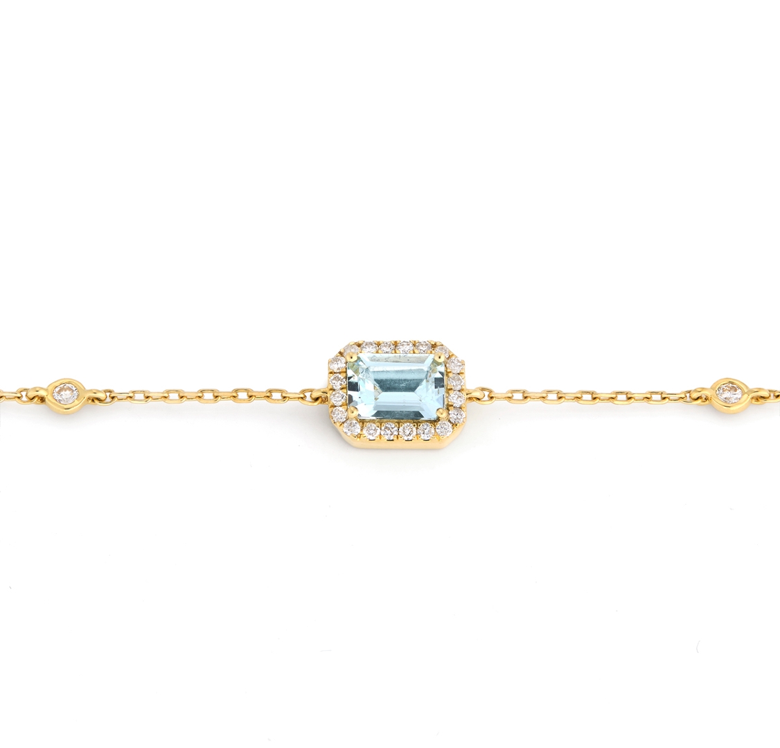 A brand-new, unused, certified natural diamond & aquamarine chain bracelet, set with one octagonal step cut aquamarine gemstone & a cluster of brilliant-cut diamonds, set in 18ct yellow gold.