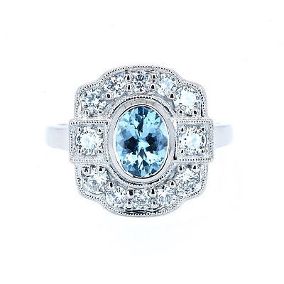 A brand-new, unused, certified natural diamond & aquamarine flower-shaped cluster ring, set with one oval-cut aquamarine gemstone at the centre & a cluster of brilliant-cut diamonds in a halo setting, set in platinum.