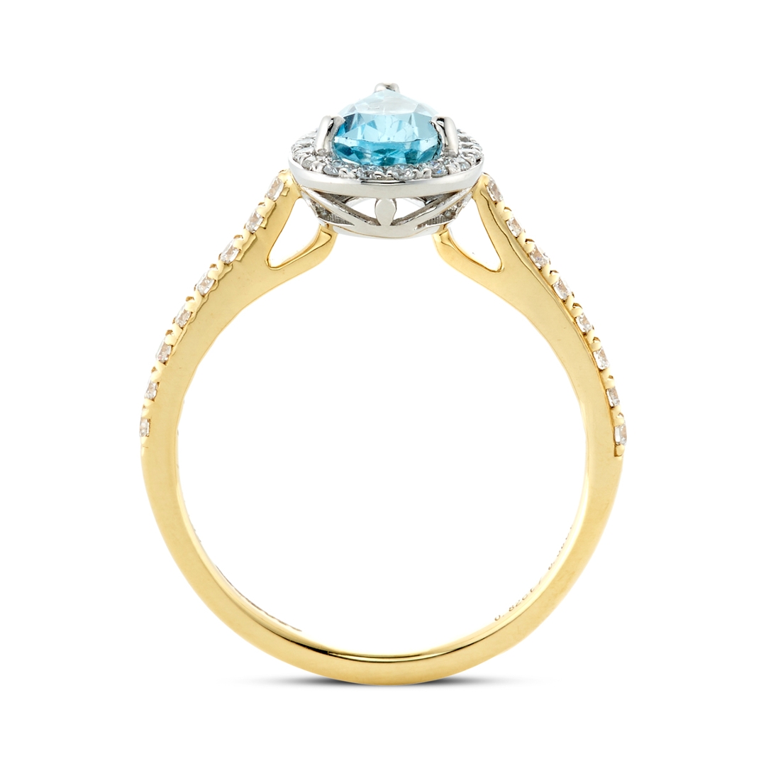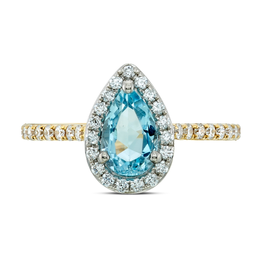 A brand-new, unused, certified natural diamond & aquamarine pear-shaped cluster ring, with one pear mixed-cut aquamarine gemstone to the centre & a cluster of brilliant-cut diamonds in a halo setting & to the shoulders, set in platinum & 18ct Yellow Gold.