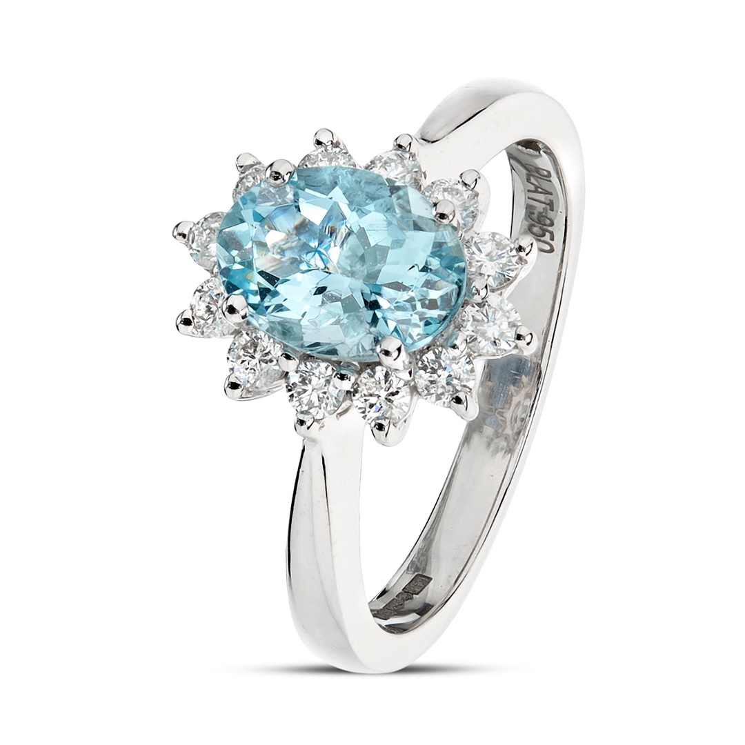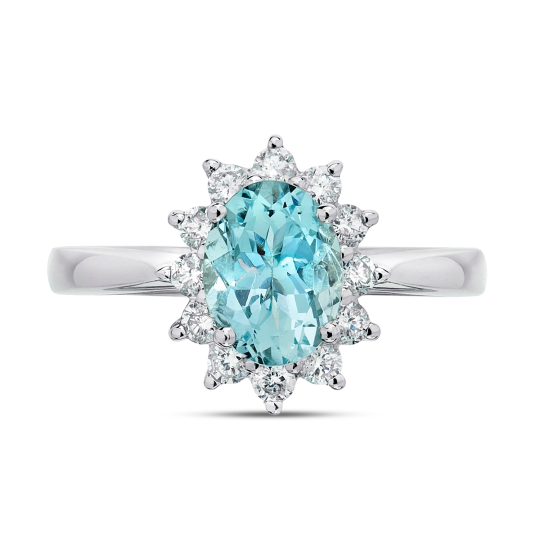 A brand-new, unused, certified natural diamond & aquamarine gemstone cluster ring, set with one oval-cut aquamarine stone to the centre & a cluster of brilliant-cut diamonds in a halo setting, set in platinum.