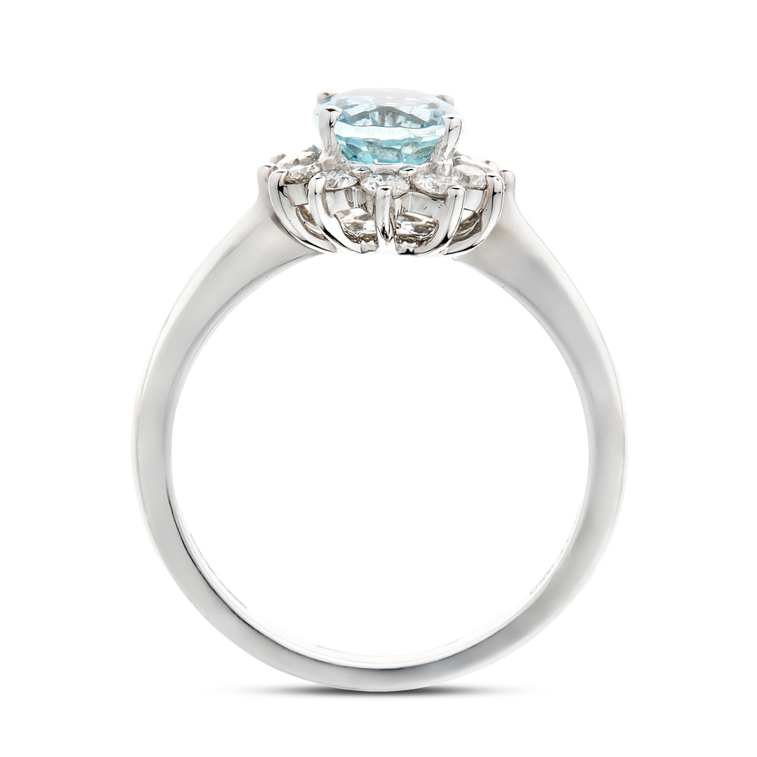 Crafted in platinum, the ring features a luxurious, durable setting ideal for showcasing high-quality gemstones. Platinum's naturally white lustre enhances the diamonds' brightness and the aquamarine's vibrancy, creating a timeless, elegant appeal. The halo setting and the ring's fine craftsmanship maximise light reflection, ensuring the gemstones sparkle with every movement.