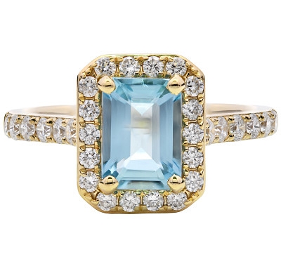 A brand-new, unused certified 18ct yellow gold ring showcasing a 0.90ct emerald-cut aquamarine gemstone at its centre, surrounded by a dazzling halo of natural brilliant-cut diamonds and extending to the shoulders with a total diamond weight of 0.46ct. The aquamarine’s delicate sky-blue tone exudes an air of calm sophistication, its crisp facets reflecting beautifully against the warmth of the yellow gold setting. Each natural diamond enhances the gem’s serene brilliance, creating a piece that is both radiant and refined.